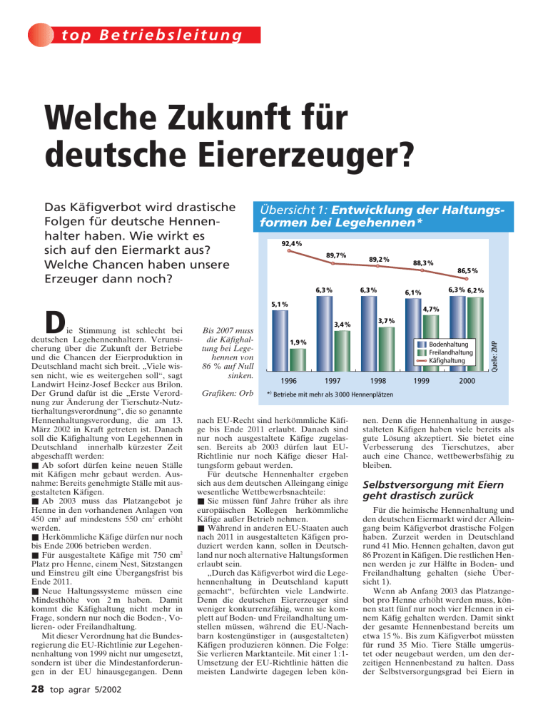 top Betriebsleitung Welche Zukunft für deutsche Eiererzeuger? Übersicht 1: Entwicklung der Haltungsformen bei Legehennen* 92,4% 89,7% 89,2% 86,5% 6,3% 6,3% ie Stimmung ist schlecht bei deutschen Legehennenhaltern. Verunsicherung über die Zukunft der Betriebe und die Chancen der Eierproduktion in Deutschland macht sich breit. „Viele wissen nicht, wie es weitergehen soll“, sagt Landwirt Heinz-Josef Becker aus Brilon. Der Grund dafür ist die „Erste Verordnung zur Änderung der Tierschutz-Nutztierhaltungsverordnung“, die so genannte Hennenhaltungsverordung, die am 13. März 2002 in Kraft getreten ist. Danach soll die Käfighaltung von Legehennen in Deutschland innerhalb kürzester Zeit abgeschafft werden: ■ Ab sofort dürfen keine neuen Ställe mit Käfigen mehr gebaut werden. Ausnahme: Bereits genehmigte Ställe mit ausgestalteten Käfigen. ■ Ab 2003 muss das Platzangebot je Henne in den vorhandenen Anlagen von 450 cm2 auf mindestens 550 cm2 erhöht werden. ■ Herkömmliche Käfige dürfen nur noch bis Ende 2006 betrieben werden. ■ Für ausgestaltete Käfige mit 750 cm2 Platz pro Henne, einem Nest, Sitzstangen und Einstreu gilt eine Übergangsfrist bis Ende 2011. ■ Neue Haltungssysteme müssen eine Mindesthöhe von 2 m haben. Damit kommt die Käfighaltung nicht mehr in Frage, sondern nur noch die Boden-, Volieren- oder Freilandhaltung. Mit dieser Verordnung hat die Bundesregierung die EU-Richtlinie zur Legehennenhaltung von 1999 nicht nur umgesetzt, sondern ist über die Mindestanforderungen in der EU hinausgegangen. Denn 28 top agrar 5/2002 Grafiken: Orb 4,7% 3,4% Bis 2007 muss die Käfighaltung bei Legehennen von 86 % auf Null sinken. 6,3% 6,2% 6,1% 5,1% D 88,3% 3,7% 1,9% 1996 Bodenhaltung Freilandhaltung Käfighaltung 1997 1998 1999 Quelle: ZMP Das Käfigverbot wird drastische Folgen für deutsche Hennenhalter haben. Wie wirkt es sich auf den Eiermarkt aus? Welche Chancen haben unsere Erzeuger dann noch? 2000 ) * Betriebe mit mehr als 3000 Hennenplätzen nach EU-Recht sind herkömmliche Käfige bis Ende 2011 erlaubt. Danach sind nur noch ausgestaltete Käfige zugelassen. Bereits ab 2003 dürfen laut EURichtlinie nur noch Käfige dieser Haltungsform gebaut werden. Für deutsche Hennenhalter ergeben sich aus dem deutschen Alleingang einige wesentliche Wettbewerbsnachteile: ■ Sie müssen fünf Jahre früher als ihre europäischen Kollegen herkömmliche Käfige außer Betrieb nehmen. ■ Während in anderen EU-Staaten auch nach 2011 in ausgestalteten Käfigen produziert werden kann, sollen in Deutschland nur noch alternative Haltungsformen erlaubt sein. „Durch das Käfigverbot wird die Legehennenhaltung in Deutschland kaputt gemacht“, befürchten viele Landwirte. Denn die deutschen Eiererzeuger sind weniger konkurrenzfähig, wenn sie komplett auf Boden- und Freilandhaltung umstellen müssen, während die EU-Nachbarn kostengünstiger in (ausgestalteten) Käfigen produzieren können. Die Folge: Sie verlieren Marktanteile. Mit einer 1:1Umsetzung der EU-Richtlinie hätten die meisten Landwirte dagegen leben kön- nen. Denn die Hennenhaltung in ausgestalteten Käfigen haben viele bereits als gute Lösung akzeptiert. Sie bietet eine Verbesserung des Tierschutzes, aber auch eine Chance, wettbewerbsfähig zu bleiben. Selbstversorgung mit Eiern geht drastisch zurück Für die heimische Hennenhaltung und den deutschen Eiermarkt wird der Alleingang beim Käfigverbot drastische Folgen haben. Zurzeit werden in Deutschland rund 41 Mio. Hennen gehalten, davon gut 86 Prozent in Käfigen. Die restlichen Hennen werden je zur Hälfte in Boden- und Freilandhaltung gehalten (siehe Übersicht 1). Wenn ab Anfang 2003 das Platzangebot pro Henne erhöht werden muss, können statt fünf nur noch vier Hennen in einem Käfig gehalten werden. Damit sinkt der gesamte Hennenbestand bereits um etwa 15 %. Bis zum Käfigverbot müssten für rund 35 Mio. Tiere Ställe umgerüstet oder neugebaut werden, um den derzeitigen Hennenbestand zu halten. Dass der Selbstversorgungsgrad bei Eiern in Übers. 2: Anteil der Bundesländer am Legehennenbestand Brandenburg, 7 % Niedersachsen, Bremen, 33% BadenWürttemberg, 7% Sachsen, 8% Bayern, % Bei der Volierenhaltung dürfen maximal 18 Hennen pro m2 Stallgrundfläche gehalten werden. Foto: Werkbild In den östlichen Bundesländern, wo die Eierproduktion nach der Wende stark eingebrochen war, haben Sachsen und Brandenburg die größten Legehennenbestände. Während die großen gewerblichen Eierproduzenten Nordrhein Restliche Bundesin Niedersachsen und den Westfalen, 12% länder, 22% neuen Bundesländern sitQuelle: ZMP zen, gibt es vor allem in Bayern und Baden-Württemberg noch sehr viele kleineDeutschland von derzeit 75 % sinken re, bäuerliche Hennenhaltungen. wird, ist unausweichlich. Selbst wenn die bestehenden Ställe umgerüstet würden, Kleine geben auf – sei ein Rückgang auf 35 % zu erwarten, Große gehen ins Ausland rechnet Professor Hans-Wilhelm WindExperten befürchten, dass gerade Fahorst von der Hochschule Vechta. milienbetriebe nach dem Käfigverbot die Weil die Struktur der Hennenhaltung Eierproduktion aufgeben müssen. Für sie in Deutschland sehr unterschiedlich ist, könnte es schwer werden, die nötigen Inwerden einzelne Bundesländer mehr von vestitionen zu tätigen. Hühnerställe in dieser Entwicklung betroffen sein als anDorflage können oft aus Platzmangel dere. Das Bundesland mit den meisten nicht auf alternative Haltungsformen umLegehennen ist Niedersachsen. Mit über gestellt werden. Hinzu kommt: „Durch 13,7 Mio. Tieren werden hier rund ein die neuen Schwellenwerte im ArtikelgeDrittel der deutschen Legehennen gehalsetz sind die Landwirte schon ab 15 000 ten (siehe Übersicht 2). Mit großem AbHennenplätzen (ohne weitere Tiere) verstand folgen die Länder Nordrhein-Westpflichtet, eine immissionsschutzrechtliche falen, Bayern und Baden-Württemberg. Genehmigung einzuholen“, so Berater Alfons Krafeld von der Landwirtschaftskammer M
