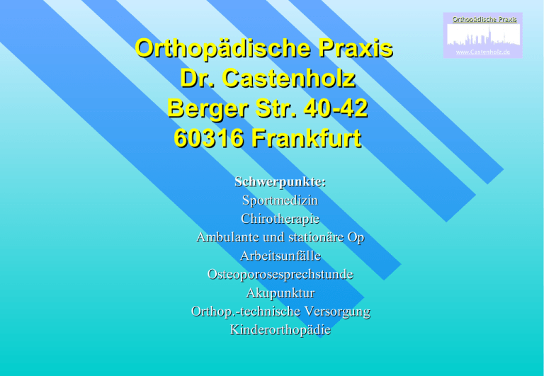 Orthopädische Praxis Orthopädische Praxis Dr. Castenholz Berger Str. 40-42 60316 Frankfurt Schwerpunkte: Sportmedizin Chirotherapie Ambulante und stationäre Op Arbeitsunfälle Osteoporosesprechstunde Akupunktur Orthop.-technische Versorgung Kinderorthopädie www.Castenholz.de Orthopädische Praxis www.Castenholz.de Einrichtung der Praxis ■ ■ ■ ■ ■ ■ ■ ■ ■ 6 Helferinnen, 1 Azubi, 1 AiP und Orthopädietechniker 206 qm2 Röntgenabteilung Sonographie Osteodensitometrie Orthop.-technische Versorgung Therapieabteilung Orthop. Praxis Castenholz, Berger Str. 40, 60316 FFM Kleiner OP/Gipsraum 2 Orthopädische Praxis Zur Person ■ ■ ■ ■ ■ ■ ■ www.Castenholz.de 1967 in Marburg geboren Verheiratet, (1 Kind) Studium in Wien und Marburg AiP in Orthop. Klinik Kassel 3 Jahre Chirurgie in Charite´ der Humboldt-Uni Berlin Orthop. Facharztausbildung in FFM-Höchst (PD Maronna) Schwerpunkte sind neben Chirotherapie/Kinderorthopädie die arthroskopische Extremitätenchirurgie sowie die Hand- und Fußchirurgie Orthop. Praxis Castenholz, Berger Str. 40, 60316 FFM 3 Orthopädische Praxis Altersverteilung in der Praxis www.Castenholz.de Alterverteilung Quartal 01/2003 600 500 400 300 200 100 0 1.-5. LJ 11.21.31.41.51.61.71.81.15.LJ 25.LJ 35.LJ 45.LJ 55.LJ 65.LJ 75.LJ 85.LJ 91.- Patienten (z=1857) Orthop. Praxis Castenholz, Berger Str. 40, 60316 FFM 4 Orthopädische Praxis Das Kniegelenk funktion. Anatomie Orthop. Praxis Castenholz, Berger Str. 40, 60316 FFM www.Castenholz.de 5 Orthopädische Praxis Das Kniegelenk ■ www.Castenholz.de Kniebinnenstrukturen mit Knorpel, Synovia, Kreuz+Seitenbändern + Meniscus lateralis und medialis Orthop. Praxis Castenholz, Berger Str. 40, 60316 FFM 6 Orthopädische Praxis Das Kniegelenk ■ www.Castenholz.de Schema Erkrankungsursachen: v.a. Degenerativ (Arthrose), Trauma (Kniebinnen), Angeboren (Achsfehlstellungen) Orthop. Praxis Castenholz, Berger Str. 40, 60316 FFM 7 Orthopädische Praxis Das Kniegelenk Kniebinnentrauma ■ www.Castenholz.de Typische Verletzungen bei Sport oder Autounfällen (Verdreh- oder Anpralltraumen) Orthop. Praxis Castenholz, Berger Str. 40, 60316 FFM 8 Das Kniegelenk Kniebinnentrauma ■ ■ Orthopädische Praxis www.Castenholz.de Meniscusläsionen als typischer Sportunfall Diagnosefindung durch Anamnese und klinische Untersuchung Meniscuszeichen Steinmann + Payr Orthop. Praxis Castenholz, Berger Str. 40, 60316 FFM 9 Orthopädische Praxis Das Kniegelenk Kniebinnentrauma ■ ■ www.Castenholz.de Kreuzbandruptur als Sportunfall Diagnosefindung durch Anamnese und klinische Untersuchung (Vordere Schublade, Lachmanntest) Orthop. Praxis Castenholz, Berger Str. 40, 60316 FFM 10 Orthopädische Praxis Das Kniegelenk ■ Normale Röntgenbildanatomie (immer 3 Ebenen : a.p., seitl. und Patella) Orthop. Praxis Castenholz, Berger Str. 40, 60316 FFM www.Castenholz.de 11 Orthopädische Praxis Das Kniegelenk im MRT ■ www.Castenholz.de Kniebinnenstrukturen mit Knorpel, Synovia, Kreuz+Seitenbändern + Meniscus lateralis und medialis Orthop. Praxis Castenholz, Berger Str. 40, 60316 FFM 12 Orthopädische Praxis Die Arthroskopie ■ www.Castenholz.de Röntgennormbefund und klin. V.a. Kniebinnentrauma (Vor-/Nachteile): a) Diagnostische + therapeut. ASK b) MRT (nur diagnostisch, unsicher) Orthop. Praxis Castenholz, Berger Str. 40, 60316 FFM 13 Orthopädische Praxis Die Arthroskopie ■ ■ ■ ■ ■ ■ ■ www.Castenholz.de Vorbereitung: Ambulant oder Stationär (Rotes Kreuz Krhs.) EKG ab 40, Rö Thorax auf Anforderung Labor Aufklärung: allgemeine Risiken, Thromboembolie, Immobil., Infektionen, Verschlechterung Innerer Erkrankungen Vorbereitung auf Folgebehandlung (Kreuzband/ Knie-TEP/ Knorpelaufbau/ -Transplantat) Mitgabe Medikamente, Planung der Nachbehandlung, UAG, Embolie-prophylaxe Orthop. Praxis Castenholz, Berger Str. 40, 60316 FFM 14 Orthopädische Praxis Die Arthroskopie ■ ■ www.Castenholz.de Diagnostisch + therapeutisch: Beispiel Meniskusteilresektion bei Riß und Blockierung Orthop. Praxis Castenholz, Berger Str. 40, 60316 FFM 15 Orthopädische Praxis Die Arthroskopie www.Castenholz.de Kreuzbandregion ■ OP Möglichkeiten: Knorpelglättung/-shaving, Kniebinnen-(Teil-)Resektionen, Kreuzbandersatz-plastiken, Knochen-Knropeltransplanate Orthop. Praxis Castenholz, Berger Str. 40, 60316 FFM 16 Orthopädische Praxis Die Arthroskopie ■ ■ ■ www.Castenholz.de Hoher apparativer Aufwand: Geringes Operationstrauma Schnelle Mobilsation, ambulante OP Orthop. Praxis Castenholz, Berger Str. 40, 60316 FFM 17 Orthopädische Praxis Kindliche Knierkrankung: Osteochondrosis dissecans www.Castenholz.de Alter O.D. Herd ■ OP Möglichkeiten: Anbohrung, Fixierung, Entfernung O.D., KnochenKnropeltransplanate Orthop. Praxis Castenholz, Berger Str. 40, 60316 FFM 18 Orthopädische Praxis Die Gonarthrose Orthop. Praxis Castenholz, Berger Str. 40, 60316 FFM www.Castenholz.de 19 Orthopädische Praxis Die Gonarthrose ■ ■ ■ Erworbene Erkr. (z.B. X-/O-Bein) Klinisch Anlauf- + Belastungs-schmerz, allmähliche Entwicklung Radiol. Zeichen (Sklerose, Osteophyten, Gelenkspalt Orthop. Praxis Castenholz, Berger Str. 40, 60316 FFM www.Castenholz.de 20 Orthopädische Praxis Die Gonarthrose Entwicklung ■ ■ ■ www.Castenholz.de der Arthrose Therapie: 1. Konservativ : (NSAR, Bewegung, Schmerzreduktion, Hyaluronsäure, Corticoide i.a., physik.Ther., Schuhe) 2. operativ : a) ASK/Nettoyage b) Umstellung c) Gelenkersatz (Vor-/Nachteile, Aufklärung) Orthop. Praxis Castenholz, Berger Str. 40, 60316 FFM 21 Orthopädische Praxis Die Gonarthrose ■ www.Castenholz.de Sinn und Unsinn von intraartikulären Injektionen (nur geeignete Arthrose!) Stichwort: wo kein Knorpel mehr ist, kann ich nichts mehr aufbauen! Orthop. Praxis Castenholz, Berger Str. 40, 60316 FFM 22 Orthopädische Praxis Die Gonarthrose ■ www.Castenholz.de Bei jüngeren Patienten : Umstellungs-osteotomie zur Korrektur der Beinachse, Verlagerung der Belastung Orthop. Praxis Castenholz, Berg