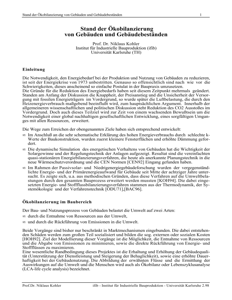Stand der Ökobilanzierung von Gebäuden und Gebäudebeständen 1 Stand der Ökobilanzierung von Gebäuden und Gebäudebeständen Prof. Dr. Niklaus Kohler Institut für Industrielle Bauproduktion (ifib) Universität Karlsruhe (TH) Einleitung Die Notwendigkeit, den Energiebedarf bei der Produktion und Nutzung von Gebäuden zu reduzieren, ist seit der Energiekrise von 1973 unbestritten. Genauso so offensichtlich sind nach wie vor die Schwierigkeiten, dieses anscheinend so einfache Postulat in der Baupraxis umzusetzen. Die Gründe für die Reduktion des Energiebedarfs haben seit diesem Zeitpunkt mehrmals geändert. Standen am Anfang der Diskussion die Knappheit, der Preisanstieg und die Unsicherheit der Versorgung mit fossilen Energieträgern im Vordergrund, so wurde später die Luftbelastung, die durch den Heizenergieverbrauch maßgebend beeinflußt wird, zum hauptsächlichen Argument. Innerhalb der allgemeineren wissenschaftlichen und politischen Diskussion steht Reduktion des CO2 Ausstoßes im Vordergrund. Doch auch dieses Teilziel wird zur Zeit von einem wachsenden Bewußtsein um die Notwendigkeit einer global nachhaltigen gesellschaftlichen Entwicklung, eines sorgfältigen Umganges mit allen Ressourcen, erweitert. Die Wege zum Erreichen der obengenannten Ziele haben sich entsprechend entwickelt: • Im Anschluß an die sehr schematische Erklärung des hohen Energieverbrauchs durch schlechte kWerte der Baukonstruktion, wurden zuerst kleinere Fensterflächen und erhöhte Dämmung gefordert. • Die dynamische Simulation des energetischen Verhaltens von Gebäuden hat die Wichtigkeit der Solargewinne und der Regelungstechnik der Anlagen aufgezeigt. Resultat sind die vereinfachten quasi-stationären Energiebilanzierungsverfahren, die heute als anerkannte Planungstechnik in die neue Wärmeschutzverordnung und die CEN Normen [CEN92] Eingang gefunden haben. • Im Rahmen der Passivsolar- und Niedrigenergiegebäudeforschung wurden der vergegenständlichte Energie- und der Primärenergieaufwand für Gebäude seit Mitte der achtziger Jahre untersucht. Es zeigte sich, u.a. aus methodischen Gründen, dass diese Verfahren auf die Umweltbelastungen durch den gesamten Bauprozess erweitert werden mussten [KOH94]. Die dabei eingesetzten Energie- und Stoffflussbilanzierungsverfahren stammen aus der Thermodynamik, der Systemökologie und der Verfahrenstechnik [ODU71],[BAC96]. Ökobilanzierung im Baubereich Der Bau- und Nutzungsprozess von Gebäuden belastet die Umwelt auf zwei Arten: • durch die Entnahme von Ressourcen aus der Umwelt, • und durch die Rückführung von Emissionen in die Umwelt. Beide Vorgänge sind bisher nur beschränkt in Marktmechanismen eingebunden. Die dabei entstehenden Schäden werden zum großen Teil sozialisiert und bilden die sog. externen oder sozialen Kosten [HOH92]. Ziel der Modellierung dieser Vorgänge ist die Möglichkeit, die Entnahme von Ressourcen und die Abgabe von Emissionen zu minimieren, sowie die direkte Rückführung von Energie- und Stoffflüssen zu maximieren. Eine wesentliche Randbedingung dieses Projektes ist die Erhaltung und Erhöhung der Gebäudequalität (Unterstützung der Dienstleistung und Steigerung der Behaglichkeit), sowie eine erhöhte Dauerhaftigkeit bei der Gebäudenutzung. Die Abbildung der erwähnten Flüsse und die Ermittlung der Auswirkungen auf die Umwelt und die Menschen wird auch als Ökobilanz oder Lebenszyklusanalyse (LCA-life cycle analysis) bezeichnet. Prof.Dr. Niklaus Kohler ifib - Institut für Industrielle Bauproduktion - Universität Karlsruhe 2.98 Stand der Ökobilanzierung von Gebäuden und Gebäudebeständen 2 Eine Lebenszyklusanalyse besteht im Allgemeinen aus 4 Schritten [SET93]: A - Festlegen des Bilanzierungsziels (Systemgrenzen, Funktionale Einheiten) B - Sachbilanz (Erfassen der Flüsse) C - Wirkungsbilanz (Zuordnung von Umwelteinwirkungen zu Flüssen) D - Bilanzbewertung (Aggregation von mehreren Einwirkungen) Die Abb. 1 fasst die 4 beschriebenen Stufen zusammen. Ausgehend von der Endenergiebilanz des Einzelgebäudes werden zuerst die Vorstufen der Energiebereitstellung (Primärenergie) und die vergegenständlichte Energie berücksichtigt. Als nächste Erweiterung kommt die Berücksichtigung der CO2 Emissionen als Indikator für die Luftbelastung. Die Systemgrenzen der aktuellen Ökobilanzierung werden durch Einbezug von zusätzlichen Ressourcen sowie die Auswirkungen auf mehrere Umweltkompartimente und ihre erste Aggregation in effektorientierte Bewertungen nochmals erweitert. Ressourcen Emissionen Energiebilanz Boden Versäuerung Wasser Überdüngung Wasser Energie erneuerbar Treibhaus Luft Fauna Energie nicht erneuerbar Photochem. Oxydation Ökotoxikolg. Flora Baustoffe Humantoxikol. Landschaft Strahlung Lärm Land Vorstufen Ozonschicht abbau Ressourcen Input Bilanzobjekt , Funktionale Einheit Kompartimente Effekte Abb. 1 : Von der Energiebilanz zur Ökobilanz Es ist unbestritten, dass der Endenergieverbrauch kein ausreichender Indikator für die Umweltbelastung ist. Auch der Primärenergieverbrauch ist nur für bestimmte Umweltbelastung ein ausreichender Indikator. Simulationsrechnungen an einer grösseren Anzahl von Gebäuden zeigen, dass die verschiedenen heute international verwendeten effektorientierten Bewertungen zum Teil vor allem durch die Nutzung von Gebäuden (Heizung, Lüftung, Prozesse) zum Teil jedoch eher durch Bauprozesse (Neubau, Erneuerung) beeinflußt werden. Das bedeutet, dass die Planung und der Betrieb von Gebäuden als komplexe, langlebig Objekte nicht mit einem einzigen Bewertungsverfahren bewältigt werden kann. Es ergibt sich daraus die Notwendigkeit einer relativen Bewertung: anstelle eines einzelnen, absoluten, Zielwertes tritt ein Lösungsraum der durch mehrere relative Kriterien gebildet wird [KOH94]. Die Werte für diese Kriterien stammen aus Referenzobjekten. Dieses Verfahren ist im Baubereich nicht neu, Gebäude lassen sich im Sinne der klassischen Optimierungsverfahren nicht auf einf