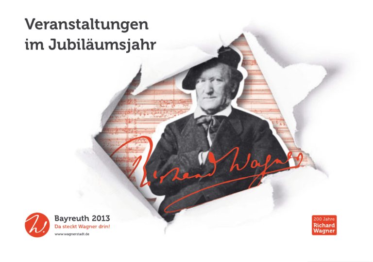Veranstaltungen im Jubiläumsjahr 200 Jahre Kunst-Genuss. www.maisel.com Darauf stoßen wir gerne an! Quelle: HORST-SEEHOFER.de 3 4 38 46 52 61 66 68 72 Das Richard-Wagner-Jubiläum steht unter der Schirmherrschaft des Bayerischen Ministerpräsidenten Horst Seehofer. Konzerte Inhalt INHALT Vorwort Konzerte Musiktheater | Schauspiel | Oper Ausstellungen Vorträge | Seminare | Lesungen Touristisches Rahmenprogramm Richard Wagner Museum Veranstaltungsübersicht Ticketinformationen | Impressum Umschlag: Veranstalterübersicht | Übersicht der Veranstaltungsorte mit Stadtplan 1 www.wagnerstadt.de • Jubiläums-Informationen • Veranstaltungsprogramm • aktuelle Nachrichten • Tickets • Tourismus-Informationen • Angebote für Schulklassen 2 LIebe KuLTuR- uNd MusIKfReuNde, Inhalt VORWORT im Jahr 2013 jährt sich Richard Wagners Geburtstag zum 200. Mal. Seit 1876, dem Jahr der ersten „Bayreuther Festspiele“, gilt Bayreuth weltweit als das Zentrum des Werkes Richard Wagners. Aus diesem Anlass hat die Stadt Bayreuth, die wie kein anderer Ort mit diesem großen Komponisten, Visionär und Erneuerer des Musiktheaters verbunden ist, ein – wie ich finde – höchst interessantes und spannendes Jubiläumsprogramm aufgelegt. Mit über 100 verschiedenen Veranstaltungen wie Konzerten, Musiktheater, Ausstellungen, Vorträgen und Lesungen feiert unsere Stadt das große Jubiläum. Wir freuen uns auf unvergessliche kulturelle Höhepunkte, die uns den Künstler und die Persönlichkeit Richard Wagners mit der breiten Palette seines künstlerischen Schaffens näher bringen werden. Ich wünsche Ihnen viele spannende und erfüllende Veranstaltungen in unserem Richard Wagner Jubiläumsjahr 2013. Brigitte Merk-Erbe Oberbürgermeisterin 3 Konzerte Konzerte Der schafft Kultur, der mehr als sie erstrebt. Richard Wagner 4 MNOzIL bRAss – HOjOTOHO © Foto: Mnozil Brass / T. Bozi So, 06.01. | 19.30 Uhr | Stadthalle Bayreuth, Großes Haus | Eintritt: € 45 / 35 / 25 / 15 / 10 | Veranstalter: Stadt Bayreuth Auch Mnozil Brass werden sich dem 200. Geburtstag Richard Wagners nicht verschließen und sich vor dem Meister in einer Produktion zur Eröffnung des Jubiläumsjahres in Demut verneigen. Wer Wagner und Mnozil Brass kennt, weiß, dass es dabei auf jeden Fall ums Blech gehen und dass auch der theatralen Umsetzung ein gehöriger Platz eingeräumt werden wird. Inszeniert wird die Uraufführung von dem in Bayreuth bereits bestens bekannten Hügelregisseur Philippe Arlaud. ∞ Wagner für sieben Blechbläser – Eine Wagner-Blech-Comedy – Musik: Richard Wagner, Mnozil Brass | Regie: Philippe Arlaud Konzerte Highlight JAN © Foto: Opernstudio Oberfranken e. V. Konzerte jAN/feb JAN/FEB AN/feb AN/feb HOMMAge à RIcHARd WAgNeR Fr, 01.02. | 19.30 Uhr | Kammermusiksaal im Steingraeber Haus | VVK: € 12 / 8 (ermäßigt) | Abendkasse: € 14 / 9 (ermäßigt) | Veranstalter: Tonkünstlerverband Bayreuth Die zeitgenössischen Bayreuther Komponisten, Helmut Bieler, Wolfram Graf und Michael Starke, huldigen Richard Wagner mit Werken für Sopran, Violoncello, Flöte und Klavier. OpeRNsTudIO-MATINée – WAgNeR IN deR zWeITeN geNeRATION Sa, 26.01. | 11.00 Uhr | Kammermusiksaal im Steingraeber Haus | VVK: € 12 / 8 (ermäßigt) | Abendkasse: € 14 / 9 (ermäßigt) | Veranstalter: Opernstudio Oberfranken e. V. Interpreten: Martin Seel, Flöte | Markus Jung, Violoncello | Catherine Winter, Mezzosopran | Rebekka Broberg, Sopran | Wolfram Graf und Marina Palmer, Klavier Das Opernstudio Oberfranken e.V. lädt Sie zu einem besonderen Liederabend mit Lesung ein. Erleben Sie zu Beginn des großen Jubiläumsjahres selten gehörte Lieder von Siegfried Wagner. WAgNeRIANeR uNd ANTI-WAgNeRIANeR Ramona Friedrich, Sopran Susanne Oehm-Henninger, Mezzosopran Die Klaviermanufaktur Steingraeber & Söhne eröffnet ihrerseits das Wagner-Jahr mit einer Veranstaltung der besonderen Art: Am und um den Todestag von Richard Wagner bieten Amélie Sandmann und Siegfried Mauser zu später Stunde ein musikalisch-literarisches Programm dar. Im Anschluss wird auf den Bayreuther Meister angestoßen. Ein Minibuffet ist aufgebaut. Michael Wolfrum, Bariton Anna Baturina-Ringlein, Klavier 6 ∞ Helmut Bieler – In Memoriam Walküre (Uraufführung) ∞ Wolfram Graf – Grals-Räume (Lieder auf Texte von Tankred Dorst und Ingo Cesaro; Uraufführung) ∞ Michael Starke – Entsagung (Monodrama nach Gedichten und Briefen von Mathilde Wesendonck aus dem Briefwechsel zwischen Mathilde Wesendonck und Richard Wagner; Uraufführung) MITTeRNAcHTsVeRANsTALTuNg AM uNd uM deN TOdesTAg VON RIcHARd WAgNeR Di, 12.02., 23.00 Uhr bis Mi, 13.02., ca. 1.00 Uhr | Rokokosaal im Steingraeber Haus | Eintritt: € 28 inklusive kleiner Bewirtung (ausschließlich VVK, Limitierung auf 50 Plätze) | Veranstalter: Steingraeber & Söhne KAMMeRMusIK zuM 130. TOdesTAg RIcHARd WAgNeRs – TRIO pARNAssus Mi, 13.02. | 19.30 Uhr | Stadthalle Bayreuth, Großes Haus | Eintritt: € 29 / 19 / 15 / 12 / 10 | Veranstalter: Stadt Bayreuth © Foto: Daniel Pasche Ein geradezu perfektes Miteinander, ein außerordentliches Gespür für Farben und Gefühlswerte und eine vorurteilsfreie Lust auf Entdeckungen: Das sind einige der herausragenden Faktoren, die Musikfreunde und –kritiker dem Trio Parnassus seit jeher attestieren. Nicht ohne Grund wurden die zweifachen Echo-Preisträger 1999 von dem britischen Magazin Classic CD zu einem der beiden führenden Klaviertrios der Gegenwart gewählt. ∞ ∞ ∞ ∞ Konzerte Highlight FEB Ludwig van Beethoven – 14 Variationen op. 44 Franz Liszt – Vallée d’Obermann (aus Années de Pèlerinage) Milko Kelemen – Uraufführung Johannes Brahms – Klaviertrio H-Dur op. 8 (Spätfassung 1891) 7 FEB feb Fr, 15.02. | 20.00 Uhr | Stadthalle Bayreuth, Großes Haus | Eintritt: € 10 / 5 (ermäßigt) | Veranstalter: Stadt Bayreuth © Foto: Big Band der Universität Bayreuth Konzerte bIg bANd gOes WAgNeR Anlässlich des Wagner-Jubiläums 2013 interpretieren junge Musi