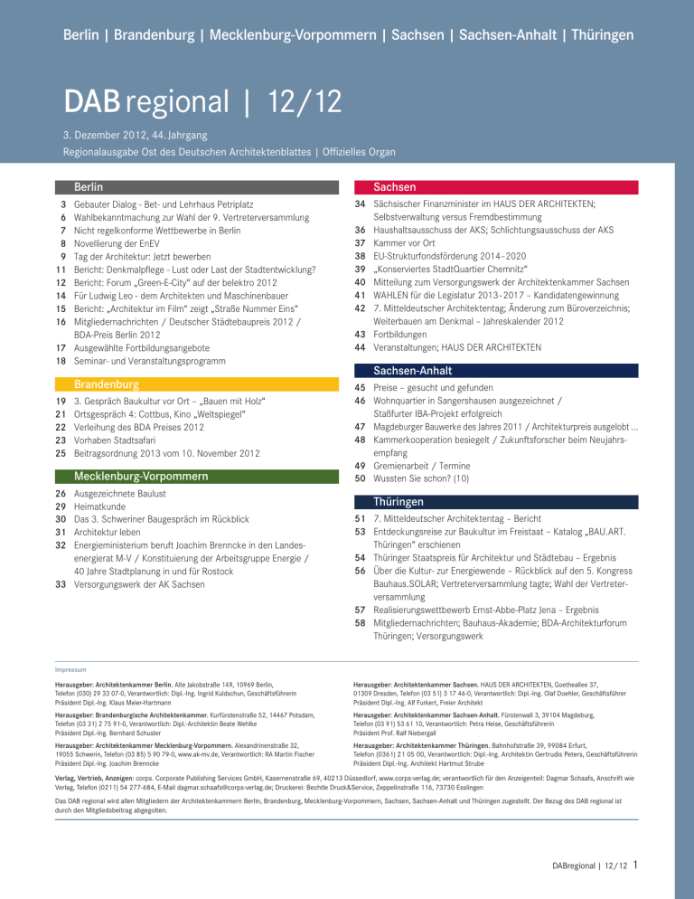 Berlin | Brandenburg | Mecklenburg-Vorpommern | Sachsen | Sachsen-Anhalt | Thüringen DAB regional | 12/12 3. Dezember 2012, 44. Jahrgang Regionalausgabe Ost des Deutschen Architektenblattes | Offizielles Organ Berlin 3 6 7 8 9 11 12 14 15 16 GebauterDialog-Bet-undLehrhausPetriplatz WahlbekanntmachungzurWahlder9.Vertreterversammlung NichtregelkonformeWettbewerbeinBerlin NovellierungderEnEV TagderArchitektur:Jetztbewerben Bericht:Denkmalpflege-LustoderLastderStadtentwicklung? Bericht:Forum„Green-E-City“aufderbelektro2012 FürLudwigLeo-demArchitektenundMaschinenbauer Bericht:„ArchitekturimFilm“zeigt„StraßeNummerEins“ Mitgliedernachrichten/DeutscherStädtebaupreis2012/ BDA-PreisBerlin2012 17 AusgewählteFortbildungsangebote 18 Seminar-undVeranstaltungsprogramm Brandenburg 19 21 22 23 25 3.GesprächBaukulturvorOrt–„BauenmitHolz“ Ortsgespräch4:Cottbus,Kino„Weltspiegel“ VerleihungdesBDAPreises2012 VorhabenStadtsafari Beitragsordnung2013vom10.November2012 Mecklenburg-Vorpommern 26 29 30 31 32 AusgezeichneteBaulust Heimatkunde Das3.SchwerinerBaugesprächimRückblick Architekturleben EnergieministeriumberuftJoachimBrennckeindenLandesenergieratM-V/KonstituierungderArbeitsgruppeEnergie/ 40JahreStadtplanunginundfürRostock 33 VersorgungswerkderAKSachsen Sachsen 34 SächsischerFinanzministerimHAUSDERARCHITEKTEN; SelbstverwaltungversusFremdbestimmung 36 HaushaltsausschussderAKS;SchlichtungsausschussderAKS 37 KammervorOrt 38 EU-Strukturfondsförderung2014–2020 39 „KonserviertesStadtQuartierChemnitz“ 40 MitteilungzumVersorgungswerkderArchitektenkammerSachsen 41 WAHLENfürdieLegislatur2013–2017–Kandidatengewinnung 42 7.MitteldeutscherArchitektentag;ÄnderungzumBüroverzeichnis; WeiterbauenamDenkmal–Jahreskalender2012 43 Fortbildungen 44 Veranstaltungen;HAUSDERARCHITEKTEN Sachsen-Anhalt 45 Preise–gesuchtundgefunden 46 WohnquartierinSangershausenausgezeichnet/ StaßfurterIBA-Projekterfolgreich 47 MagdeburgerBauwerkedesJahres2011/Architekturpreisausgelobt... 48 Kammerkooperationbesiegelt/ZukunftsforscherbeimNeujahrsempfang 49 Gremienarbeit/Termine 50 WusstenSieschon?(10) Thüringen 51 53 54 56 7.MitteldeutscherArchitektentag–Bericht EntdeckungsreisezurBaukulturimFreistaat–Katalog„BAU.ART. Thüringen“erschienen ThüringerStaatspreisfürArchitekturundStädtebau–Ergebnis ÜberdieKultur-zurEnergiewende–Rückblickaufden5.Kongress Bauhaus.SOLAR;Vertreterversammlungtagte;WahlderVertreterversammlung 57 RealisierungswettbewerbErnst-Abbe-PlatzJena–Ergebnis 58 Mitgliedernachrichten;Bauhaus-Akademie;BDA-Architekturforum Thüringen;Versorgungswerk Impressum Herausgeber: Architektenkammer Berlin. Alte Jakobstraße 149, 10969 Berlin, Telefon (030) 29 33 07-0, Verantwortlich: Dipl.-Ing. Ingrid Kuldschun, Geschäftsführerin Präsident Dipl.-Ing. Klaus Meier-Hartmann Herausgeber: Architektenkammer Sachsen. HAUS DER ARCHITEKTEN, Goetheallee 37, 01309 Dresden, Telefon (03 51) 3 17 46-0, Verantwortlich: Dipl.-Ing. Olaf Doehler, Geschäftsführer Präsident Dipl.-Ing. Alf Furkert, Freier Architekt Herausgeber: Brandenburgische Architektenkammer. Kurfürstenstraße 52, 14467 Potsdam, Telefon (03 31) 2 75 91-0, Verantwortlich: Dipl.-Architektin Beate Wehlke Präsident Dipl.-Ing. Bernhard Schuster Herausgeber: Architektenkammer Sachsen-Anhalt. Fürstenwall 3, 39104 Magdeburg, Telefon (03 91) 53 61 10, Verantwortlich: Petra Heise, Geschäftsführerin Präsident Prof. Ralf Niebergall Herausgeber: Architektenkammer Mecklenburg-Vorpommern. Alexandrinenstraße 32, 19055 Schwerin, Telefon (03 85) 5 90 79-0, www.ak-mv.de, Verantwortlich: RA Martin Fischer Präsident Dipl.-Ing. Joachim Brenncke Herausgeber: Architektenkammer Thüringen. Bahnhofstraße 39, 99084 Erfurt, Telefon (0361) 21 05 00, Verantwortlich: Dipl.-Ing. Architektin Gertrudis Peters, Geschäftsführerin Präsident Dipl.-Ing. Architekt Hartmut Strube Verlag, Vertrieb, Anzeigen: corps. Corporate Publishing Services GmbH, Kasernenstraße 69, 40213 Düssedlorf, www.corps-verlag.de; verantwortlich für den Anzeigenteil: Dagmar Schaafs, Anschrift wie Verlag, Telefon (0211) 54 277-684, E-Mail [email protected]; Druckerei: Bechtle Druck&Service, Zeppelinstraße 116, 73730 Esslingen Das DAB regional wird allen Mitgliedern der Architektenkammern Berlin, Brandenburg, Mecklenburg-Vorpommern, Sachsen, Sachsen-Anhalt und Thüringen zugestellt. Der Bezug des DAB regional ist durch den Mitgliedsbeitrag abgegolten. DABregional | 12/12 1 Grafik: Atelier Eichhorn Architektenkammer Berlin Alte Jakobstraße 149 |10969 Berlin |Telefon (030) 29 33 07-0 | [email protected] | www.ak-berlin.de Gebauter Dialog In Berlin soll ein Gotteshaus entstehen, in dem die drei monotheistischen Weltreligionen unter einem Dach beten und streiten. In der Geschichte des Sakralbaus schlägt das Projekt ein neues Kapitel auf. D as Bauvorhaben ist ein Neuanfang in vielerlei Hinsicht: Auf den Grundmauern der alten St. Petrikirche in Berlins historischer Mitte will der Verein „Betund Lehrhaus Petriplatz e.V.“ ein Gotteshaus für Christen, Juden und Moslems bauen. Alle drei Religionsgemeinschaften sollen dort Gott auf ihre Weise anbeten können, jede in ihrem eigenen Betsaal, aber alle drei unter einem Dach. Der Raum zwischen den Betsälen dient dem interreligiösen Dialog – Themen dafür gibt es genug, von den Kontroversen zu Kopftuchverbot, Antisemitismus und Fundamentalismus bis hin zu den hoffnungsvoll stimmenden Gemeinsamkeiten, die abrahamitische Tradition und der Glauben an einen einzigen Allmächtigen. Das Haus solle das Gemeinsame betonen, aber auch ein Ort sein, „wo offen und kontrovers diskutiert wird“, sagt Anna Poeschel, die Sprecherin der federführenden Evangelischen Gemeinde St. Petri – St. Marien. Es gehe darum, Unterschiede und theologische Gegensätze „auszuhalten“. Seit dem 7. September 2012 steht auch fest, wie das passende Bauwerk dafür aussehen könnte. Unter 38 eingereichten Wettbewerbsbeiträgen setzte sich der Entwurf des Berl