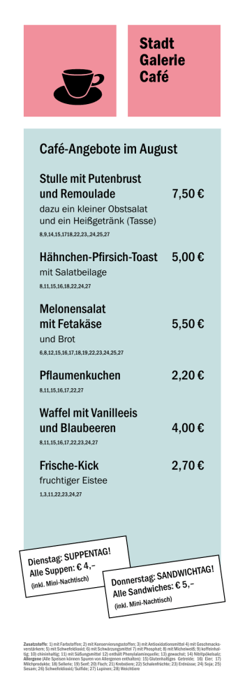 Café-Angebote im August Stulle mit Putenbrust und Remoulade 7,50 € dazu ein kleiner Obstsalat und ein Heißgetränk (Tasse) 8,9,14,15,1718,22,23,,24,25,27 Hähnchen-Pfirsich-Toast 5,00 € mit Salatbeilage 8,11,15,16,18,22,24,27 Melonensalat mit Fetakäse 5,50 € und Brot 6,8,12,15,16,17,18,19,22,23,24,25,27 Pflaumenkuchen 2,20 € 8,11,15,16,17,22,27 Waffel mit Vanilleeis und Blaubeeren 4,00 € 8,11,15,16,17,22,23,24,27 Frische-Kick 2,70 € fruchtiger Eistee 1,3,11,22,23,24,27 G! SUPPENTA Dienstag: € 4,– n: Alle Suppe sch) hti l. Mini-Nac (ink G! NDWICHTA A S : g ta rs Donne iches: € 5,– Alle Sandw ) Nachtisch (inkl. Mini- Zusatzstoffe: 1) mit Farbstoffen; 2) mit Konservierungsstoffen; 3) mit Antioxidationsmittel 4) mit Geschmacksverstärkern; 5) mit Schwefeldioxid; 6) mit Schwärzungsmittel 7) mit Phosphat; 8) mit Micheiweiß; 9) koffeinhaltig; 10) chininhaltig; 11) mit Süßungsmittel 12) enthält Phenylalaminquelle; 13) gewachst; 14) Nitritpökelsalz; Allergene (Alle Speisen können Spuren von Allergenen enthalten): 15) Glutenhaltiges Getreide; 16) Eier; 17) Milchprodukte; 18) Sellerie; 19) Senf; 20) Fisch; 21) Krebstiere; 22) Schalenfrüchte; 23) Erdnüsse; 24) Soja; 25) Sesam; 26) Schwefeldioxid/Sulfide; 27) Lupinen; 28) Weichtiere Kultur-Angebote im August Mi. 09.08.2017 | 17:00 Uhr Internationales Café Fr. 11.08.2017 | 19:00 Uhr Resonanz „Wenn Wörter nicht ausreichen“ Tanzperformance Do. 17.08.2017 | 20:00 Uhr Open Stage Fr. 18.08.2017 | 19:00 Uhr Duo Cantolegno | Die Zuhörer werden in die farb- und nuancenreiche Klangwelt des Zusammenspiels von Gitarre und Violine geführt Mi. 23.08. 2017 | 17:00 Uhr Internationales Café Mi. 23.08. 2017 | 19:00 bis 20:30 Uhr Fragestunde zum Thema Asylrecht (mit arabischer Übersetzung) Fr. 25.08.2017 | 19:00 Uhr Afrikanisches Buffet Sa. 26.08.2017 | Kulturnacht Zur vollen Stunde ab 18:00 Uhr bis 23:00 Uhr „Wer versteht das schon ?“ | Mehrsprachige Kurz-Lesungen mit Gedichten Geflüchteter und von MigrantInnen aus Osnabrück (mit deutscher Übersetzung ) Öffnungszeiten: Di. – Sa. 09:00 – 18:30 Uhr, So. 10:00 – 17:30 Uhr, Mo. Ruhetag Große Gildewart 14 49074 Osnabrück Tel. 05 41 / 580 540 - 20 facebook.com/Stadtgaleriecafe