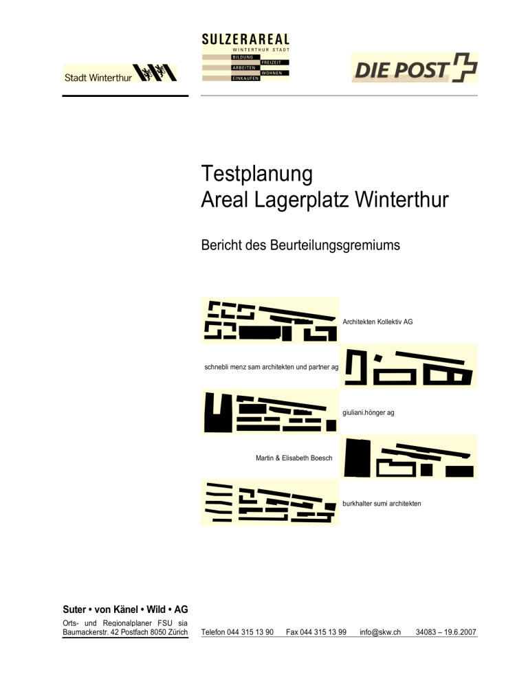 Testplanung Areal Lagerplatz Winterthur Bericht des Beurteilungsgremiums Architekten Kollektiv AG schnebli menz sam architekten und partner ag giuliani.hönger ag Martin & Elisabeth Boesch burkhalter sumi architekten Suter • von Känel • Wild • AG Orts- und Regionalplaner FSU sia Baumackerstr. 42 Postfach 8050 Zürich Telefon 044 315 13 90 Fax 044 315 13 99 [email protected] 34083 – 19.6.2007 Testplanung Areal Lagerplatz Winterthur Bericht des Beurteilungsgremiums Inhaltsverzeichnis 1. Verfahren 1.1 Ausgangslage 1.2 Zielsetzung 1.3 Verfahren 3 4 4 2. Aufgabe 6 3. Projekte 8 3.1 3.2 3.3 3.4 3.5 3.6 Überblick Architekten Kollektiv AG schnebli menz sam architekten und partner ag giuliani.hönger ag Martin & Elisabeth Boesch burkhalter sumi architekten 4. Gesamtwürdigung und Empfehlungen 4.1 4.2 4.3 4.4 Gesamtwürdigung und Dank Planungsstrategie Gesamtkonzept Weiteres Vorgehen 5. Genehmigung 2 3 Suter • von Känel • Wild • AG 8 10 15 20 27 34 39 39 39 40 47 49 Testplanung Areal Lagerplatz Winterthur Bericht des Beurteilungsgremiums 1. Verfahren 1.1 Klärung baurechtliche Rahmenbedingungen Ausgangslage Die Post und die Sulzer Immobilien AG als Eigentümerinnen des Areals Lagerplatz wollen gemeinsam mit der Stadt Winterthur das Areal soweit entwickeln, dass die baurechtlichen Rahmenbedingungen neu formuliert werden können. In einem ersten Schritt wird eine Testplanung durchgeführt. Eine überzeugende städtebauliche Idee für das Gesamtareal soll als Grundlage für die Anpassung der Bau- und Zonenordnung dienen. Zudem können aus dem Gesamtkonzept die Vorgaben für eine Weiterentwicklung der verschiedenen Überbauungsprojekte definiert werden. Das Areal Lagerplatz liegt zwischen der Bahnlinie und dem Strassenzug Zur Kesselschmiede / Tössfeldstrasse 3 Suter • von Känel • Wild • AG Testplanung Areal Lagerplatz Winterthur Bericht des Beurteilungsgremiums 1.2 Umfassendes städtebauliches Gesamtkonzept Zielsetzung Es ist ein umfassendes Gesamtkonzept für das Areal Lagerplatz unter Berücksichtigung folgender Gesichtspunkte aufzuzeigen: • • einer überzeugenden Grundhaltung einer städtebaulich vertretbaren baulichen Dichte • einer urbanen Mischnutzung und der entsprechenden optimalen Nutzungsverteilung eines angemessenen Wohnanteils der denkmalpflegerischen Vorgaben eines attraktiven Freiraums einer optimaler Erschliessung einer zweckmässigen Etappierung • • • • • Erweiterung ZHW Innerhalb des Areals Lagerplatz ist im Rahmen des Gesamtkonzeptes die Möglichkeit der Erweiterung der Zürcher Hochschule Winterthur (ZHW) nachzuweisen. 1.3 Beurteilungsgremium 4 Verfahren Die Post: Manfred Jakob, Leiter Projektmanagement Alex von Teufenstein, dipl. Architekt ETH, Projektentwicklung Sulzer Immobilien AG: Martin Schmidli, Geschäftsführer Walter Muhmenthaler, dipl. Architekt ETH, Projektentwicklung Stadt Winterthur: Ernst Wohlwend, Stadtpräsident Kanton Zürich: Christoph Hänseler, Baudirektion Fachleute: Martin Spühler, dipl. Architekt BSA/SIA (Vorsitz) Beat Jordi, dipl. Architekt BSA/SIA Guido Hager, dipl. Landschaftsarch. BSLA Experten Stadt Winterthur: Reto Bieli, Denkmalpflege Michael Hauser, Stadtbaumeister Dr. Fridolin Störi, Leiter Baupolizeiamt Mark Würth, Stadtentwicklung Suter • von Känel • Wild • AG Testplanung Areal Lagerplatz Winterthur Bericht des Beurteilungsgremiums Teilnehmer • • • • • Architekten Kollektiv AG, Winterthur schnebli menz sam architekten und partner ag, Zürich giuliani.hönger ag, Dipl. Architekten ETH-BSA-SIA, Zürich Martin & Elisabeth Boesch, Architekten ETH SIA BSA, Zürich burkhalter sumi architekten, ETH BSA SWB SIA, Zürich Verfahrensbegleitung Suter • von Känel • Wild • AG: Alwin Suter, Caroline Traber und Reto Wild Ablauf Die Teilnehmenden stellen dem Beurteilungsgremium an der Zwischenbesprechung die geprüften Lösungsansätze und an der Schlussbesprechung den aufgrund der Beurteilung vertieft bearbeiteten Lösungsansatz vor. Folgerungen Das Beurteilungsgremium erarbeitet aufgrund der Gesamtkonzepte, der Diskussionen und der Würdigungen der einzelnen Beiträge die Empfehlungen an die Entscheidungsträger. 5 Suter • von Känel • Wild • AG Testplanung Areal Lagerplatz Winterthur Bericht des Beurteilungsgremiums 2. Aufgabe Gesamtkonzept Es ist ein städtebaulich überzeugendes Überbauungs- und Freiraumkonzept mit tragender Gesamtidee zu erarbeiten, welches im Hinblick auf eine künftige Neuzonierung die folgenden Themen behandelt: Bauliche Dichte Es ist eine bauliche Dichte vorzuschlagen, welche den teilnehmenden Teams als angemessen erscheint. Der Richtwert der Ausnützung liegt bei 200%, wobei der Spielraum 150% - 250% beträgt. Der zentralen Lage und der Richtplanfestlegung „Zentrumsgebiet von kantonaler Bedeutung“ ist Rechnung zu tragen. Bebauung Bauten entlang des SBB-Areals sind "unter Übernahme der bestehenden Volumen" zu erstellen. Das Erscheinungsbild mit den grossflächigen, geschlossenen Fassaden gegen die SBB ist für neue Bauten wegleitend. Höhere Gebäude sind jedoch nicht ausgeschlossen und sind im Rahmen des Gesamtkonzeptes zulässig. Die industrielle Prägung des Areals muss erkennbar bleiben, soll aber in einer modernen, den neuen Nutzungen entsprechenden Form interpretiert werden. 6 Suter • von Känel • Wild • AG Testplanung Areal Lagerplatz Winterthur Bericht des Beurteilungsgremiums Nutzungen Im Areal Lagerplatz wird ein urbanes, bahnhofnahes Mischquartier angestrebt. Von besonderer Bedeutung sind die Anordnung der verschiedenen Nutzungen und die Einbindung der Option ZHW ins Gesamtgefüge. Wohnungen und Büros mit grosser Attraktivität an geeigneter Lage sind zu schaffen, wobei eine flexible Wohn- und Büronutzung vorhanden sein muss. Der minimale Wohnanteil beträgt 30%. Die Erdgeschosse sind nutzungsflexibel für Verkauf, Dienstleistung, Gastronomie, Wohnatelier usw. zu gestalten. Auch kleinteilige Nutzungen wie Kleinbetriebe sollen weiterhin ihren