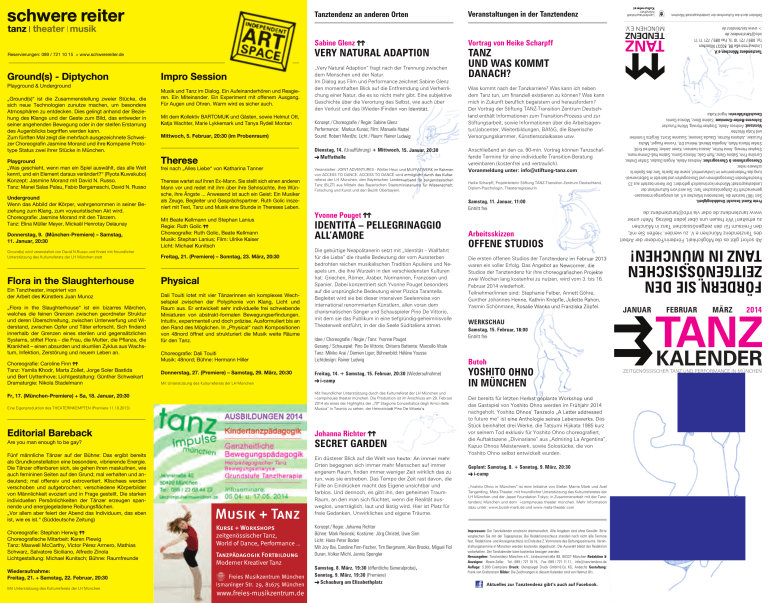 Veranstaltungen in der Tanztendenz Sabine Glenz Vortrag von Heike Scharpff tanz theater musik MÜNCHEN E.V. Underground Wenn das Abbild der Körper, wahrgenommen in seiner Beziehung zum Klang, zum voyeuristischen Akt wird. Choreografie: Jasmine Morand mit den Tänzern. Tanz: Elina Müller Meyer, Mickaël Henrotay Delaunay Donnerstag, 9. (München-Premiere) – Samstag, 11. Januar, 20:30 Mit dem Kollektiv BARTOMUK und Gästen, sowie Helmut Ott, Katja Wachter, Marie Lykkemark und Tanya Rydell Montan Mittwoch, 5. Februar, 20:30 (im Probenraum) Therese frei nach „Alles Liebe“ von Katharina Tanner Therese wartet auf ihren Ex-Mann. Sie stellt sich einen anderen Mann vor und redet mit ihm über ihre Sehnsüchte, ihre Wünsche, ihre Ängste ... Anwesend ist auch ein Geist: Ein Musiker als Zeuge, Begleiter und Gesprächspartner. Ruth Golic inszeniert mit Text, Tanz und Musik eine Stunde in Thereses Leben. Mit Beate Kellmann und Stephan Lanius Regie: Ruth Golic Choreografie: Ruth Golic, Beate Kellmann Musik: Stephan Lanius; Film: Ulrike Kaiser Licht: Michael Kunitsch Ground(s) wird veranstaltet von David N.Russo und findet mit freundlicher Unterstützung des Kulturreferats der LH München statt. Freitag, 21. (Premiere) – Sonntag, 23. März, 20:30 Flora in the Slaughterhouse Physical Ein Tanztheater, inspiriert von der Arbeit des Künstlers Juan Munoz „Flora in the Slaughterhouse“ ist ein bizarres Märchen, welches die feinen Grenzen zwischen geordneter Struktur und deren Überschreitung, zwischen Unterwerfung und Widerstand, zwischen Opfer und Täter erforscht. Sich findend innerhalb der Grenzen eines sterilen und gegensätzlichen Systems, stiftet Flora - die Frau, die Mutter, die Pflanze, die Krankheit – einen absurden und skurrilen Zyklus aus Wachstum, Infektion, Zerstörung und neuem Leben an. Choreografie: Caroline Finn Tanz: Yamila Khodr, Marta Zollet, Jorge Soler Bastida und Bert Uyttenhove; Lichtgestaltung: Günther Schweikart Dramaturgie: Nikola Stadelmann Dali Touiti lotet mit vier Tänzerinnen ein komplexes Wechselspiel zwischen der Polyphonie von Klang, Licht und Raum aus. Er entwickelt sehr individuelle frei schwebende Miniaturen von abstrakt-formalen Bewegungserfindungen. Intuitiv, experimentell und doch präzise. Ausformuliert bis an den Rand des Möglichen. In „Physical“ nach Kompositionen von 48nord öffnet und strukturiert die Musik weite Räume für den Tanz. Choreografie: Dali Touiti Musik: 48nord; Bühne: Hermann Hiller Donnerstag, 27. (Premiere) – Samstag, 29. März, 20:30 Mit Unterstützung des Kulturreferats der LH München Konzept / Choreografie / Regie: Sabine Glenz Performance: Markus Kunas; Film: Manuela Hartel Sound: Robert Merdžo; Licht / Raum: Rainer Ludwig Dienstag, 14. (Uraufführung) + Mittwoch, 15. Januar, 20:30 Muffathalle Veranstalter: JOINT ADVENTURES - Walter Heun und MUFFATWERK im Rahmen von ACCESS TO DANCE. ACCESS TO DANCE wird ermöglicht durch das Kulturreferat der LH München, den Bayerischen Landesverband für zeitgenössischen Tanz (BLZT) aus Mitteln des Bayerischen Staatsministeriums für Wissenschaft, Forschung und Kunst und den Bezirk Oberbayern. Yvonne Pouget IDENTITÁ – PELLEGRINAGGIO ALL’AMORE Die gebürtige Neapolitanerin setzt mit „Identität – Wallfahrt für die Liebe“ die rituelle Bedeutung der vom Aussterben bedrohten reichen musikalischen Tradition Apuliens und Neapels um, die ihre Wurzeln in den verschiedensten Kulturen hat: Griechen, Römer, Araber, Normannen, Franzosen und Spanier. Dabei konzentriert sich Yvonne Pouget besonders auf die ursprüngliche Bedeutung einer Pizzica Tarantella. Begleitet wird sie bei dieser intensiven Seelenreise von international renommierten Künstlern, allen voran dem charismatischen Sänger und Schauspieler Pino De Vittorio, mit dem sie das Publikum in eine tiefgründig-geheimnisvolle Theaterwelt entführt, in der die Seele Süditaliens atmet. Idee / Choreografie / Regie / Tanz: Yvonne Pouget Gesang / Schauspiel: Pino De Vittorio; Chitarra Battente: Marcello Vitale Tanz: Mikiko Arai / Damien Liger; Bühnenbild: Hélène Yousse Lichtdesign: Rainer Ludwig Freitag, 14. + Samstag, 15. Februar, 20:30 (Wiederaufnahme) i-camp Eine Eigenproduktion des THEATERINKEMPTEN (Premiere 11.10.2013) Mit freundlicher Unterstützung durch das Kulturreferat der LH München und i-camp/neues theater münchen. Die Produktion ist im Anschluss am 28. Februar 2014 als eines der Highlights der „70ª Stagione Concertistica degli Amici della Musica“ in Taranto zu sehen, der Heimatstadt Pino De Vittorio’s. Editorial Bareback Johanna Richter Fr, 17. (München-Premiere) + Sa, 18. Januar, 20:30 Are you man enough to be gay? SECRET GARDEN Fünf männliche Tänzer auf der Bühne: Das ergibt bereits als Grundkonstellation eine besondere, vibrierende Energie. Die Tänzer offenbaren sich, sie gehen ihren maskulinen, wie auch femininen Seiten auf den Grund; mal verhalten und andeutend; mal offensiv und extrovertiert. Klischees werden verschoben und aufgebrochen; verschiedene Körperbilder von Männlichkeit evoziert und in Frage gestellt. Die starken individuellen Persönlichkeiten der Tänzer erzeugen spannende und energiegeladene Reibungsflächen. „Vor allem aber feiert der Abend das Individuum, das eben ist, wie es ist.“ (Süddeutsche Zeitung) Ein düsterer Blick auf die Welt von heute: An immer mehr Orten begegnen sich immer mehr Menschen auf immer engerem Raum, finden immer weniger Zeit wirklich das zu tun, was sie erstreben. Das Tempo der Zeit rast davon, die Fülle an Eindrücken macht das Eigene unsichtbar und farblos. Und dennoch, es gibt ihn, den geheimen TraumRaum, an den man sich flüchtet, wenn die Realität ausweglos, unerträglich, laut und lästig wird. Hier ist Platz für freie Gedanken, Unwirkliches und eigene Träume. Choreografie: Stephan Herwig Choreografische Mitarbeit: Karen Piewig Tanz: Maxwell McCarthy, Víctor Pérez Armero, Mathias Schwarz, Salvatore Siciliano, Alfredo Zinola Lichtges