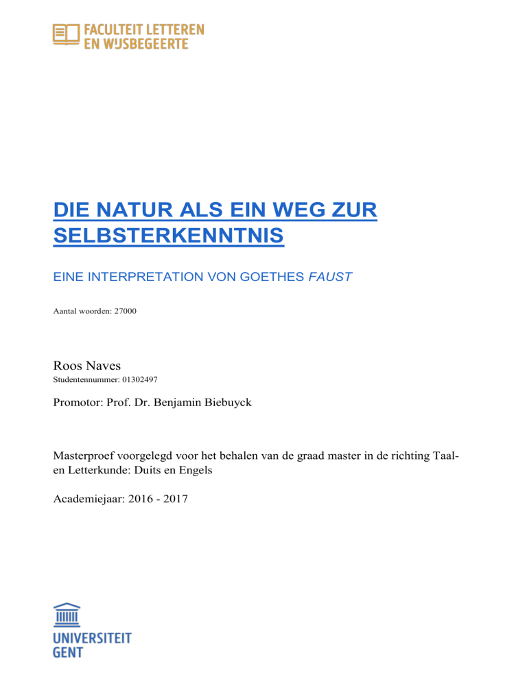 DIE NATUR ALS EIN WEG ZUR SELBSTERKENNTNIS EINE INTERPRETATION VON GOETHES FAUST Aantal woorden: 27000 Roos Naves Studentennummer: 01302497 Promotor: Prof. Dr. Benjamin Biebuyck Masterproef voorgelegd voor het behalen van de graad master in de richting Taalen Letterkunde: Duits en Engels Academiejaar: 2016 - 2017 2 Verklaring in verband met auteursrecht De auteur en de promotor geven de toelating deze studie als geheel voor consultatie beschikbaar te stellen voor persoonlijk gebruik. Elk ander gebruik valt onder de beperkingen van het auteursrecht, in het bijzonder met betrekking tot de verplichting de bron uitdrukkelijk te vermelden bij het aanhalen van gegevens uit deze studie. Het auteursrecht betreffende de gegevens vermeld in deze studie berust bij de promotor. Het auteursrecht beperkt zich tot de wijze waarop de auteur de problematiek van het onderwerp heeft benaderd en neergeschreven. De auteur respecteert daarbij het oorspronkelijke auteursrecht van de individueel geciteerde studies en eventueel bijhorende documentatie, zoals tabellen en figuren. De auteur en de promotor zijn niet verantwoordelijk voor de behandelingen en eventuele doseringen die in deze studie geciteerd en beschreven zijn. 3 Danksagung Für die unterstützende und hilfreiche Arbeit, die Professor Doktor Biebuyck, Daniela Oele, Joan Botman, Bodo von Plato, Doktor Martina Maria Sam, Gary Vos, Ruben Matthys und Paul van Panhuys für meine Magisterarbeit geleistet haben, will ich meinen großen Dank aussprechen. Professor Biebuyck hat mich mit klaren Fragen und wachem Verstand in dem Labyrinth Faust begleitet. Seine Flexibilität und Geschwindigkeit beim Korrekturlesen waren sublim. Ich möchte ihm aber nicht nur für seine riesige Unterstützung während des Schreibens dieser Magisterarbeit danken, sondern auch für die Freiheit, die er mir gegeben hat. Er hat mir erlaubt und mich darin stimuliert, innerhalb des wissenschaftlichen Rahmens meine eigenen Gedanken zu finden und zu formulieren. Daniela Oele möchte ich ganz herzlich danken für ihre Korrektur. Sie hat nicht nur die Grammatik- und Satzfehler entdeckt und verbessert, sondern sie hat auch als zweite Leserin, außerhalb des wissenschaftlichen Kontextes, die Begreiflichkeit des Textes überprüft. Ihre Anweisungen waren mir viel wert. Meinem liebsten Großvater Joan Botman, danke ich für das gemeinsame unternehmen dieses Abenteuers. Seine Gedanken über Faust haben mich inspiriert und mir weitergeholfen. Oft haben mir seine Anweisungen geholfen meine Gedanken zu schärfen, was für mich von großer Bedeutung war. Die Möglichkeit, dass ich diesen Weg zusammen mit meinem Großvater gehen konnte, ist zu einer goldenen Erfahrung geworden. Ich danke auch meiner liebsten Großmutter, dass sie Zeit eingeräumt hat, in der Opa studieren konnte – hoffentlich hilft er nun wieder beim Spülen. Große Bewunderung habe ich für Bodo von Plato und Doktor Martina Maria Sam. Sie haben mir eine wertvolle Sichtweise auf den Faust eröffnet, die ich ohne ihre Hilfe nicht so einfach gefunden hätte. Am Anfang meiner Arbeit haben sie mich motiviert das große Abenteuer anzugehen und während des Schreibens durfte ich ihnen weitere Fragen stellen. Auch danke ich ihnen für ihr Vertrauen, ihre große Hilfe und ihre Offenheit. Danke, Gary Vos, für die Begleitung in die klassische Welt. Die empfohlene Literatur und die Ermutigungen waren herzerwärmend. Auch möchte ich Paul van Panhuys bedanken. Das Korrekturlesen seiner Arbeit hat mir in meiner Arbeit weitergeholfen. Ruben Matthys danke ich sehr für seine Ermutigungen und Entspannungsmomente zwischendurch. Zuletzt möchte ich meinen Eltern und meinem Bruder danken. Die größte Geduld kam von 4 ihnen. Kein Abenteuer war zu groß – sie haben mich in allem stimuliert und unterstützt. Ohne ihre Hilfe hätte ich nicht in Gent, Hamburg und Köln studieren können. 5 Inhaltsverzeichnis 1. Einleitung 7-11 2. Natur in der Literatur 11-13 3. Goethes Ansichten über die Natur 13-18 3.1 Das Menschenbild der Klassik und bei Goethe 4. Das Motiv der Natur in Goethes Faust 4.1 Distanz zur Natur 18-23 2424-29 4.1.1 Der Erdgeist 29-32 4.1.2 Das Verhältnis Makro- und Mikrokosmos 32-35 4.2 Sehnen nach der Natur 35-41 4.3 Selbstreflexion im brüderlichen Verhältnis zur Natur 41-53 4.3.1 Mephistopheles’ Unverständnis der Natur 53-64 4.4 Erkenntnis durch die Natur 65-75 4.5 Gewaltiges Kolonisationswerk 75-81 5. Schlussfolgerung 81-83 6. Bibliographie 84-87 6 1. Einleitung „Natur! Wir sind von ihr umgeben und umschlungen – unvermögend aus ihr herauszutreten, und unvermögend tiefer in sie hineinzukommen.“1 Diese Aussage von Goethe passt zu dem analysieren des literarischen Werkes der vorliegenden Magisterarbeit, nämlich dem Faust von Goethe. Obwohl der Leser die Natur nicht direkt mit diesem Drama assoziieren würde, spielt sie in ihm eine wichtige Rolle. Diese Arbeit will zeigen auf welche Art und Weise die Natur im Faust eine betreuende und zur Selbsterkenntnis anregende Rolle spielt. Das Drama Faust inspiriert, konfrontiert und irritiert – manche, die es gelesen haben, wissen noch immer nicht, was Goethe mit diesem Drama eigentlich sagen wollte, wieder andere trauen sich nicht einmal ihn zu lesen. Obwohl der Text als komplex und undurchdringlich gilt, haben sich doch viele Wissenschaftler und Wissenschaftlerinnen mit ihm auseinandergesetzt. Auch mich hat Faust ergriffen. Im Sommer 2016 war ich in Dornach für eine Aufführung des ungekürzten Dramas am Goetheanum. Nach fünf Tagen Faust ließ er mich nicht mehr los – er war der beste Text für meine Magisterarbeit. Obwohl ich von meiner Wahl überzeugt war, gab es doch einige Momente der Verzweiflung, denn Faust fordert einen heraus, er ist mysteriös und durch seine vielen Schichten schwierig zu erfassen und zu verstehen. Zugleich ist er ein inspirierender Text und zeigte mir neue Blickrichtungen mit denen ich auf die Welt schauen konnte. Ja, die Auseinandersetzung mit Fau