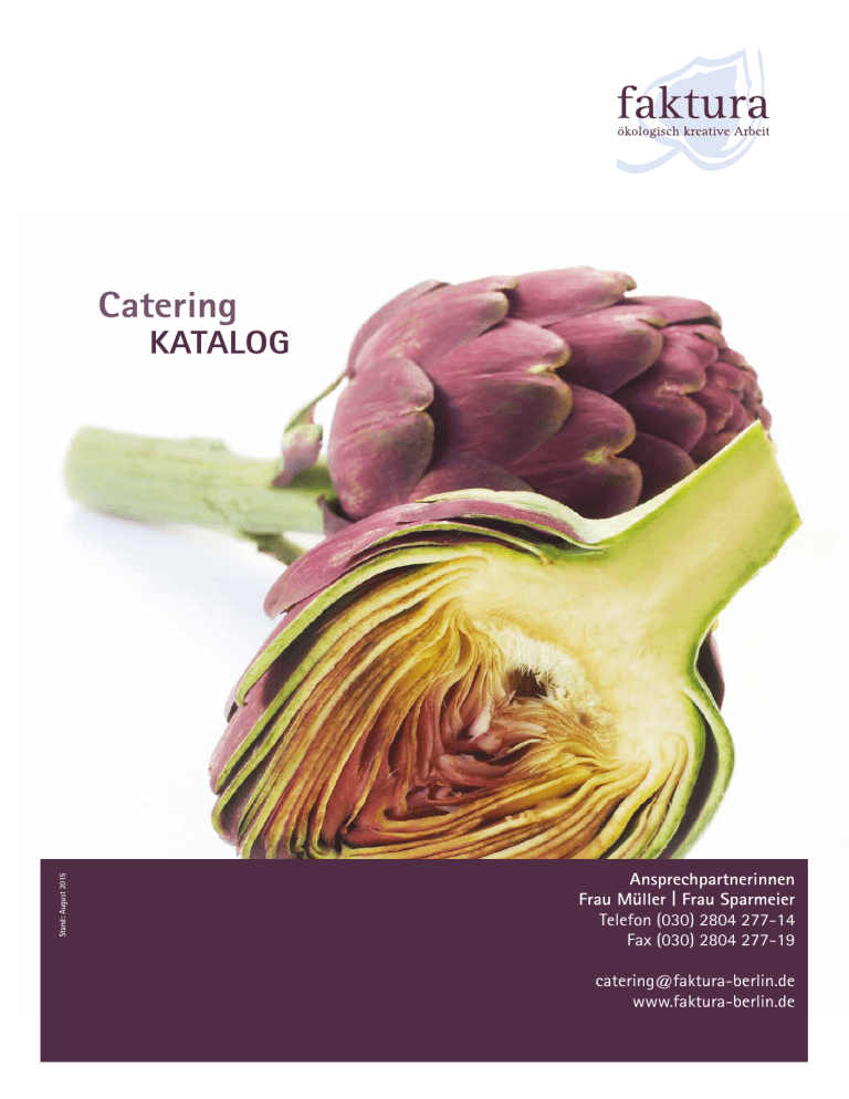 Catering Stand: August 2015 Katalog Ansprechpartnerinnen Frau Müller | Frau Sparmeier Telefon (030) 2804 277-14 Fax (030) 2804 277-19 [email protected] www.faktura-berlin.de Unser Angebot Wraps Belegte Brötchen Fleisch- und Gemüsebällchen Herzhafte Kuchen Spieße Gefüllte Eier Kleine gefüllte Teigtaschen Pumpernickel Rohkostplatten Antipasti Salate Suppen Brotkorb Kuchen und Gebäck Desserts Bei Sonderwünschen sprechen Sie uns bitte an. faktura gGmbH | Telefon (030) 2804 277-14 | Fax (030) 2804 277-19 | [email protected] | www.faktura-berlin.de Unser Angebot Wraps ein Wrap = 4 kleine Stücke gefüllt mit: Frischkäse, Rucola, Kirschtomaten, Karotten 4,90 € dazu Hähnchenbrust 5,30 € dazu Thunfisch und Zwiebeln 5,30 € dazu Räucherlachs 6,80 € Eisbergsalat, Frischkäse, Schafskäse, Oliven, Zwiebel, Olivenöl 5,30 € Belegte halbe Brötchen pro Sorte 2 Stück belegt mit: Kochschinken 2,50 € Salami 2,50 € rohem Schinken 3,00 € Putenbrust 3,00 € Räucherlachs 3,20 € Schnittkäse 2,50 € Brie 3,20 € Kräuterquark 2,50 € Fleisch- und Gemüsebällchen HackfleischbällchenStk. 1,20 € GrünkerntalerStk. 1,50 € Herzhafte Kuchen Gemüsekuchen Stk. 2,20 € Zwiebelkuchen Stk. 2,00 € Spinat-Schafskäse-Kuchen Stk. 2,20 € Bitte angeben, ob ein großes Stück oder vier kleine Stücke gewünscht sind! faktura gGmbH | Telefon (030) 2804 277-14 | Fax (030) 2804 277-19 | [email protected] | www.faktura-berlin.de Unser Angebot SpieSSe Hähnchenspieß mit Ananas und Curry klein Stk. 1,10 € Kirschtomaten-Mozzarella-SpießkleinStk. 0,90 € Käse-Trauben-SpießkleinStk. 0,90 € ObstspießkleinStk. 0,90 € Gefüllte halbe Eier pro Sorte 2 Stück gefüllt mit: Tomatencreme 1,70 € Schnittlauchcreme 1,70 € leichter Senfcreme 1,70 € Mindestabnahmemenge 10 Stück Kleine gefüllte Teigtaschen Samosas gefüllt mit: Kartoffel, Lauch, Bohnen, CurryStk. 0,75 € PUMPERNICKEL belegt mit: Avocadocreme und CherrytomateStk. 1,50 € HähnchenbruststreifenStk. 1,70 € Parmaschinken und MeloneStk. 1,80 € Matjes, Gurke und DillStk. 1,70 € Räucherlachs und SahnemeerrettichStk. 1,80 € Ziegenfrischkäse und TraubeStk. 1,80 € Salami und OliveStk. 1,00 € Brie und TraubeStk. 1,00 € faktura gGmbH | Telefon (030) 2804 277-14 | Fax (030) 2804 277-19 | [email protected] | www.faktura-berlin.de Unser Angebot Rohkost Rohkostplatte mit gemischten GemüsenPort. 2,00 € Dazu bieten wir verschiedene Dips an: Gurke-JoghurtPort. 2,00 € KräuterPort. 2,00 € Knoblauch Port. 2,00 € CurryPort. 2,00 € Tomate-BasilikumPort. 2,00 € AvocadoPort. 2,30 € Antipasti mariniert: Paprika, Zucchini und ZwiebelPort. 1,90 € ArtischockenherzenPort. 2,10 € gebratene ChampignonPort. 2,10 € Salate Weißkohlsalat 10 Port. 13,00 € (Essig, Öl, Gewürze) Nudelsalat 10 Port. 15,00 € (Mayonnaise, Joghurt, Erbsen, Mais, Äpfel) Eiersalat10 Port. 16,00 € (Mayonnaise, Joghurt, Gewürze, Kräuter) Kartoffelsalat 10 Port. 15,00 € (Mayonnaise, Jogh urt, Äpfel, Gewürzgurke, Gewürze, Kräuter) Kartoffelsalat 10 Port. 15,00 € (Essig, Öl, Äpfel, Gewürzgurke, Gewürze, Kräuter) Hirtensalat mit Essig-Öl-Dressing 10 Port. 16,00 € (Eisberg, Essig, Öl, Gewürze, Kräuter, Schafskäse) Geflügelsalat mit Ananas 10 Port. 22,00 € (Mayonnaise, Joghurt, Mandarinen, Erbsen) Rucola mit Kirschtomaten und Parmesanstreifen, dazu eine Vinaigrette 10 Port. 22,00 € Suppen Chili con Carne 10 Port. 30,00 € Kartoffel-Lauch-Suppe10 Port. 27,00 € Gemüsesuppe mit Knoblauchcroûtons10 Port. 27,00 € Gulaschsuppe10 Port. 32,00 € faktura gGmbH | Telefon (030) 2804 277-14 | Fax (030) 2804 277-19 | [email protected] | www.faktura-berlin.de Unser Angebot Brotkorb verschiedene Brötchen– und BrotsortenPort. 2,00 € Gebäck Mini-MuffinStk. 0,50 € Mini-WindbeutelStk. 0,50 € Mini-PfannkuchenStk. 0,50 € Hausgebackene Kuchen vom Blech Käsekuchen Blech 21,00 € Mohnkuchen Blech 21,00 € Pflaumenstreusel Blech 20,00 € KirschstreuselBlech 20,00 € Obststreusel (Obst der Saison)Blech 20,00 € Bitte angeben, ob 15 große Stücke oder 60 kleine Stücke gewünscht sind! Desserts Rote Grütze mit VanillesaucePort. 3,00 € SchokoladenmoussePort. 3,00 € ObstsalatPort. 3,00 € Obst Port. 1,90 € faktura gGmbH | Telefon (030) 2804 277-14 | Fax (030) 2804 277-19 | [email protected] | www.faktura-berlin.de Lieferbedingungen Innerhalb des S-Bahn-Ringes: Lieferung 10,00 € Außerhalb des S-Bahn-Ringes: Lieferung 20,00 € Alle Preise sind Nettopreise, zzgl. Mwst. Ansprechpartnerinnen Dörte Müller | Anke Sparmeier Telefon (030) 2804 277-14 Fax (030) 2804 277-19 [email protected] www.faktura-berlin.de Kantinen R. Wir bewirtschaften die Kantine des Bezirksamtes Mitte in der Karl-Marx-Allee, sowie die Kantine in der Rungestraße 19. Dort bieten wir Ihnen: Frühstück von Montag bis Freitag von 7:30 bis 11:00 Uhr Mittagstisch von Montag bis Donnerstag von 11:00 bis 14:00 Uhr, am Freitag bis 13:30 Uhr AL GR UN ER ST KAR -AL LEE EX AN Rungestraße 19 10179 Berlin RG BE EN RK TS HT MA TR . LIC . EN ST R LZ BRÜCK SPREE ER STR . SC HIL . LIN TR GS RS TR. DE S JANNOWITZBRÜCKE HO Kantine faktura gGmbH 19 Telefon (030) 9145 68-51 Fax (030) 2804 277-19 Bildnachweis: Seite 1 - Barbara Pheby, Seite 2 - Anna Kucherova, Seite 3 - margo555, Seite 4 - Yasonya, Seite 5 - Barbara Pheby, Seite 6 - Yves Roland U OH MS TR. RUN GES TR. HEINRICHHEINE-STR. Telefon (030) 2453 47-33 Fax (030) 2453 47-34 ARX SCHILLINGSTR. U U Kantine faktura gGmbH Bezirksamt Mitte Karl-Marx-Allee 31 10178 Berlin 31 L-M KÖP ENI CKE RS TR . Stand: August 2015
