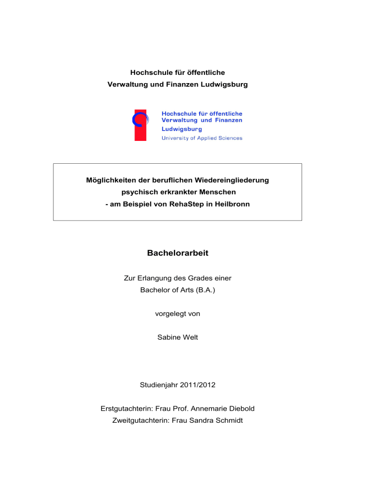 Hochschule für öffentliche Verwaltung und Finanzen Ludwigsburg Möglichkeiten der beruflichen Wiedereingliederung psychisch erkrankter Menschen - am Beispiel von RehaStep in Heilbronn Bachelorarbeit Zur Erlangung des Grades einer Bachelor of Arts (B.A.) vorgelegt von Sabine Welt Studienjahr 2011/2012 Erstgutachterin: Frau Prof. Annemarie Diebold Zweitgutachterin: Frau Sandra Schmidt Seite II Inhaltsverzeichnis Inhaltsverzeichnis....................................................................II Abkürzungsverzeichnis...........................................................V Abbildungsverzeichnis...........................................................VI Verzeichnis der Anlagen.......................................................VII 1. Einleitung..............................................................................1 2. Psychische Krankheiten......................................................3 2.1 Definitionen......................................................................................3 2.1.1 Krankheit.........................................................................................3 2.1.2 Behinderung....................................................................................5 2.2 Entstehung und Auslöser...............................................................6 2.3 Überblick über die Krankheitsfelder..............................................7 2.3.1 Psychosen......................................................................................7 2.3.2 Persönlichkeitsstörungen................................................................8 2.3.3 Neurosen........................................................................................9 2.3.4 Depressionen..................................................................................9 2.3.5 Suchterkrankungen.......................................................................10 3. Psychische Erkrankungen und das Arbeitsleben...........12 3.1 Häufige Probleme psychisch Kranker mit ihrem Beruf.............12 Seite III 3.1.1 Anforderungen..............................................................................12 3.1.2 Schwierigkeiten.............................................................................14 3.1.3 Bedeutung von Arbeit für psychisch Kranke................................16 3.2 Auswirkungen auf den „Allgemeinen Arbeitsmarkt“...............18 3.2.1 Definition „allgemeiner Arbeitsmarkt“...........................................18 3.2.2 Ausmaß psychischer Krankheiten................................................20 4. Leistungen zur Teilhabe am Arbeitsleben für psychisch Kranke.................................................................................23 4.1 Voraussetzung und Begründung für die Gewährung beruflicher Rehabilitation...............................................................................23 4.2 Überblick über die Möglichkeiten der beruflichen Rehabilitation .......................................................................................................26 4.3 Anforderungen an LTA für psychisch Kranke...........................28 4.4 Ablauf einer beruflichen Rehabilitation am Beispiel von RehaStep in Heilbronn................................................................30 4.4.1 Beschreibung der Einrichtung......................................................31 4.4.2 Konzept.........................................................................................32 4.4.3 Individuelle Förderung..................................................................33 4.4.4 Step 1............................................................................................34 4.4.5 Step 2............................................................................................34 4.4.6 Erfolge...........................................................................................35 5. Sozialrechtliche Betrachtung der LTA.............................37 5.1 Leistungen zur Teilhabe am Arbeitsleben..................................37 5.2 Zuständigkeiten und Ziele der Sozialleistungsträger................38 Seite IV 5.2.1 Die gesetzliche Rentenversicherung............................................39 5.2.2 Die gesetzliche Unfallversicherung..............................................40 5.2.3 Die Agentur für Arbeit...................................................................40 6. Empirische Untersuchungen zum Erfolg der Maßnahme ..............................................................................................41 6.1 Positive und negative Auswirkungen des Konzeptes auf die Teilnehmer...................................................................................42 6.2 Auswirkungen auf die Psyche und soziale Aspekte..................44 6.3 Auswirkungen auf die berufliche Perspektive der Teilnehmer .......................................................................................................47 7. Fazit.....................................................................................49 Anlage 1..................................................................................51 Anlage 2..................................................................................52 Anlage 3..................................................................................53 Anlage 4..................................................................................54 Anlage 5..................................................................................55 Anlage 6..................................................................................56 Anlage 7..................................................................................57 Literaturverzeichnis...............................................................58 Erklärung.................................................................................64 Seite V Abkürzungsverzeichnis LTA Leistungen zur Teilhabe am Arbeitsleben ICF In