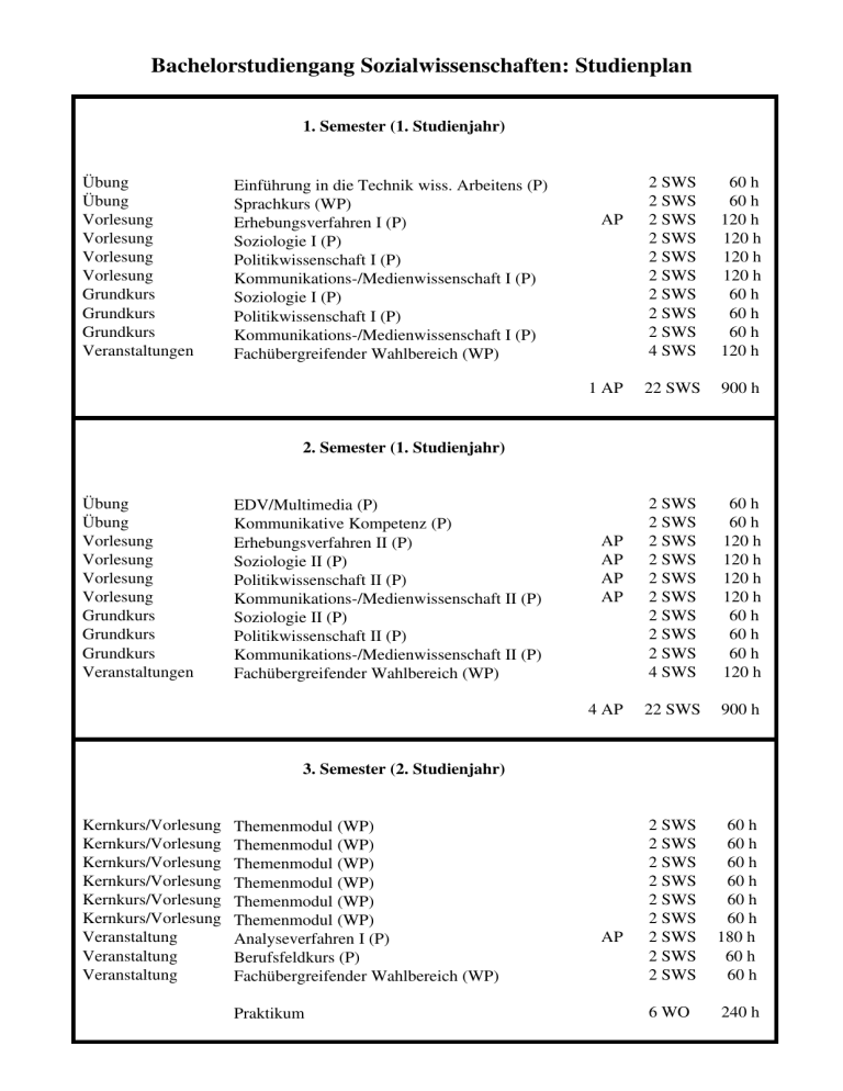 Bachelorstudiengang Sozialwissenschaften: Studienplan 1. Semester (1. Studienjahr) Übung Übung Vorlesung Vorlesung Vorlesung Vorlesung Grundkurs Grundkurs Grundkurs Veranstaltungen Einführung in die Technik wiss. Arbeitens (P) Sprachkurs (WP) Erhebungsverfahren I (P) Soziologie I (P) Politikwissenschaft I (P) Kommunikations­/Medienwissenschaft I (P) Soziologie I (P) Politikwissenschaft I (P) Kommunikations­/Medienwissenschaft I (P) Fachübergreifender Wahlbereich (WP) AP 2 SWS 2 SWS 2 SWS 2 SWS 2 SWS 2 SWS 2 SWS 2 SWS 2 SWS 4 SWS 60 h 60 h 120 h 120 h 120 h 120 h 60 h 60 h 60 h 120 h 1 AP 22 SWS 900 h 2 SWS 2 SWS 2 SWS 2 SWS 2 SWS 2 SWS 2 SWS 2 SWS 2 SWS 4 SWS 2. Semester (1. Studienjahr) Übung Übung Vorlesung Vorlesung Vorlesung Vorlesung Grundkurs Grundkurs Grundkurs Veranstaltungen EDV/Multimedia (P) Kommunikative Kompetenz (P) Erhebungsverfahren II (P) Soziologie II (P) Politikwissenschaft II (P) Kommunikations­/Medienwissenschaft II (P) Soziologie II (P) Politikwissenschaft II (P) Kommunikations­/Medienwissenschaft II (P) Fachübergreifender Wahlbereich (WP) AP AP AP AP 4 AP 60 h 60 h 120 h 120 h 120 h 120 h 60 h 60 h 60 h 120 h 22 SWS 900 h 3. Semester (2. Studienjahr) Kernkurs/Vorlesung Kernkurs/Vorlesung Kernkurs/Vorlesung Kernkurs/Vorlesung Kernkurs/Vorlesung Kernkurs/Vorlesung Veranstaltung Veranstaltung Veranstaltung Themenmodul (WP) Themenmodul (WP) Themenmodul (WP) Themenmodul (WP) Themenmodul (WP) Themenmodul (WP) Analyseverfahren I (P) Berufsfeldkurs (P) Fachübergreifender Wahlbereich (WP) Praktikum AP 2 SWS 60 h 2 SWS 60 h 2 SWS 60 h 2 SWS 60 h 2 SWS 60 h 2 SWS 60 h 2 SWS 180 h 2 SWS 60 h 2 SWS 60 h 6 WO 240 h 1 AP 18 SWS 900 h 4. Semester (2. Studienjahr) Kernkurs/Vorlesung Kernkurs/Vorlesung Kernkurs/Vorlesung Kernkurs/Vorlesung Veranstaltung Themenmodul (WP) Themenmodul (WP) Themenmodul (WP) Themenmodul (WP) Analyseverfahren II (P) AP AP AP Praktikum 3 AP 2 SWS 2 SWS 2 SWS 2 SWS 2 SWS 6 WO 10 SWS 60 h 60 h 180 h 180 h 180 h 2 SWS 2 SWS 2 SWS 4 SWS 2 SWS 6 SWS 18 SWS 60 h 60 h 240 h 300 h 60 h 180 h 240 h 900 h 5. Semester (3. Abschlußjahr) Hauptkurs Hauptkurs Hauptkurs Veranstaltung Veranstaltung Veranstaltung Themenmodul (WP) Themenmodul (WP) Themenmodul (WP) Lehrforschungsprojekt (WP) Praktikumskurs (P) Fachübergreifender Wahlbereich (WP) AP AP 2 AP 900 h 6. Semester (Abschlußjahr) Hauptkurs Hauptkurs Veranstaltungen Themenmodul (WP) Themenmodul (WP) Fachübergreifender Wahlbereich (WP) AP AP Bachelorarbeit (studienbegleitend) Die Bachelorarbeit sollte spätestens am 1. April angemeldet werden! 2 AP 13 AP SWS = Semesterwochenstunde CP = Kreditpunkt AP = Abschlußprüfung P = Pflichtveranstaltung WP = Wahlpflichtveranstaltung WO = Wochen 2 SWS 240 h 2 SWS 240 h 2 SWS 60 h 360 h 6 SWS 900 h 96 SWS 5400 h 17.5.08