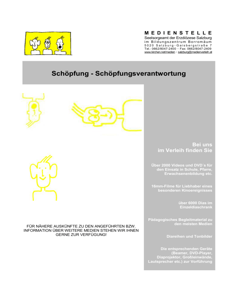 M E D I E N S T E L L E Seelsorgeamt der Erzdiözese Salzburg im Bil dungszent r um Bor r om äum 5020 Salzburg٠Gaisbergstraße 7 Tel.: 0662/8047-2400 ٠ Fax: 0662/8047-2409 www.kirchen.net/medien ٠ [email protected] Schöpfung - Schöpfungsverantwortung Bei uns im Verleih finden Sie Über 2000 Videos und DVD´s für den Einsatz in Schule, Pfarre, Erwachsenenbildung etc. 16mm-Filme für Liebhaber eines besonderen Kinoereignisses über 6000 Dias im Einzeldiaschrank FÜR NÄHERE AUSKÜNFTE ZU DEN ANGEFÜHRTEN BZW. INFORMATION ÜBER WEITERE MEDIEN STEHEN WIR IHNEN GERNE ZUR VERFÜGUNG! Pädagogisches Begleitmaterial zu den meisten Medien Diareihen und Tonbilder Die entsprechenden Geräte (Beamer, DVD-Player, Diaprojektor, Großleinwände, Lautsprecher etc.) zur Vorführung Wunderbare Welt 048477 Bilderbuchkino Martina Steinkühler/ D 2010/ gezeichnet/ 17; DVD/ ab4 Wie die Welt erschaffen wurde. „Wunderbare Welt“ erzählt die Entstehung der Erde als Schöpfungsgeschichte originell und mit viel Witz. Das hymnische Lob der Schöpfung des ersten biblischen Schöpfungsberichtes ist überzeugend umgesetzt. Im ersten Teil wird deutlich, wie wunderschön Gott die Welt geschaffen hat. Ein wunderbarer Teil der Schöpfung sind wir Menschen. Doch damit endet die Geschichte nicht. Die Autoren zeigen im zweiten Teil, wie viel wir Menschen schon zerstört haben und dass es Zeit ist, uns wieder darauf zu besinnen, verantwortungsbewusst mit der Welt umzugehen. Die liebevollen Illustrationen und ausklappbaren Überraschungen machen das Buch für Kinder und Erwachsene zu einem Vergnügen. Schöpfung entdecken 108474 Gerald von Velasco/ D 2010/ Animationsfilm/ 11min/ ab 6 Schöpfung erleben und bewahren sind bereits in der Grundschule zentrale Themen des Religions-und Ethikunterrichts. Eine verfilmte Bildergeschichte nach den Zeichnungen des Künstlers Dieter Konsek erzählt lebendig und kindgerecht die Erschaffung der Welt nach Genesis 1,1-2,4a.Dabei kommt die stereotype, formelhafte Gestaltung der priesterschriftlichen Schöpfungsdarstellung auch weitgehend im Filmtext zur Geltung. Zusätzliche Bilder,Hörbeispiele und umfangreiches Begleitmaterial ermöglichen den Schülerinnen und Schülern Schöpfung im Alltag zu entdecken, den Sinn der Ordnung zu erahnen und einen Zugang zur Bewahrung der Erde zu finden. Schlagwort: Bibel, Altes Testament, Genesis, Schöpfung, Natur, Gottesbild, Menschenbild Garten Eden, Der (Glut unter der Asche 1) 026701 Iris Pollatschek/ D 1999/ Dokumentation/ 45 Min./ ab 15 Die zerbrechliche Schöpfung Die erste Folge fragt nach dem Mythos vom Anfang. Vor dem Hintergrund des biblischen Schöpfungsberichts werden Menschen unserer Zeit vorgestellt, die sich in besonderer Weise für einen bewussteren Umgang mit der wunderbaren und zugleich zerbrechlichen Schöpfung auseinandersetzen: ein erfolgreicher deutscher Solar-Anlagen-Produzent, eine niederländische Wasserbau-Ingenieurin, ein bolivianischer Agrartechniker in Israel, ein Klimaexperte und eineLandwirtin. Die Dokumentation kommt zu dem Schluss, dass ohne neue Ehrfurcht vor dem Leben, ohne einen neuen Respekt vor dem Geschaffenen, der Mensch des 21. Jahrhunderts bei allem wissenschaftlich-technischen Wissen die Orientierung verlieren könnte. Schlagwort: Bibel, Altes Testament, Urgeschichte, Schöpfung Mikrokosmos 022792 Claude Nuridsany & Marie Pérennou/ F 1995/ Dokumentarfilm/ 77 Min./ ab 10 Drehort" von "Mikrokosmos" ist ein kleines Wiesenstück irgendwo in Südfrankreich. Der Film bringt uns die Welt der Insekten sehr nahe: stets ist man auf Augenhöhe mit den Tieren, die überdimensional das Bild füllen und verfolgt, wie sie den oft lebensgefährlichen Alltag meistern. Schlagwort: Schöpfung, Natur, Tiere, Insekten, Langspielfilme, Meditation Home 108478 Yann Arthus-Bertrand/ F 2009/ Dokumentarfilm/ 88min/ ab 10 Eine Reise in 50 Länder. Die schönsten Bilder unserer Erde. Und ein Plädoyer für ihre Zukunft. Über vier Milliarden Jahre herrschte auf der Erde ein empfindliches, aber stabiles Gleichgewicht. Weniger als 200.000 Jahre hat der Mensch gebraucht, um dieses Gleichgewichtvollkommen durcheinander zu bringen. Globale Erwärmung, Verknappung der Bodenschätze, bedrohte Artenvielfalt: der Mensch gefährdet die Grundlagen seiner eigenen Existenz. Der Film "HOME" nimmt uns mit auf eine Reise um die Welt. Für die Luftaufnahmen des Filmsreiste Yann Arthus-Bertrand mit seinem Team in über 50 Länder. Die Bilder verdeutlichenkomplexe Zusammenhänge, ohne dass es komplizierter Erklärungen bedarf. Wir sehen überwältigende Panoramen unserer natürlichen Umwelt, aber auch die Narben, die die menschlicheZivilisation auf der Erde hinterlässt. "HOME" will aufrütteln und uns bewusst machen: es ist Zeit, zu handeln, um unseren Heimatplaneten zu retten! Schlagwort: Natur, Schöpfung, Umweltschutz, Nachhaltigkeit, Weltverantwortung 2 Urknall und Sternenstaub 026208 Wolf-Rüdiger Schmidt/ D 1998/ Dokumentation/ 29 Min./ ab 18 Ist die Welt durch Urknall oder durch Schöpfung entstanden? Haben sich die Arten entwickelt oder sind sie geschaffen worden? Schließt die eine Alternative die andere notwendig aus? Sechs Naturwissenschaftler und ein Theologe werden in der vorliegenden Dokumentation zur Entstehung und Entwicklung der Erde befragt. Sie schlägt eine Brücke im Dialog zwischen Naturwissenschaft und Religion, vermittelt gleichzeitig anschaulich wesentliche Informationen zu Schöpfung und Evolution. Teufel heißt Darwin, Der 107895 Dieter Moers und Frank Papenbrook/ D 2006/ Dokumentation/ 30 Min./ ab 16 Die Dokumentation versucht einen Überblick zu vermitteln zu den Themen Schöpfungslehre,Evolution, Kreationismus und Intelligent Design. Insbesondere den beiden zuletzt genanntenBewegungen gilt das Interesse. Einerseits sollen Ursprünge und Entwicklungen der Diskussion um den Glauben an die Schöpfung und die naturwissenschaftlich ausgerichteten Modelle zur Entstehung der Erde und des Lebens aufgezeigt werden. Andererseits