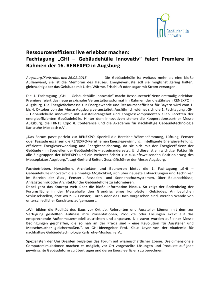 Ressourceneffizienz live erlebbar machen: Fachtagung „GHI – Gebäudehülle innovativ“ feiert Premiere im Rahmen der 16. RENEXPO in Augsburg Augsburg/Karlsruhe, den 26.02.2015 Die Gebäudehülle ist weitaus mehr als eine bloße Außenwand, sie ist die Membran des Hauses: Energieverluste soll sie möglichst gering halten, gleichzeitig aber das Gebäude mit Licht, Wärme, Frischluft oder sogar mit Strom versorgen. Die 1. Fachtagung „GHI – Gebäudehülle innovativ“ macht Ressourceneffizienz erstmalig erlebbar. Premiere feiert das neue praxisnahe Veranstaltungsformat im Rahmen der diesjährigen RENEXPO in Augsburg. Die Energiefachmesse zur Energiewende und Ressourceneffizienz für Bayern wird vom 1. bis 4. Oktober von der Messe Augsburg veranstaltet. Ausführlich widmet sich die 1. Fachtagung „GHI – Gebäudehülle innovativ“ mit Ausstellerangebot und Kongresskomponenten allen Facetten der energieeffizienten Gebäudehülle. Hinter dem innovativen stehen die Kooperationspartner Messe Augsburg, die HINTE Expo & Conference und die Akademie für nachhaltige Gebäudetechnologie Karlsruhe-Mosbach e.V.. „Das Forum passt perfekt zur RENEXPO. Speziell die Bereiche Wärmedämmung, Lüftung, Fenster oder Fassade ergänzen die RENEXPO-Kernthemen Energiegewinnung, intelligente Energieverteilung, effiziente Energieverwendung und Energiespeicherung, da sie sich mit der Energieeffizienz der Gebäude - im Speziellen der Gebäudehülle – auseinandersetzt. Und diese ist ein wichtiger Faktor für alle Zielgruppen der RENEXPO und ein weiterer Schritt zur zukunftsweisenden Positionierung des Messeplatzes Augsburg.“, sagt Gerhard Reiter, Geschäftsführer der Messe Augsburg. Fachbetrieben, Herstellern, Architekten und Bauherren bietet die 1. Fachtagung „GHI – Gebäudehülle innovativ“ die einmalige Möglichkeit, sich über neueste Entwicklungen und Techniken im Bereich der Glas-, Fenster-, Fassaden- und Sonnenschutzsystemen, über Bauanschlüsse, Anlagetechnik oder Architektur der Gebäudehülle zu informieren. Dabei geht das Konzept weit über die bloße Information hinaus. So zeigt der Bodenbelag der Forumsfläche in der Messehalle den Grundriss eines kompletten Gebäudes. An baulichen Schlüsselstellen, dort wo z. B. Fenster, Türen oder das Dach vorgesehen sind, werden Wände von unterschiedlicher Konsistenz aufgemauert. „Wir bilden die Realität des Baus vor Ort ab. Referenten und Aussteller können mit dem zur Verfügung gestellten Aufmass ihre Präsentationen, Produkte oder Lösungen exakt auf das entsprechende Außenmauermodell ausrichten und anpassen. Nie zuvor wurden auf einer Messe Bedingungen geschaffen, die so nah an der Praxis sind - eine Revolution für Aussteller und Messebesucher gleichermaßen.“, so GHI-Ideengeber Prof. Klaus Layer von der Akademie für nachhaltige Gebäudetechnologie Karlsruhe-Mosbach e.V.. Spezialisten der Uni Dresden begleiten das Forum auf wissenschaftlicher Ebene. Dreidimensionale Computersimulationen machen es möglich, vor Ort vorgestellte Lösungen und Produkte auf jede gewünschte Gebäudeform zu übertragen und deren Energieeffizienz zu berechnen. „Ich sehe beachtliches Potenzial für dieses innovative Konzept - nicht nur für den ganzen süddeutschen Raum, sondern auch für Österreich und die Schweiz. Die Themen rund um die Gebäudehülle schaffen eine einzigartige Schnittstelle zwischen Industrie, Handwerk, Wissenschaft und Politik, insbesondere vor dem Hintergrund aktueller Diskussionen zur Energiewende. Diesen Mix aus praktischen Anwendungen und wissenschaftlichem Fachkongress leistet keine andere klassische Bau- oder Handwerksmesse. “, betont HINTE Geschäftsführer Christoph Hinte. Messe, Kongress und speziell das Forum Gebäudehülle innovativ werden durch die Messe Augsburg deutschlandweit sowie in Österreich und der Schweiz über Fachmedien, Tageszeitungen, Verbände und Vereine, fachrelevante Universitäten und Fachhochschulen sowie durch ausstellende Firmen beworben. „Das Potenzial des GHI Forums für eine praxisfokussierte Produkt- und Leistungspräsentationen wird bereits erkannt. Branchengrößen wie Uniglas, Otto Chemie, Zöllner Fenstertechnik, Heroal, Warema, Förch oder Würth haben Ihre Teilnahme am GHI-FORUM bereits signalisiert.“, so Prof. Klaus Layer. Messe Augsburg ASMV GmbH: Die Messe Augsburg als dri größter Messeplatz in Bayern ist ein Wirtscha smotor mit Ausstrahlung weit über die Grenzen Bayerisch-Schwabens hinaus. Augsburg punktet mit einem bestens strukturierten und auch international gut erreichbaren Messegelände, persönlichem Service und dem Charme der zweitältesten Stadt Deutschlands. Die Messe Augsburg ist Full-Service-Partner für Messen und Events: 12 Hallen mit 48.000 m² Bruttofläche, 10.000 m² Freigelände, ein Tagungscenter, vier Eingangsbereiche, beste Verkehrsanbindung sowie 2.400 Parkplätze in unmittelbarer Nähe bieten eine Vielzahl an individuell planbaren Veranstaltungsmöglichkeiten. Weitere Informationen unter: www.messeaugsburg.de HINTE Expo & Conference: Mit mehr als 60 Jahren Erfahrung und über 600 erfolgreich durchgeführte Veranstaltungen im Inund Ausland zählt HINTE zu den renommierten privaten Messe- und Kongressveranstaltern in Deutschland. Standortunabhängig organisiert HINTE namhafte Branchenevents sowie internationale Leitmessen und Kongresse im B2B-Bereich. Weitere Informationen unter: www.hinte-messe.de Akademie für nachhaltige Gebäudetechnologie Karlsruhe-Mosbach e.V.: Die Akademie für nachhaltige Gebäudetechnologie Karlsruhe-Mosbach e.V. beschäftigt sich mit der Ressourceneffizienz von Gebäudetechnologien, insbesondere mit Glas-, Fenster-, Türen-, Sonnenschutz- und Fassadentechnologien. Akademievorsitzender Prof. Dr. h.c. Klaus Layer ist gelernter Tischler- und Glasermeister, zertifizierter Thermograph, und zusätzlich öffentlich bestellter und vereidigter Sachverständiger der Handwerkskammer Mannheim, Bauphysiker und Energieberater und Dozent f