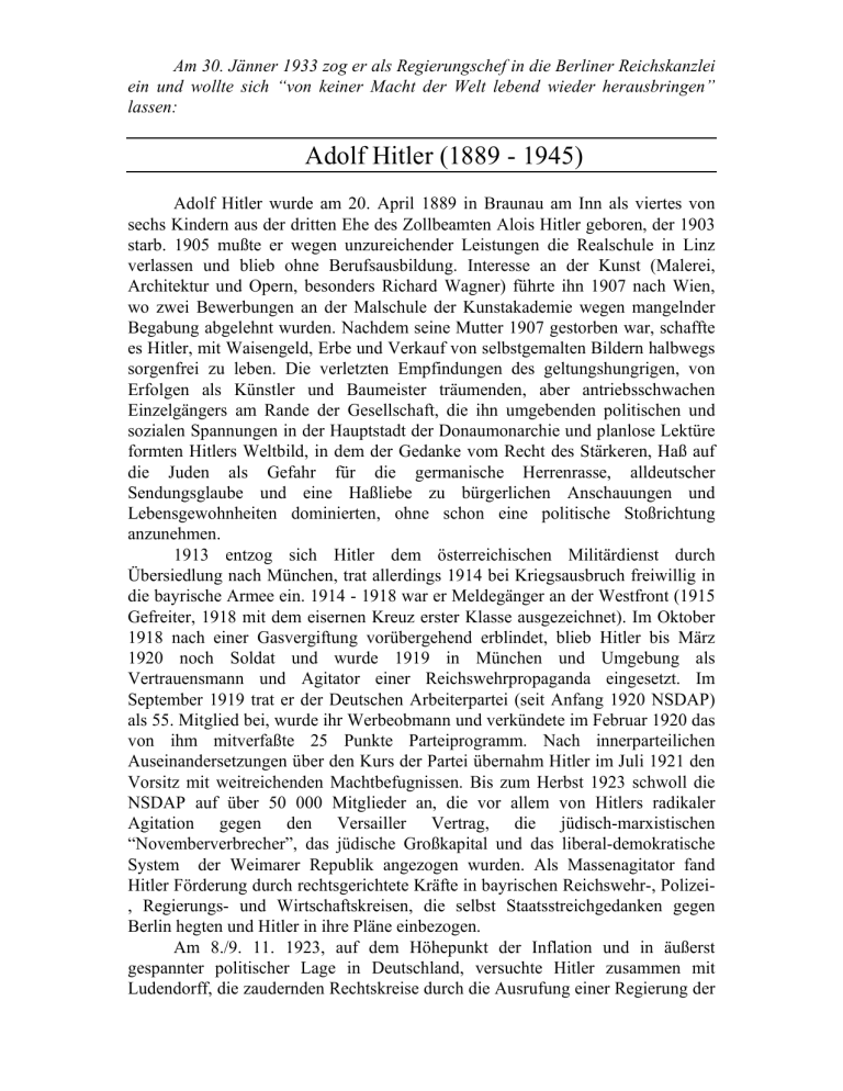 Am 30. Jänner 1933 zog er als Regierungschef in die Berliner Reichskanzlei ein und wollte sich “von keiner Macht der Welt lebend wieder herausbringen” lassen: Adolf Hitler (1889 - 1945) Adolf Hitler wurde am 20. April 1889 in Braunau am Inn als viertes von sechs Kindern aus der dritten Ehe des Zollbeamten Alois Hitler geboren, der 1903 starb. 1905 mußte er wegen unzureichender Leistungen die Realschule in Linz verlassen und blieb ohne Berufsausbildung. Interesse an der Kunst (Malerei, Architektur und Opern, besonders Richard Wagner) führte ihn 1907 nach Wien, wo zwei Bewerbungen an der Malschule der Kunstakademie wegen mangelnder Begabung abgelehnt wurden. Nachdem seine Mutter 1907 gestorben war, schaffte es Hitler, mit Waisengeld, Erbe und Verkauf von selbstgemalten Bildern halbwegs sorgenfrei zu leben. Die verletzten Empfindungen des geltungshungrigen, von Erfolgen als Künstler und Baumeister träumenden, aber antriebsschwachen Einzelgängers am Rande der Gesellschaft, die ihn umgebenden politischen und sozialen Spannungen in der Hauptstadt der Donaumonarchie und planlose Lektüre formten Hitlers Weltbild, in dem der Gedanke vom Recht des Stärkeren, Haß auf die Juden als Gefahr für die germanische Herrenrasse, alldeutscher Sendungsglaube und eine Haßliebe zu bürgerlichen Anschauungen und Lebensgewohnheiten dominierten, ohne schon eine politische Stoßrichtung anzunehmen. 1913 entzog sich Hitler dem österreichischen Militärdienst durch Übersiedlung nach München, trat allerdings 1914 bei Kriegsausbruch freiwillig in die bayrische Armee ein. 1914 - 1918 war er Meldegänger an der Westfront (1915 Gefreiter, 1918 mit dem eisernen Kreuz erster Klasse ausgezeichnet). Im Oktober 1918 nach einer Gasvergiftung vorübergehend erblindet, blieb Hitler bis März 1920 noch Soldat und wurde 1919 in München und Umgebung als Vertrauensmann und Agitator einer Reichswehrpropaganda eingesetzt. Im September 1919 trat er der Deutschen Arbeiterpartei (seit Anfang 1920 NSDAP) als 55. Mitglied bei, wurde ihr Werbeobmann und verkündete im Februar 1920 das von ihm mitverfaßte 25 Punkte Parteiprogramm. Nach innerparteilichen Auseinandersetzungen über den Kurs der Partei übernahm Hitler im Juli 1921 den Vorsitz mit weitreichenden Machtbefugnissen. Bis zum Herbst 1923 schwoll die NSDAP auf über 50 000 Mitglieder an, die vor allem von Hitlers radikaler Agitation gegen den Versailler Vertrag, die jüdisch-marxistischen “Novemberverbrecher”, das jüdische Großkapital und das liberal-demokratische System der Weimarer Republik angezogen wurden. Als Massenagitator fand Hitler Förderung durch rechtsgerichtete Kräfte in bayrischen Reichswehr-, Polizei, Regierungs- und Wirtschaftskreisen, die selbst Staatsstreichgedanken gegen Berlin hegten und Hitler in ihre Pläne einbezogen. Am 8./9. 11. 1923, auf dem Höhepunkt der Inflation und in äußerst gespannter politischer Lage in Deutschland, versuchte Hitler zusammen mit Ludendorff, die zaudernden Rechtskreise durch die Ausrufung einer Regierung der nationalen Revolution zum Handeln zu zwingen. Der dilettantisch angelegte Hitlerputsch scheiterte. Die NSDAP wurde verboten, Hitler verhaftet und vom Münchner Volksgericht am 1. 4. 1924 mit einigen Mittätern zu 5 Jahren Haft verurteilt. Da die eigentlichen Hintergründe des Putsches im Prozeß verschleiert wurden, konnte Hitler seine aktive Rolle sehr vorteilhaft herausstreichen. Bereits im Dezember 1924 wurde er aus der Festung Landsberg, wo er den ersten Band seiner Bekenntnis- und Programmschrift “Mein Kampf” (erschienen 1925, 2. Band 1927) verfaßt hatte, wieder entlassen und erreichte die Aufhebung des Verbots der Partei und begann im Februar 1925 mit ihrem Wiederaufbau, jetzt von vornherein reichsweit. In Folge der vorübergehenden Konsolidierung der politischen und wirtschaftlichen Verhältnisse in Deutschland und auch wegen des Redeverbots, das zwischen 1925 und 1928 in den meisten Reichsländern gegen ihn verhängt wurde, gewann die Partei nur allmählich an Boden. Immerhin sammelte sie in diesen Jahren einen verläßlichen Kader von Unterführern und Gefolgsleuten, die Hitler nahezu vorbehaltlos ergeben waren, und formte sich zur Führerpartei, in der sich die Willensbildung nach dem Schema von Befehl und Gehorsam vollziehen sollte. Innerhalb der Partei wurde Hitler zum Objekt eines bald auch propagandistisch genutzten Führerkults. Den Durchbruch zur Massenpartei, der Hitler in seiner Führerrolle bestätigte, erreichte die NSDAP seit 1929 unter den für sie günstigen Umständen der Weltwirtschaftskrise (1932: Über 6 Millionen Arbeitslose) und des rapid anwachsenden Zweifels der Bevölkerung an der Fähigkeit der demokratischen Kräfte, mit den Problemen fertig zu werden. In dieser Lage wuchs Hitler eine Schlüsselrolle zu, da er über den plebiszitären Rückhalt (37,3 % der Stimmen bei der Reichstagswahl Juli 1932) verfügte, der den Gegnern der Republik auf der politischen Rechten in Militär, Verwaltung, Großgrundbesitz und Großwirtschaft fehlte. Hitler verfolgte eine Taktik der Zusammenarbeit in der nationalen Opposition bei gleichzeitiger Wahrung der Eigenständigkeit der NSDAP. Im April 1932 verlor Hitler die Reichspräsidentenwahl gegen Hindenburg (um kandidieren zu können, wurde er vom nationalsozialistischen Innenminister von Braunschweig zum Regierungsrat ernannt und erhielt dadurch die deutsche Staatsbürgerschaft). Im August wies Hindenburg seinen Anspruch, als Führer der stärksten Partei zum Reichskanzler berufen zu werden, zurück. Dadurch wankte die Basis Hitlers bisheriger Stärke, der unaufhaltsam erscheinende Erfolg; darauf geriet die NSDAP in eine ernste Krise. Die eigennützige Initiative Franz von Papens, der dabei auf A. Hugenberg, den Stahlhelm, aber auch auf die Reichswehrführung bauen konnte, veranlaßte Hindenburg schließlich doch, Hitler am 30. Jänner 1933 zum Reichskanzler zu ernennen. In der Koalitionsregierung überspielten Hitler und die beiden 