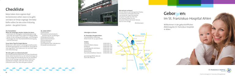 Checkliste Wo sind wir zu Hause? Wo wir Wärme und Geborgenheit finden, wo Vertrauen zueinander herrscht – und liebevolle Sorge füreinander, wo jeder für jeden ein Herz hat. Ein Zuhause findest Du nur bei einem Wesen mit einem Herzen, das für Dich schlägt. (Phil Bosmans) Babys haben ihren eigenen Kopf. Sie bestimmen selbst, wann es los geht; und dann ist Tempo angesagt. Den BabyKoffer sollten Sie also schon frühzeitig packen – das gehört hinein: St. Franziskus-Hospital Ahlen Geburtshilfliche Abteilung Robert-Koch-Str. 55, 59227 Ahlen Konrad-Adenauer-Ring Parkstraße RICHTUNG MÜNSTER P Robert-Koch-Straße Am Stadtpark Parkstraße er Richard-Wagner-Straße Walstedder Straße Weststraße Hammer Straße RICHTUNG DOLBERG RICHTUNG HAMM 17 P Gerichtsstraße RICHTUNG BECKUM A B m da ah m nm Kapellenstraße Warendorfer Straße au 02382 858-0 02382 858-295 02382 858-349 02382 858-323 02382 858-966 02382 858-321 02382 858-266 Schlütingstraße S br üd ed e [email protected] www.sfh-ahlen.de Willkommen in der geburtshilflichen Abteilung des St. Franziskus-Hospitals in Ahlen S m üd au en er - Telefon Zentrale: Geburtshilfliche Station: Kreißsaal: Gynäkologische Ambulanz: Kinderklinik: Elternschule: Fax (Geburtshilfliche Station): Im St. Franziskus-Hospital Ahlen RICHTUNG WARENDORF nm Wo bitte geht’s zur Geburtsurkunde? Die Geburtsurkunde bekommen Sie beim Standesamt Ahlen. Dafür brauchen Sie nur die Geburtsanzeige, die wir bei Vorlage des Familienbuches für Sie ausstellen. Wenn Sie die Anzeige innerhalb einer Woche dem Standesamt vorlegen, stellt man Ihnen dort das Dokument sofort aus. Also alles ganz einfach! Gebor(g)en zu Hause: te Unser Extra-Tipp für Single-Mamas: Nutzen Sie in den ersten 12 Schwangerschaftswochen die Beratungsangebote von Sozialdienst, Gesundheitsoder Jugendamt. Dort bekommen Sie wertvolle Tipps und Unterstützung! Ihr „Baby-Koffer“: Mutterpass Krankenversichertenkarte, Einweisung des Gynäkologen Medikamentenliste Familienstammbuch Personalausweis Hygieneartikel Fotoapparat oder Videokamera Handy und Adressbuch W es Die Formalitäten Wenn Sie schwanger werden, denken Sie daran: • Informieren Sie Arbeitgeber und Krankenkasse möglichst früh, das erspart Ihnen später eine Menge Hektik • Stellen Sie den Antrag auf Erziehungs- und Kindergeld • Beantragen Sie eine Haushaltshilfenbescheinigung und Ihre Elternzeit Gebor(g)en: Dolberger Straße RICHTUNG AUTOBAHN A2 ABFAHRT HAMM UENTROP Eine Einrichtung der St. Franziskus-Stiftung Münster Liebe Eltern, wir begrüßen Sie herzlich in unserer geburtshilflichen Abteilung und freuen uns über Ihr Interesse. Viele hundert Kinder erblicken jedes Jahr das Licht der Welt in unserer Abteilung für Geburtshilfe – und trotzdem ist auch für uns als Ärzte, Hebammen und Kinderkrankenschwestern jede Geburt ein persönliches, individuelles und einmaliges Erlebnis. Die Art und Weise, wie wir neues Leben empfangen, ist der Ausdruck unserer eigenen Einstellung zum Leben. In dieser Broschüre geben wir Ihnen einen Einblick in unsere Abteilung, unser Leistungsspektrum und unser Selbstverständnis von familienorientiert ausgerichteter, selbstbestimmter Geburtshilfe. Unser erfahrenes Team kümmert sich darum, dass Sie Ihre Geburt in Sicherheit und Geborgenheit erleben können. Herzlich willkommen! Für das Team der geburtshilflichen Abteilung des St. Franziskus-Hospitals Ahlen Dr. Dr. med. Markus Gantert Chefarzt 2 Steffi Schröter Bereichsleitung Geburtshilfe Damit sich Ihr Baby geborgen fühlt – von Anfang an. Gibt es einen Ort, an dem man sich besser aufgehoben fühlt als zu Hause? Wir glauben nicht. Deshalb möchten wir Ihnen dieses Gefühl auch gern vermitteln. Von Anfang an. Alles für einen sicheren und sanften Start ins Leben: Schwangeren-Sprechstunde und Betreuung S. 4 Unsere Betreuung ist individuell und familiengerecht, denn Ihre Bedürfnisse werden sich in den Wochen vor und nach der Geburt häufig ändern. Unser Team aus Hebammen, Beleghebammen, Kinderkrankenschwestern, Ärzten und Hebammenschülerinnen ist zu jeder Zeit für Sie da. Wir unterstützten Sie mit Herz, Fürsorge und Wissen – und natürlich nach den neuesten medizinischen Standards. Geburt und schmerztherapeutische Maßnahmen S. 7 Perinataldiagnostik und OP S. 8 Kinderklinik S. 11 Familienangebote S. 12 Kurse und Infos rund um Schwangerschaft und Babys erste Monate S. 15 Checkliste für Babykoffer und Formalitäten S. 17 3 Gebor(g)en im St. Franziskus-Hospital Ahlen Eine Schwangerschaft verändert den Blick auf die Welt. Für einen kleinen Menschen verantwortlich zu sein, macht achtsamer und emotionaler. An Ihr Lebensumfeld stellen Sie jetzt ganz andere Ansprüche – denn Nähe und Sicherheit sind mit Baby besonders wichtig. Das St. Franziskus ist ganz in Ihrer Nähe. Für Ihr Wohlbefinden sorgt aber nicht nur der kurze Weg zu uns: Vor allem unsere Erfahrung, die besonders liebevolle Atmosphäre und das umfassende Beratungsangebot werden Sie überzeugen. Nutzen Sie schon vor der Geburt die vielseitigen Gelegenheiten, uns näher kennen zu lernen. ine erste Gelegenheit: E Der Informationsabend für werdende Eltern Der Chefarzt der geburtshilflichen Abteilung, eine Hebamme, die Leiterin der Elternschule und der Chefarzt der Kinderklinik informieren Sie an jedem ersten Montag im Monat über die geburtshilfliche Station und beantworten alle Fragen zum Thema Schwangerschaft und Geburt. Im Anschluss führen wir Sie durch unsere vier Kreißsäle. Auch werdende Väter sind herzlich willkommen, eine Voranmeldung ist nicht erforderlich. 4 Info-Abend jeden ersten Montag im Monat Zeit: 18.30 Uhr Offen für Ihre Fragen und immer erreichbar: die Schwangerenberatung Ihr Baby ist der Mittelpunkt der Welt – und bei Veränderung beruhigt es oft, einfach jemanden fragen zu können. Unsere Sprechstunde steht Ihnen mit medizinischem und psychologischem Rat zur Seite – und ist auch auf die regelmäßige Betreuung von Risikoschwangerschaften eingerichtet! Bevor 