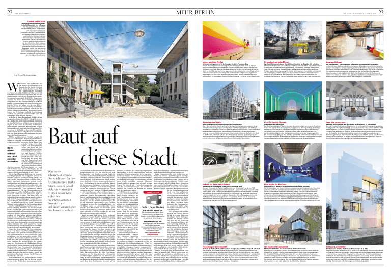 22 MEHR BERLIN DER TAGESSPIEGEL NR. 22 716 / SONNABEND, 2. APRIL 2016 23 Unsere kleine Stadt „Bauen und Wohnen am Hochdamm“ in der Kiefholzstraße 414 in Treptow Das Baugruppenprojekt, entworfen vom Architekten Marius Schliekmann, verteilt sich auf drei Gebäude. Zusammen sind es 65 Wohneinheiten, ein Gewerbe sowie größere Gemeinschaftsflächen (Mietarbeitsplätze, Mehrzweckraum, Werkstatt, Gästeappartement, Sauna). Die Bebauung verzahnt Bewohnerhöfe und Gärten mit dem öffentlichen Grün des alten Bahndamms. Das Grundstück hat einen hohen Anteil von Freifläche je Bewohner. Die Hof- und Grünflächen für 205 Menschen zwischen 0 und 84 Jahren sind durchweg besonnt, öffnen sich nach Südwest und sind bis spät in den Abend genutzt und belebt. Immer schönes Wetter Von Gerd Nowakowski Dynamisch auf jeder Ebene Kreativer Wohnen „Kita unterm Regenschirm“ in der Danziger Straße in Prenzlauer Berg Die von den Architekten baukind UG gestaltete Kindertagesstätte bietet 42 Kindern ganz besondere Räume zum Wohlfühlen, Spielen und Wachsen. Alles in dem Bau hat mit Wolken, Wind und Wetter zu tun. Ideengebend ist ein Brunnen aus den 60er Jahren direkt vor der Kita: Zwei aus Bronze gegossene Kinder stehen unter einem Regenschirm. Jeder der vier Gruppenräume verfügt über ein Spielpodest, es gibt einen begehbaren Regenbogen. Auf und in den Podesten kann man toben, klettern, rutschen oder sich zurückziehen. Ein besonderes Highlight ist das Kinderbad – mit einer runden Waschrinne. Sport-und Mehrzweckhalle der Rudolf-Steiner-Schule in der Clayallee 104 in Dahlem Keine schnöde Turnhalle: Der von Kersten und Kopp entworfene Bau fügt sich harmonisch in die bereits bestehende Gebäudestruktur ein. Die hölzerne, vieleckige Konstruktion nutzt ihre Lage am Hang: Die zwei Ebenen des Gebäudes sind auf unterschiedlichen Niveaus jeweils ebenerdig zugänglich. Auf der tiefer liegenden Hallenebene befindet sich der Haupteingang mit dem Zugang zum Foyer und den Umkleiden. Auf Straßenniveau erreichen die Zuschauer die das Spielfeld auf drei Seiten umlaufende Empore. Die Umkleiden befinden sich in einem Sockelgeschoss, das sich in den Hang hineinschiebt. Das „Loft Wedding“, eine umgebaute Fabriketage von designyougo Architekten Ein Loft mit rauen Backsteinwänden und massiven Stahlträgern wurde für einen privaten Bauherrn mit schlichten Farben und strengen Formen kombiniert. Skulpturale Raumteiler gliedern die einzelnen Wohnbereiche. Der Schlüssel des Konzepts liegt in der Sichtbarkeit und Ausleuchtung der preußischen Kappendecke. Der Raumzusammenhang bleibt dadurch erhalten und ermöglicht weite Blicke. Der Clou befindet sich im Wohnzimmer in Form eines hölzernen Kokons – das gemütliche Gästezimmer. Natürliches Licht erhellt dessen erstaunlich geräumiges Inneres über ein eigenes Dachfenster. Bezaubernder Würfel Licht für dunkle Stunden Neue alte Avantgarde Alle Fotos: Architekturpreis Berlin 2016 W as braucht gute Architektur? Für die Berliner Senatsbaudirektorin Regula Lüscher ist die Antwort klar: „Gute Bauherren, die Mut für ungewöhnliche Lösungen und Interesse an Qualität haben.“ Lüscher ist seit neun Jahren im Amt und hat gesehen, wie sich die Stadt wandelt, wie in Zeiten eines kräftigen Bevölkerungswachstums auch die Zahl der Bauprojekte zunahm. Ein Boom, der die Stadt gegenwärtig zu einem wahren Labor für zeitgenössische Baukunst macht – von extravagant und teuer bis sozial-ökologisch. Wo so viel gebaut wird in einer Metropole, in der schon in wenigen Jahren vier Millionen Menschen wohnen könnten, ist nicht nur die schiere Zahl neu geschaffener Wohn- und Arbeitsbauten von Bedeutung. Auch die Verständigung darüber, was gelungen genannt werden kann, ist drängender als in anderen Städten. In Berlin ist dabei durchaus ein Wandel in den Ansprüchen bemerkbar. Die 54-jährige Schweizerin Lüscher, die zuvor stellvertretende Direktorin im Amt für Städtebau in Zürich war, erinnert sich ungern an die Zeiten, als allerorten in Berlin renditeorientierte Investoren mit möglichst billigen Betonquadern die Stadt ästhetisch beleidigten. Unvergessen ist die Kritik an den einfallslosen Klötzen auf dem südlichen Vorgelände des Hauptbahnhofs, das doch vis-à-vis des Kanzleramts eine gute Stube der Stadt sein müsste. Welche architektonische Vielfalt möglich ist und was Bauherren mit Anspruch leisten können, zeigen die aktuellen Bewerbungen für den Architekturpreis Berlin, von denen wir auf dieser Doppelseite einige beispielhaft zeigen. Eine fünfköpfige Jury vergibt den Preis alle drei Berlin Jahre an Architekten und Bauwächst herren für besonders innovative und kreative Projekte, und wird die in diesem Zeitraum fertigzum Labor gestellt wurden – eine Leistungsschau des guten Bauaktueller ens. Der Tagesspiegel stellt Architektur auf dieser Doppelseite sowie im Verlauf der kommenden Wochen in einer Serie zahlreiche der insgesamt 111 Bewerbungen vor – und ruft die Leser dazu auf, bei der Vergabe des mit 5000 Euro dotierten Publikumspreises mit abzustimmen. Die Preisverleihung ist am 3. Juni. Die heftige öffentliche Kritik an den missratenen Billigbauten hat bei der Qualität der neueren Projekte vielleicht bereits Wirkung gezeigt. Regula Lüscher meint beobachtet zu haben, dass in Berlin insgesamt interessanter gebaut werde. Auch rund um den Hauptbahnhof zeigen etwa das neue Hotel Steigenberger (siehe rechte Seite) oder auch der Total-Tower eine ansprechend moderne Architektursprache. „Gute Architektur braucht Entwicklungszeit“, ist die Senatsbaudirektorin überzeugt. „Es hat der Baukultur und der architektonischen Diskussion sehr gut getan“, sagt Lüscher, dass mehr als früher „die Nutzer, etwa bei den zahlreich gewordenen Baugruppenprojekten, früh in die Planung einbezogen werden“. Das mache die Bauten „interessanter und experimenteller“. Ein Beispiel dafür ist das Projekt „Bauen und Wohnen am Hochdamm“ in Treptow (siehe