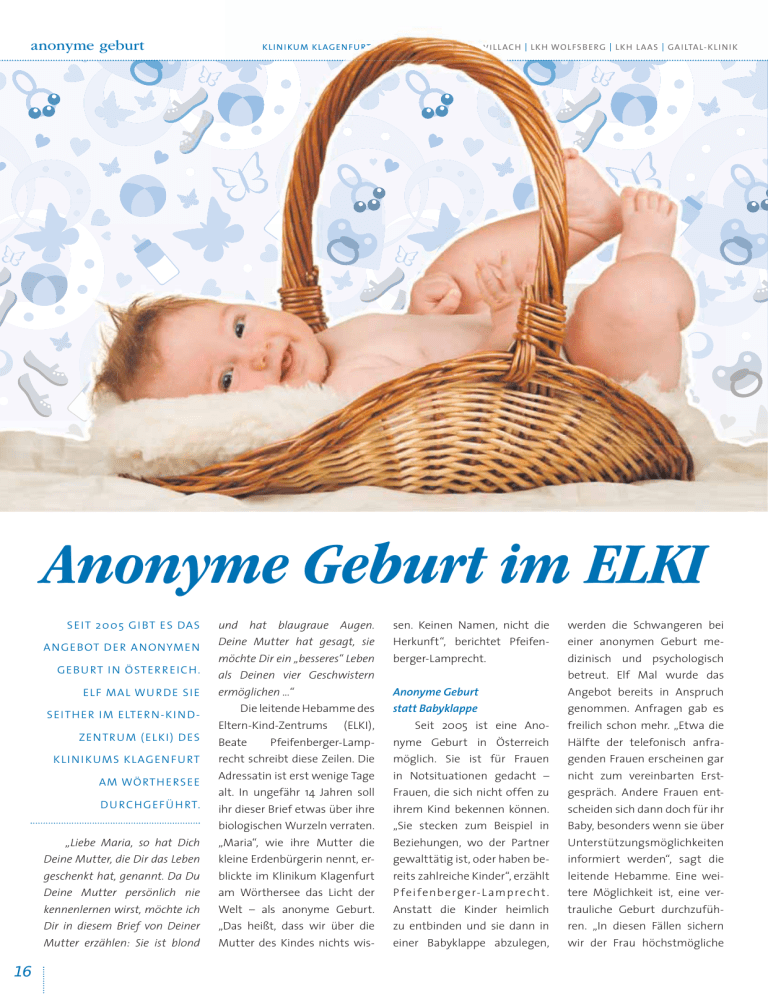 anonyme geburt KLI N I KUM KLAGEN FU U RT R T AM A M WÖRTH WÖ ÖR ÖRT R T H ERSEE RT E R SEE ER SE S EE E E | LKH L KH LK K H VI V I LLAC H | LKH WOLFSBERG | LKH LAAS | GAI LTAL-KLI N I K Anonyme Geburt im ELKI SEIT 2005 GI BT ES DAS und hat blaugraue Augen. sen. Keinen Namen, nicht die werden die Schwangeren bei ANGEBOT DER ANONYMEN Deine Mutter hat gesagt, sie Herkunft“, berichtet Pfeifen- einer anonymen Geburt me- möchte Dir ein „besseres“ Leben berger-Lamprecht. dizinisch und psychologisch GEBU RT I N ÖSTER R EIC H. ELF MAL WU R DE SI E SEITH ER IM ELTER N-KI N D- ermöglichen …“ Die leitende Hebamme des Eltern-Kind-Zentrums ZENTRUM (ELKI) DES KLI N I KUMS KLAGEN FU RT AM WÖRTH ERSEE DU RC HGEFÜ H RT. 16 betreut. Elf Mal wurde das als Deinen vier Geschwistern Anonyme Geburt Angebot bereits in Anspruch statt Babyklappe genommen. Anfragen gab es (ELKI), Seit 2005 ist eine Ano- freilich schon mehr. „Etwa die Pfeifenberger-Lamp- nyme Geburt in Österreich Hälfte der telefonisch anfra- recht schreibt diese Zeilen. Die möglich. Sie ist für Frauen genden Frauen erscheinen gar Adressatin ist erst wenige Tage in Notsituationen gedacht – nicht zum vereinbarten Erst- alt. In ungefähr 14 Jahren soll Frauen, die sich nicht offen zu gespräch. Andere Frauen ent- ihr dieser Brief etwas über ihre ihrem Kind bekennen können. scheiden sich dann doch für ihr biologischen Wurzeln verraten. „Sie stecken zum Beispiel in Baby, besonders wenn sie über Beate „Liebe Maria, so hat Dich „Maria“, wie ihre Mutter die Beziehungen, wo der Partner Unterstützungsmöglichkeiten Deine Mutter, die Dir das Leben kleine Erdenbürgerin nennt, er- gewalttätig ist, oder haben be- informiert werden“, sagt die geschenkt hat, genannt. Da Du blickte im Klinikum Klagenfurt reits zahlreiche Kinder“, erzählt leitende Hebamme. Eine wei- Deine Mutter persönlich nie am Wörthersee das Licht der P fei fenb erger- L ampre cht . tere Möglichkeit ist, eine ver- kennenlernen wirst, möchte ich Welt – als anonyme Geburt. Anstatt die Kinder heimlich trauliche Geburt durchzufüh- Dir in diesem Brief von Deiner „Das heißt, dass wir über die zu entbinden und sie dann in ren. „In diesen Fällen sichern Mutter erzählen: Sie ist blond Mutter des Kindes nichts wis- einer Babyklappe abzulegen, wir der Frau höchstmögliche anonyme geburt KLI N I KUM KLAGEN FU RT AM WÖRTH ERSEE | LKH VI LLAC H | LKH WOLFSBERG | LKH LAAS | GAI LTAL-KLI N I K „Geheimhaltung“ zu, die Mut- Mitarbeitern der Jugendwohl- ter nennt uns ihren Namen. fahrt übergeben. Sieht sich die Der liegt dann auch beim Ju- Mutter nicht in der Lage, selbst gendamt auf und wird, sollte eine Nachricht zu schreiben, das Nachforschungen verfasst die betreuende Heb- anstellen, auch ausgehändigt.“ amme ein Schreiben. Pfeifen- Kind berger-Lamprecht: „Wir schreiben alles an Informationen Suche nach Wurzeln Kinder nieder, was wir von der Mutter einmal nach ihrer biologischen erhalten haben, um dem Kind Mutter suchen werden, ist sehr bei der Suche nach seinen Wur- wahrscheinlich. Pfeifenberger- zeln, seiner Identität zu helfen. Lamprecht: „Ich erinnere mich Manchmal ist es für das Kind in diesem Zusammenhang an schon ein großer Schritt zu wis- einen etwa 35-jährigen Aust- sen, dass es die blauen Augen „da Frauen für eine anonyme deren Seite verbringen darf. „In ralier, der einmal auf der Ge- oder die dunklen Haare von der Geburt meistens ganz alleine solchen Momenten kann es ein burtshilfe erschien und sagte, Mutter geerbt hat.“ ins Spital kommen.“ Zeichen von Professionalität Persönliche Begleitung Tränen zeigen Dass adoptierte Beate Pfeifenberger-Lamprecht mit einem ihrer Schützlinge. sein, mit dem Elternpaar ge- er wurde hier geboren. Wir konnten ihn an das Jugendamt meinsam Tränen zu zeigen“, er- betreuen Natürlich kommt es gerade zählt Pfeifenberger-Lamprecht. zuletzt aus diesem Grund bit- 43 Hebammen Mütter und in solchen Situationen zu sehr Die Freude für die Adoptivwer- ten wir jede Mutter, ihrem Kind ihre Kinder im ELKI. „Gerade belastenden Momenten für ber ist überwältigend groß, einen Brief zu schreiben. Darin als Hebammen sind wir den die Mitarbeiterinnen. „Umso wenn sie nach vielen Jahren kann sie ihre Motive nennen, Frauen noch näher als Ärzte. größer ist dann aber auch die endlich den ersehnten Sohn warum sie ihr Baby nicht selbst Eine persönliche Begleitung der Freude, wenn man die Adoptiv- oder die ersehnte Tochter im großziehen konnte.“ Der Brief Betroffenen ist enorm wichtig“, eltern das erste Mal trifft und Arm halten können. ❧ wird dann verschlossen den so die erste Zeit mit dem Baby an www.klinikum-klagenfurt.at verweisen.“ Nachsatz: „Nicht Insgesamt Pfeifenberger-Lamprecht, Hightech-Bodyguard für Neugeborene SIC H ER H EIT FÜ R MUTTER Rund 1700 Babys erblicken Zutrittsberechtigung zum tion gebracht wird, ertönt so- jährlich Eltern-Kind- Kinderzimmer. Pfeifenberger- fort ein Alarmsignal. Zusätzlich Zentrum (ELKI) des Klinikums Lamprecht: „Die Mutter erhält wird auf einem ausgewählten ELTER N-KI N D-ZENTRUM Klagenfurt am Wörthersee ein Armband, vergleichbar mit Handy der Standort des Säug- GROSSGESC H R I EBEN. das Licht der Welt. „Was uns jenem aus einem Wellness- lings angezeigt“, beschreibt die besonders bereich. Nur dieses Armband leitende Hebamme das Sicher- U N D KI N D WI R D IM H I ER STARTETE DAH ER im auszeichnet, ist dass wir Mutter und Kind öffnet die Türe zum Zimmer heitssystem. AUC H DAS ERSTE die größtmögliche Sicherheit der Neugeborenen.“ Wichtig Von den Müttern wird der BABYGUAR D-SYSTEM bieten“, erklärt Beate Pfeifen- dabei: Die Mutter entscheidet, Hightech-Bodyguard gerne an- berger-Lamprecht, wer bei der Pflege des Kindes genommen. „Ich lebe im Streit Hebamme im ELKI. Neben dabei sein darf. mit dem Kindsvater. Da bin ich der Gewissheit, immer Kin- Seit Februar 2010 ist außerdem natürlich besonders dankbar, ÖSTER R 