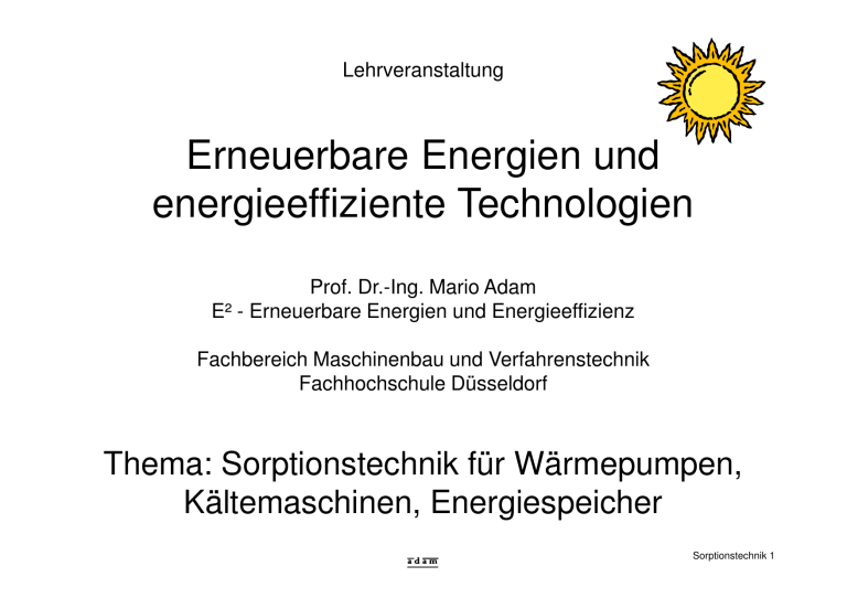 Lehrveranstaltung Erneuerbare Energien und energieeffiziente Technologien Prof. Dr.-Ing. Mario Adam E² - Erneuerbare Energien und Energieeffizienz Fachbereich Maschinenbau und Verfahrenstechnik Fachhochschule Düsseldorf Thema: Sorptionstechnik für Wärmepumpen, Kältemaschinen, Energiespeicher adam Sorptionstechnik 1 Arten von Wärmepumpen / Kältemaschinen Strom als Antriebsenergie Wärme als Antriebsenergie Strom aus dem Stromnetz oder regenerativ erzeugt z.B. mit Photovoltaik, Wind/Wasserkraft z.B. aus Verbrennungsabgasen, Solarkollektoren, Abwärme (hilfsweise elektrische Beheizung) konventionelle Kühl-/Gefriergeräte bzw. Wärmepumpen mit mechanischen Verdichtern, angetrieben durch Elektromotor (auch wenige Gerätetypen mit Verbrennungsmotor sind am Markt) Absorptions-Prozesse (mit Flüssigkeiten als Absorbens; erste Kältemaschinen im 19. Jahrhundert; Hotel-/Campingkühlschränke) Adsorptions-Prozesse (mit Feststoffen als Adsorbens) einfache Camping-Kühlboxen mit Peltier-Elementen („Metallrippen“ im Boxendeckel) Desiccant Cooling (DEC) (nur für Kühlung von Luft geeignet) Dampfstrahl-Prozesse (nur für große Leistungen, selten) adam Sorptionstechnik 2 Funktionsprinzip von Wärmepumpe / Kältemaschine Medium mit mittlerer Temperatur Tmittel Beispiel: Kühlschrank Wärmepumpe Aufstellraum (Küche) Heizung Warmwasser Energie („Wärme“) = Antriebs- + Kälteenergie mechanische Verdichtung (Kreis-) Prozess z.B. Elektro-Motor (wie im Haushaltskühlschrank) Antriebsenergie Wärme hoher Temperatur Thoch z.B. Gasbrenner (wie im Campingkühlschrank) Energie („Kälte“) Medium mit niedriger Temperatur Tniedrig KühlschrankInnenraum adam Erdreich, Außenluft, Grundwasser, etc. Sorptionstechnik 3 Kältekreisprozess mit mechanischer Verdichtung „Ab-/Nutz-Wärme“ Tmittel Kontinuierlicher Prozess mit 1 Kältemittel (meist halogenierte Fluorkohlenwasserstoffe HFKW; früher FCKW) Kondensator – Verdampfer: Verdampfung mit Energie aus der Umgebung (Sieden des Kältemittels bei niedrigem Druck und Temperatur) Drossel Verdichter AntriebsEnergie (Elektromotor) Kältemittel Verdampfer – Verdichter (z.B. mechanischer Kolbenverdichter): Druck- und damit Temperaturerhöhung – Kondensator: Verflüssigung bei hoher Temperatur, Abfuhr von Wärme – Drossel: Entspannen des Kältemittels, Druck- und Temperaturabsenkung „Kälte“ Tniedrig adam Sorptionstechnik 4 Kältekreisprozess mit Wärmeantrieb - Absorption „Ab-/Nutz-Wärme“ Tmittel Antriebswärme (Thoch) Desorber Drossel Drossel Kältemittel Verdampfer „Kälte“ Tniedrig Gemisch, flüssig Kondensator Lösungspumpe Absorber „Ab-/Nutz-Wärme“ (Tmittel) adam Kontinuierlicher Prozess mit Kältemittel + Absorptionsmittel (meist: Wasser + Lithiumbromid, Ammoniak + Wasser) – Kondensator, Drossel, Verdampfer: wie bei Prozess mit mechanischer Verdichtung (hier zirkuliert nur Kältemittel) – Absorber / Desorber: Lösen / Auskochen von Kältemittel im / aus flüssigem Absorptionsmittel – Leistung für Druckerhöhung P_hydraulisch = ∆p . V_pkt Faktor 10^3 kleiner als bei Dampf, da Dichte von Flüssigkeit soviel größer – mit „Blasenpumpe“: kein Strombedarf Sorptionstechnik 5 Absorptionsprozess im Dampfdruckdiagramm Druck / mbar Wasser + Lithiumbromid Desorber: aufheizen, desorbieren ab pDesorber > pKondensator Druck im Kondensator Druck im Verdampfer Absorber: abkühlen, absorbieren ab pVerdampfer > pAbsorber TNiedrig = TVerdampfung TMittel = THoch = TKondensation,Absorptiom adam TDesorption Temperatur / °C Sorptionstechnik 6 Kältekreisprozess mit Wärmeantrieb - Adsorption Periodischer Prozess mit Kältemittel + Adsorptionsmittel (meist: H2O+Silikagel, H2O+Zeolith) Phase A: Verdampfung und Adsorption (Befeuchtung) Kältemittel Phase B: Aufheizung (Temp., Druck ↑) Kältemitteldampf „Kälte“ (Tniedrig) Wärme (Tmittel) KreisProzess Phase D: Abkühlung (Temp., Druck ↓) Phase C: Desorption (Trocknung) und Kondensation flüssiges Kältemittel trockener Adsorbens feuchter Adsorbens Wärme (Thoch) Kältemittel Wärme (Tmittel) Wärme (Tmittel) adam Kältemitteldampf Wärme (Thoch) Sorptionstechnik 7 Adsorptionsprozess im Dampfdruckdiagramm C = Wassergehalt in Silikagel Druck 200 / mbar Wasser + Silikagel Desorber: aufheizen, desorbieren ab pDesorber > pKondensator 100 Dampfdruck im Kondensator Dampfdruck im Verdampfer Absorber: abkühlen, absorbieren ab pVerdampfer > pAbsorber 10 5 0 TNiedrig = 30 TMittel = 60 TVerdampfung TKondensation,Adsorptiom adam THoch 90 = TDesorption 120 Temperatur / °C Sorptionstechnik 8 • Kühlprozess für Luft auf Basis sorptiver Luftentfeuchtung und Verdunstungskühlung • Name von Desiccant = Trocknungsmittel Desorp- Erwär- Erwärtion mung mung Fortluft Befeuchtung mit flüss. H2O Gebäude Desiccant Cooling (DEC) Außenluft Filter sorptive Entfeuchtung • Antrieb durch Wärme, z.B. Solarenergie, im Prozessschritt 7 8 bei typischen Temperaturen von 60 bis 80°C Abküh- Befeuchtung lung mit flüss. H2O Antrieb durch Erwärmung • eingesetzte Sorptionsmittel: festes Silikagel, flüssiges Lithiumchlorid Antrieb durch Kühlung • Blau: klassische Prozessführung zur Kühlung + Entfeuchtung von Luft absolute Luftfeuchtigkeit [ g H2O pro kg trockene Luft ] adam Sorptionstechnik 9 Wärme „pumpen“ / Kühlen mit Wärme Wie kann das gehen? Wirkprinzip basiert auf Sorptionsprozessen in Zwei- oder Mehrstoffsystemen Kältemitteldampf wird im Sorptionsmittel unter Wärmeabgabe absorbiert ("gierig aufgesaugt") → Vorgang läuft von selbst ab → Ab/Adsorber wird wärmer als Verdampfer (Temperaturhub), dadurch lässt sich aufgenommene „Kälteenergie“ wieder aus dem Prozess auskoppeln (Kältemaschine Luft; Wärmepumpe Heizungswasser) Unterschiede zu konventionellen Kühlgeräten (Haupt)Antriebsenergie = Wärme (statt mechanische Energie bzw. Strom) auch periodische Prozessführung ist möglich → Prozesszustände werden nacheinander durch Wärmezu/-abfuhr realisiert → „Desorpti