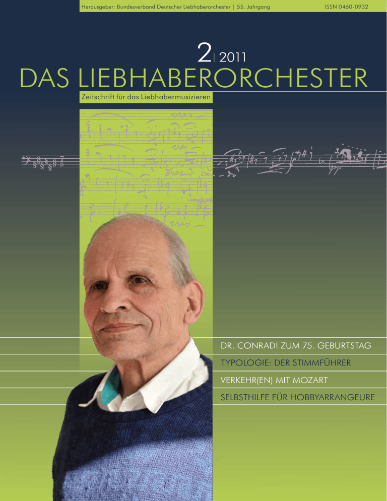 Herausgeber: Bundesverband Deutscher Liebhaberorchester | 55. Jahrgang ISSN 0460-0932 2 2011 das liebhaberorchester | Zeitschrift für das Liebhabermusizieren § § §§§§ 7 5 DR. Conradi zum 75. Geburtstag Typologie: Der Stimmführer Verkehr(en) mit Mozart Selbsthilfe für Hobbyarrangeure Weltklassik: Die Edition Eulenburg, seit 1874 WV %HUHL LGLHUWH Y UH EHU DXVJDEHQ X 1H XHQ LPQH RUPDW RUWI .RPI Die beliebtesten Standardwerke der Musikliteratur jetzt im Komfortformat! 2SWLPLHUWHV6WLFKELOGIUHLQHEHVVHUH/HVEDUNHLW *U|HUHV)RUPDW[FPIUPHKU/HVHNRPIRUW :LVVHQVFKDIWOLFKEHUDUEHLWHWHV9RUZRUW Kürzlich im neuen Format erschienen: Peter Iljitsch Tschaikowsky Symphonie Nr. 6 (Pathétique) RS&: ,6%1 (73ý Wolfgang Amadeus Mozart Konzert für Klarinette und Orchester .9 ,6%1 (73ý Felix Mendelssohn Bartholdy Konzert für Violine und Orchester RS ,6%1 (73ý Ludwig van Beethoven Symphonie Nr. 9 RS ,6%1 (73ý Edvard Grieg Peer Gynt Suiten Nr. 1 und 2 RSXQG ,6%1 (73ý $OOH(XOHQEXUJ$XVJDEHQLPQHXHQ.RPIRUWIRUPDWÀQGHQ6LHXQWHUwww.eulenburg.de/Komfortformat Mit über 1.200 Titeln die weltweit umfassendste Partiturreihe 2SHUQÃ2UFKHVWHUZHUNHÃ.RQ]HUWHÃ&KRUXQG9RNDOZHUNHÃ.DPPHUPXVLNVWFNH (XOHQEXUJ Editorial Inhalt Helge Lorenz Joachim Conradi feiert 75. Geburtstag. . . . 4 Liebe Leserin, lieber Leser, lesen Sie das LIEBHABERORCHESTER? Sicherlich, sonst läsen Sie diese Zeilen nicht. Aber vielleicht lesen Sie ja nur den Anfang dieses Editorials, blättern den Rest flüchtig durch, halten bei dem einen oder anderen Bild kurz inne, und das war’s dann: Sie legen das Heft einfach ungelesen auf den Stapel der in Ihrem Orchester freundlicherweise und bzw. aber leider umsonst ausliegenden Exemplare zurück? Müssen wir uns das nach folgender Bemerkung, die wir aus dem Saarland zugesandt bekamen, wirklich so vorstellen? ZITAT: Bitte die Anzahl der zugesandten BDLO Zeitschriften um 10 reduzieren, mir bleiben sie jetzt stoßweise übrig. Da geht etwas an der Interessenslage vorbei. Ich persönlich finde die endlosen, nicht gegliederten oder bebilderten Texte, den fehlenden lokalen Bezug, also – Artikel, Beiträge und Berichte aus dem Umfeld der Leute – als Ursache des mangelnden Interesses. Das nur so nebenbei, ansonsten meine volle Anerkennung für die ehrenamtliche Redaktionsleistung. Herzliche Grüße, Horst Riller ZITAT ENDE. Zunächst: Vielen Dank für die anerkennenden Schlussworte! Die kritische Analyse des von Herrn Riller konstatierten Desinteresses nehmen wir als Anregung (Zwischenüberschriften und Bilder) auf, um sie, wenn möglich, umzusetzen. Allerdings, was den monierten fehlenden Lokalbezug betrifft, würden wir den Ball gerne retour schicken: Die Orchester wie auch die Landesverbände seien hiermit herzlich eingeladen, mehr von ihrer jeweiligen Arbeit vor Ort zu berichten! Und Bildmaterial einzusenden, also gelungene Konzertplakate, Fotos aus der Probenarbeit oder was auch immer beachtens- und mitteilenswert erscheint. Redaktionsschluss fürs Sommerheft ist der 20. April 2012. der Qualität der LIEBHABERORCHESTER-Rezensionen überzeugt (und auch ein bisschen stolz) sind, freuen wir uns, eine Auflistung aller Noten- und Bücher-Rezensionen der letzten 15 Jahrgänge präsentieren zu können! In der herunterladbaren Datei (auf dem BDLOwebsite: bdlo.de/zeitschrift/rezensionen.php) lassen sich mithilfe der pdf-Suchfunktion Besprechungen auffinden, die seit 1996 im LIEBHABERORCHESTER erschienen sind. Bei den Kammermusiknoten sind auch die beteiligten Instrumente aufgelistet (siehe Kürzel-Liste am Ende), so dass Sie auch versuchen können, Noten einer bestimmten Besetzung ausfindig zu machen. Alte Hefte finden Sie (hoffentlich) in Ihrer öffentlichen (Musik-)Bibliothek. Oder Sie fragen bei der BDLO-Geschäftsstelle nach, ob noch Restexemplare käuflich zu erwerben sind. Joachim Conradi darf – wie auf unserem Titelbild – in seinem Jubiläumsjahr gewiss zufrieden zurückschauen, und er bräuchte sein Licht bestimmt nicht unter den Scheffel zu stellen, so dass nur sein Pullover im Sonnenlicht erstrahlt. Helge Lorenz schildert ab S. 4 einige der zahlreichen Verdienste seines Amtsvorgängers. Dieser Würdigung und Gratulation schließt sich die Redaktion ausdrücklich und von Herzen an! Joachim Landkammer Kann denn Verkehr(en) mit Mozart verkehrt sein? oder: Funktionale Musik heute. . . . . . 6 Joachim Conradi Gut zu wissen. . . . . . . . . . . . . . . . . . . . . . 7 Replik zum „Offenen“ Orchester . . . . . . . . 8 Jochen Brusch Unbekannte Werke (XII): Giovanni Battista Viotti Violinkonzert Nr. 22 a-Moll. . . . . . . . . . . 10 Joachim Landkammer Kleine Typologie der Laienmusiker (XXVII) Der Stimmführer . . . . . . . . . . . . . . . . . . . 12 Walter Thomas Heyn Kleiner Selbsthilfekurs für Hobbyarrangeure (III). . . . . . . . . . . . . . . . 15 Der Alte Text. . . . . . . . . . . . . . . . . . . . . . 18 Aus den Landesverbänden. . . . . . . . . . . . 20 Neue Orchester stellen sich vor. . . . . . . . 27 Service Adressen . . . . . . . . . . . . . . . . . . . . . 30 Veranstaltungskalender . . . . . . . . . . 31 Mitteilungen des BDLO . . . . . . . . . . . . . . 32 Ihnen / euch nun viel Freude und hoffentlich manche Anregung beim Durchblättern und natürlich auch: Lesen dieses neuesten Heftes wünscht Ihr / euer Michael Knoch Konzertdokumentation. . . . . . . . . . . . . . 34 Das besondere Konzert. . . . . . . . . . . . . . 43 Orchesterjubiläen . . . . . . . . . . . . . . . . . . 46 Prima vista – Prima Stücke?. . . . . . . . . . . 48 Besprechungen Bücher . . . . . . . . . . . . . . . . . . . . . . . . 50 Noten. . . . . . . . . . . . . . . . . . . . . . . . . 53 Die vor zwei Jahren neu eingeführte primavista-Seite zeigt erste Früchte: Wir freuen uns, in diesem Heft zahlreiche, durchaus unterschiedlich verfasste Buch- und NotenBesprechungen neuer Rezensenten vorstellen zu können. Und weil wir schon lange von Das Rätsel (Folge XX) . . . . . . . . . . . . . . . 59 Titel: Dr. Joachim Conradi | Fo