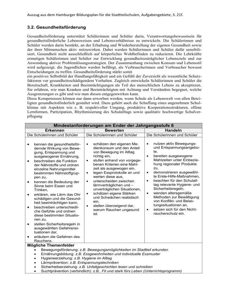 Auszug aus dem Hamburger Bildungsplan für die Stadtteilschulen, Aufgabengebiete, S. 21f. 3.2. Gesundheitsförderung Gesundheitsförderung unterstützt Schülerinnen und Schüler darin, Verantwortungsbewusstsein für gesundheitsförderliche Lebensweisen und Lebensverhältnisse zu entwickeln. Die Schülerinnen und Schüler werden darin bestärkt, an der Erhaltung und Wiederherstellung der eigenen Gesundheit sowie der ihrer Mitmenschen aktiv mitzuwirken. Dabei werden Schülerinnen und Schüler dafür sensibilisiert, Gesundheit nicht ausschließlich auf körperliches Wohlbefinden zu reduzieren. Die Lehrkräfte ermutigen Schülerinnen und Schüler zur Entwicklung gesundheitszuträglicher Lebensziele und zur Anwendung aktiver Problemlösungsstrategien. Der Zusammenhang zwischen Konsum und Lebensstil wird aufgezeigt; die Jugendlichen werden befähigt, als Verbraucherinnen und Verbraucher bewusst Entscheidungen zu treffen. Gesundheitsförderung stärkt somit ein positives Selbstbild der Handlungsfähigkeit und ein Gefühl der Zuversicht als wesentliche Schutzfaktoren vor gesundheitsschädigendem Verhalten. Zugleich entwickeln Schülerinnen und Schüler die Bereitschaft, Krankheiten und Beeinträchtigungen als Teil des menschlichen Lebens zu akzeptieren. Sie erfahren, wie man Kranken und Beeinträchtigten mit Achtung und Verständnis begegnet, welche Ausgrenzungen es gibt und wie man diesen entgegenwirken kann. Diese Kompetenzen können nur dann erworben werden, wenn Schule als Lebenswelt von allen Beteiligten gesundheitsförderlich gestaltet wird. Dazu gehört auch die Schaffung eines angenehmen Schulklimas mit Aspekten wie z. B. respektvoller Umgang, produktive Kooperationsstrukturen, offene Lernformen, Partizipation, Rhythmisierung des Schulalltags sowie qualitativ hochwertige Schulverpflegung Mindestanforderungen am Ender der Jahrgangsstufe 6 Erkennen Bewerten Handeln Die Schülerinnen und Schüler Die Schülerinnen und Schüler Die Schülerinnen und Schüler kennen die gesundheitsfördernde Wirkung von Bewegung, Entspannung und ausgewogener Ernährung, beschreiben die Funktion der Nährstoffe und ordnen einzelne Nahrungsmittel bestimmten Nährstoffgruppen zu, kennen die Bedeutung der Sinne beim Essen und Trinken, erklären, wie Lärm das Ohr schädigen und die Gesundheit beeinträchtigen kann, beschreiben unterschiedliche Gefühle und ordnen diese bestimmten Situationen zu, stellen Sicherheitsregeln in ausgewählten Gefahrensituationen dar, erläutern die Gefahren des Rauchens. schätzen den eigenen Medienkonsum und den Anteil von Bewegung im Alltag richtig ein, stufen anhand von vorgegebenen Kriterien eine Mahlzeit als ausgewogen ein, legen Essprotokolle an und werten diese aus, unterscheiden zwischen lärmverträglichen und – unverträglichen Situationen, schätzen eigene Stärken und Schwächen realistisch ein, stellen überzeigend dar, warum Rauchen ungesund ist. nutzen aktiv Bewegungsund Entspannungsangebote, bereiten ausgewogene Mahlzeiten unter Einbeziehung regionaler Produkte zu, demonstrieren ausgewählte Erste-Hilfe-Maßnahmen, beachten für den Schulalltag relevante Hygiene- und Sicherheitsregeln, wenden altersgemäße Methoden zur Bewältigung von Konflikt- und Belastungssituationen an, setzen sich für den Nichtraucherschutz ein. Mögliche Themenfelder Bewegungsförderung: z.B. Bewegungsmöglichkeiten im Stadtteil erkunden Ernährungsbildung: z.B. Essgewohnheiten und individuelle Essmuster Hygieneerziehung: z.B. Hygiene im Alltag Lärmprävention: z.B. Entspannungstechniken Sicherheitserziehung: z.B. Unfallgeschichten lesen und schreiben Suchtprävention (verbindlich): z.B., Fit und stark fürs Leben (Unterrichtsprogramm) Auszug aus dem Hamburger Bildungsplan für die Stadtteilschulen, Aufgabengebiete, S. 21f. Mindestanforderungen für den ersten Schulabschluss Erkennen Bewerten Handeln Die Schülerinnen und Schüler erläutern exemplarisch den Zusammenhang zwischen Bewegungs- und Ernährungsgewohnheiten und Gesundheit, stellen beispielhaft Ernährungsgewohnheiten verschiedener kultureller, religiöser und regionaler Gruppen dar, beschreiben Ess-Trends, nennen Grundregeln der Hygiene, stellen dar, wodurch Stress entsteht und wie dieser abgebaut werden kann, kennen Beispiele für Krisensituationen, die psychische Erkrankungen auslösen können, erläutern Erste-HilfeMaßnahmen, beschreiben die Wirkung ausgewählter Drogen. Die Schülerinnen und Schüler beschreiben und reflektieren ihre eigenen Bewegungs- und Essmuster, analysieren den Einfluss der Werbung auf die individuelle Essenswahl, beurteilen das Infektionsrisiko in ausgewählten Situationen, schätzen realistisch ein, welche Lautstärke beim Musikhören noch gesundheitsverträglich ist, ordnen Verhaltensweisen als so auffällig ein, dass Hilfe benötigt wird, reflektieren kritisch das eigene Konsumverhalten hinsichtlich legaler und illegaler Drogen. Die Schülerinnen und Schüler übernehmen Verantwortung für die eigene Essenswahl, akzeptieren Essgewohnheiten und das körperliche Erscheinungsbild anderer, grenzen beeinträchtigte und erkrankte Menschen nicht aus, wenden Methoden zur Stressvermeidung und – minderung an, wenden sich in ausgewählten Krisensituationen an Erwachsene, ergreifen in Gefährdungssituationen Schutzmaßnahmen für den Körper und helfen anderen, vermeiden Konsum- und Suchtrisiken oder nehmen bei Bedarf Beratung und Hilfe in Anspruch Themenfelder: Bewegungsförderung: z.B. Fitness und Trendsportarten Ernährungsbildung: z.B. Fast Food und Werbung Hygieneerziehung: z.B. Schutz vor Infektion Lärmprävention: z.B. Musik und Lärm Persönlichkeitsförderung: z.B. Stressbewältigung Sicherheitserziehung: z.B. Erste-Hilfe-Kurs Suchtprävention (verbindlich): z.B. Selbstständig werden – eigenständig bleiben (Unterrichtsprogramm), Nikotin-, Alkohol- und Cannabiswerkstatt Auszug aus dem Hamburger Bildungsplan für die Stadtteilschulen, Aufgabengebiete, S. 21f. Mindestanforderungen für den mittler