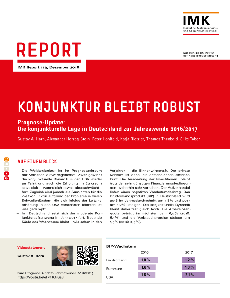 REPORT IMK Report 119, Dezember 2016 KONJUNKTUR BLEIBT ROBUST Prognose-Update: Die konjunkturelle Lage in Deutschland zur Jahreswende 2016/2017 Gustav A. Horn, Alexander Herzog-Stein, Peter Hohlfeld, Katja Rietzler, Thomas Theobald, Silke Tober AUF EINEN BLICK – Die Weltkonjunktur ist im Prognosezeitraum nur verhalten aufwärtsgerichtet. Zwar gewinnt die konjunkturelle Dynamik in den USA wieder an Fahrt und auch die Erholung im Euroraum setzt sich – wenngleich etwas abgeschwächt – fort. Zugleich sind jedoch die Aussichten für die Weltkonjunktur aufgrund der Probleme in vielen Schwellenländern, die sich infolge der Leitzins­ erhöhung in den USA verschärfen könnten, etwas gedämpft. – In Deutschland setzt sich der moderate Konjunkturaufschwung im Jahr 2017 fort. Tragende Säule des Wachstums bleibt – wie schon in den Videostatement Vorjahren – die Binnenwirtschaft. Der private Konsum ist dabei die entscheidende Antriebskraft. Die Ausweitung der Investitionen bleibt trotz der sehr günstigen Finanzierungsbedingungen weiterhin sehr verhalten. Der Außenhandel liefert einen negativen Wachstumsbeitrag. Das Bruttoinlandsprodukt (BIP) in Deutschland wird 2016 im Jahresdurchschnitt um 1,8 % und 2017 um 1,2 % steigen. Die konjunkturelle Dynamik bleibt dabei fast gleich hoch. Die Arbeitslosenquote beträgt im nächsten Jahr 6,0 % (2016: 6,1 %) und die Verbraucherpreise steigen um 1,5 % (2016: 0,5 %). BIP-Wachstum 2016 2017 Deutschland 1,8 % 1,2 % Euroraum 1,6 % 1,3 % 1,6 % 2,1 % Gustav A. Horn zum Prognose-Update Jahreswende 2016/2017 https://youtu.be/eFy1J6tiGa8 USA INHALTSVERZEICHNIS 1 Auf einen Blick 4 Konjunkturelle Dynamik bleibt nahezu unverändert 2 Konjunktur 2016: Moderat aufwärtsgerichtet 7 Außenhandel liefert negativen Wachstumsbeitrag 7 Nochmals günstige Arbeitsmarktentwicklung 2 Ausblick auf das Jahr 2017 7 Abwärtsrisiken überwiegen 2 Rahmenbedingungen bleiben überwiegend günstig 9Datenanhang KONJUNKTUR 2016: MODERAT AUFWÄRTSGERICHTET Die deutsche Wirtschaft befand sich auch 2016 in einem moderaten Aufschwung. Das Bruttoinlandsprodukt (BIP) wird voraussichtlich um 1,8 % gegenüber dem Vorjahr zunehmen ( ►Tabelle 1 auf Seite 3 ). Dabei verlor die gesamtwirtschaftliche Expansion in der zweiten Jahreshälfte deutlich an Fahrt ( ►Abbildung 1 auf Seite 5 ). Ursächlich hierfür war zum einen die nachlassende Exporttätigkeit. Vor allem die Auslandsnachfrage nach Investitionsgütern, auf die die deutsche Wirtschaft spezialisiert ist, hat sich schwächer entwickelt. So waren die deutschen Ausfuhren insbesondere in die USA und in die OPEC-Länder rückläufig ( ►Abbildung 2 auf Seite 6 ). Zum anderen sanken die Investitionen. Die ohnehin ausgeprägte Unsicherheit bei den Unternehmen dürfte durch das Referendum über einen Austritt des Vereinigten Königreichs aus der Europäischen Union nochmals gestiegen sein. Die Bauinvestitionen, die sich insgesamt positiv entwickelten, wiesen ein heterogenes Bild auf. Während die Wohnungsbauinvestitionen weiterhin kräftig expandierten, verzeichneten die Wirtschaftsbauinvestitionen erneut einen Rückgang. Ein maßgeblicher Konjunkturtreiber war abermals der private Konsum. Die Lohnzuwächse führten bei gleichzeitiger Beschäftigungszunahme zu einer deutlich erhöhten Bruttolohn- und -gehaltssumme. Einhergehend mit der niedrigen Inflationsrate ergab dies eine um gut 3 % gesteigerte Kaufkraft der Beschäftigten. Die erhöhten Realeinkommen führten in der Folge zu merklich gesteigerten Konsumausgaben. Der private Konsum stieg 2016 um 1,9 % und damit fast so stark wie im Vorjahr. Aber auch die Konsumausgaben des Staates nahmen infolge des Flüchtlingszustroms kräftig zu. Die Arbeitsmarktentwicklung war 2016 erneut erfreulich. Die registrierte Arbeitslosigkeit sank trotz einer deutlichen Zunahme des Arbeitsangebots infolge des Flüchtlingszustroms in ähnlichem Umfang wie im Vorjahr. Die Beschäftigung nahm abermals deutlich zu und die abhängig Beschäftigten verzeichneten spürbare Reallohnzuwächse. Allerdings schwächte sich diese Entwicklung zum Jahresende ab, denn der Beschäftigungsaufbau litt zuletzt merklich unter dem schwächeren konjunkturellen UmIMK Report Nr. 119, Dezember 2016 Seite 2 feld, was sich in einer deutlichen Verlangsamung der Beschäftigungsdynamik niederschlug. Die Arbeitslosigkeit sank im Jahresvergleich um rund 100.000 Personen und die Arbeitslosenquote betrug 6,1 % nach 6,4 % im Jahr 2015. AUSBLICK AUF DAS JAHR 2017 Rahmenbedingungen bleiben überwiegend günstig Für das Jahr 2017 sind die Voraussetzungen für eine Fortsetzung des verhaltenen Aufschwungs per saldo weiterhin günstig ( ►Tabelle 2 auf Seite 3 ). Mit der Ankündigung der EZB, ihren Kurs der quantitativen Lockerung über das Jahr 2017 hinaus fortzusetzen, bleiben die Finanzierungsbedingungen für Haushalte und Unternehmen vorteilhaft. Die zu erwartende Zinserhöhung in den USA hat zwar zu einem Anstieg der langfristigen Zinsen auch im Euroraum geführt, aber zugleich hat der Euro abgewertet, was den europäischen und besonders den deutschen Exporten zu Gute kommen wird. Dabei bleiben die Zinsen im Euroraum sehr niedrig. Auch dürfte sich die Erholung im übrigen Euroraum – wenngleich etwas abgeschwächt – fortsetzen. Die konjunkturelle Dynamik in den USA wird wieder an Fahrt gewinnen. Zugleich sind jedoch die Aussichten für die Weltkonjunktur aufgrund der Probleme in den Schwellenländern, die sich infolge der zu erwartenden Leitzinserhöhung in den USA verschärfen könnten, etwas gedämpft ( ►Tabelle 3 auf Seite 3 ). In Deutschland dürften die Löhne 2017 etwas langsamer zunehmen als in diesem Jahr. Der Ölpreis erhöhte sich nach dem jüngsten Beschluss der OPEC deutlich und wird sich voraussichtlich mit 52 US-Dollar pro Barrel auf dem Niveau des Jahres 2015 stabilisieren. Nicht zuletzt deswegen ist im kommenden Jahr mit einem Anstieg der Inflationsrate zu rechnen, allerdings wird sie mit 1,5 % weiterhin deutlich unter
