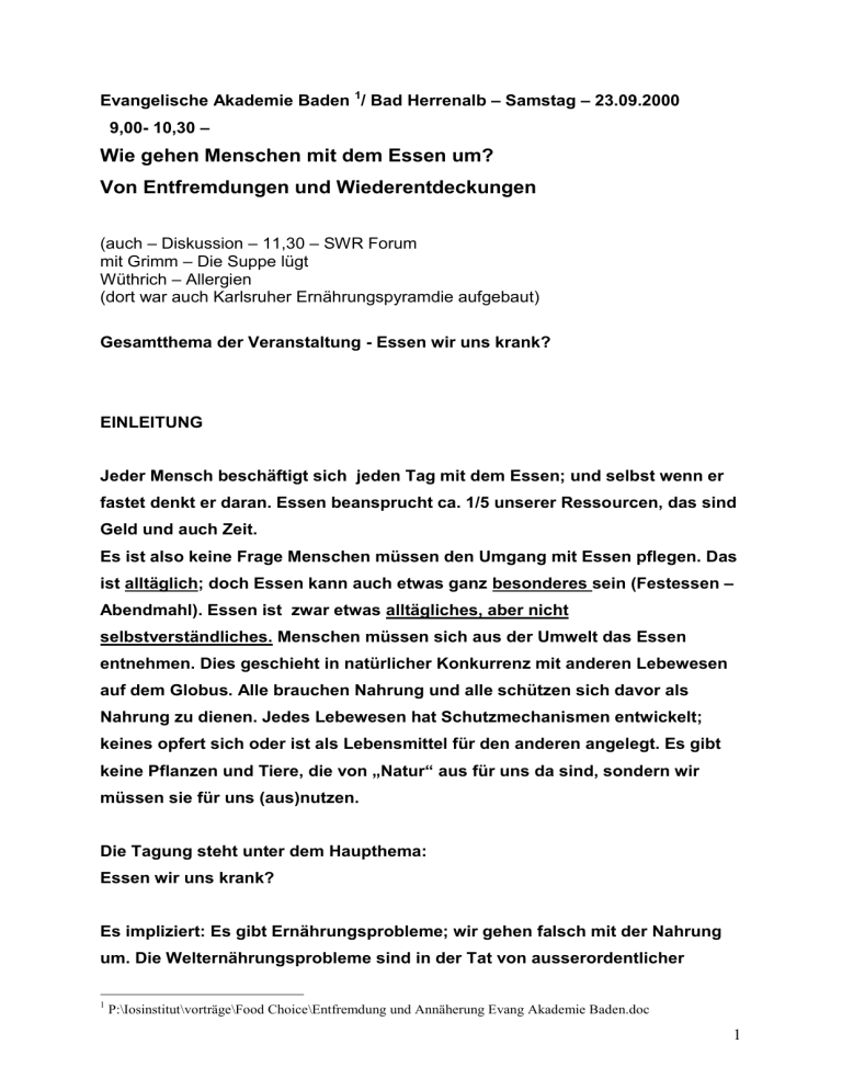 Evangelische Akademie Baden 1/ Bad Herrenalb – Samstag – 23.09.2000 9,00- 10,30 – Wie gehen Menschen mit dem Essen um? Von Entfremdungen und Wiederentdeckungen (auch – Diskussion – 11,30 – SWR Forum mit Grimm – Die Suppe lügt Wüthrich – Allergien (dort war auch Karlsruher Ernährungspyramdie aufgebaut) Gesamtthema der Veranstaltung - Essen wir uns krank? EINLEITUNG Jeder Mensch beschäftigt sich jeden Tag mit dem Essen; und selbst wenn er fastet denkt er daran. Essen beansprucht ca. 1/5 unserer Ressourcen, das sind Geld und auch Zeit. Es ist also keine Frage Menschen müssen den Umgang mit Essen pflegen. Das ist alltäglich; doch Essen kann auch etwas ganz besonderes sein (Festessen – Abendmahl). Essen ist zwar etwas alltägliches, aber nicht selbstverständliches. Menschen müssen sich aus der Umwelt das Essen entnehmen. Dies geschieht in natürlicher Konkurrenz mit anderen Lebewesen auf dem Globus. Alle brauchen Nahrung und alle schützen sich davor als Nahrung zu dienen. Jedes Lebewesen hat Schutzmechanismen entwickelt; keines opfert sich oder ist als Lebensmittel für den anderen angelegt. Es gibt keine Pflanzen und Tiere, die von „Natur“ aus für uns da sind, sondern wir müssen sie für uns (aus)nutzen. Die Tagung steht unter dem Haupthema: Essen wir uns krank? Es impliziert: Es gibt Ernährungsprobleme; wir gehen falsch mit der Nahrung um. Die Welternährungsprobleme sind in der Tat von ausserordentlicher 1 P:\Iosinstitut\vorträge\Food Choice\Entfremdung und Annäherung Evang Akademie Baden.doc 1 Dimension; es gab auch zu diesem – wie für viele weitere Menschenprobleme – Welt(krisen)gipfel Konferenzen; z.B. International Conference on Nutrition (ICN – Rom 1992). In diesem Jahr hat die bekannte private amerikanische Organisation: World Watch, in ihrem Report 2000 festgestellt, erstmals in der Menschheitsgeschichte gibt es so viele Hungrige wie Überernährte; nämlich je 800 Millionen. / / World Watch Report - (link – Folie). Es ist evident es gibt Fehler beim Umgang mit den Lebensmitteln. Die Ursachen, die diesen zugrunde liegen, können prinzipiell zweierlei Art sein. Erstens kann es sein, dass es zu wenige Lebensmittel gibt - (objektiv für alle; oder personenbezogen, man ist zu arm , zu schwach Lebensmittel erwerben zu können) und /oder die vorhandenen Lebensmittel – sind von geringer Qualität – sind; z.B. hygienisch, infektiös; und/oder Stoff-mässig – zu wenig Nährstoffe, zu viele Schadstoffe. Zweitens kann es sein, dass Menschen das Verkehrte essen; Fehlverhalten zeigen. Bezogen auf die Situation in Deutschland gilt für die überwiegende Mehrheit: Die Lebensmittel in Deutschland hatten noch nie so eine gute Qualität wie heute; mit hohem Nährstoffgehalt und nur geringe Schadstoffbelastung. Sie sind in ausreichenden Mengen jederzeit erhältlich; sie sind so preiswert wie noch nie. Diese Aussage kann für manche provozierend wirken. Es ist erstaunlich, dass Positives – das zu lange anhält – nicht in unsere Gesellschaft zu passen scheint. Sieht man von den Personenkreisen ab, die in unserer Wohlstandsgesellschaft Not leiden; materiell aber auch gesundheitlich (z.B. Suchtabhängige), dann könnten sich alle Übrigen vernünftig ernähren. Dieser Zustand währt nun einige Jahrzehnte; und ist ein Novum in der Menschheitsgeschichte. Richtig ist aber auch: Die Kosten von ernährungsabhängigen Erkrankungen betragen in Deutschland jährlich über 100 Milliarden DM. Mit richtiger Ernährung kann zwar nicht das ewige Leben erreicht werden, doch viele Jahre könnten gewonnen werden, viele Kosten eingespart werden. Wir leben länger, fühlen uns aber nicht unbedingt gesund und wohl. 2 Die Ursache sind nicht die Lebensmittel, sondern wie die Gesellschaft mit ihnen umgeht, was wir aus den Möglichkeiten (nicht) machen. Wir essen zu viel, werden animiert mehr zu konsumieren (als wir geniessen können bzw. wie es unserem Körper gut tut); und die Gesellschaft macht es uns bequem, so dass wir körperlich (aber vielleicht auch geistig) immer inaktivieren werden. Wir halten das „Schlaraffenland“ nicht aus; vielleicht weil wir auf Not- und Mangelzeiten programmiert sind (und nicht darauf, den Überfluss zu überstehen). Ich kenne kein Patentrezept, wie es zu Erreichen ist, dass wir nach dem Erreichen der Nahrungssicherheit auch Ernährungssicherheit schaffen können. Es erscheint einfacher, Materialien (Lebensmittel) und menschlichen Stoffwechsel zu gestalten, als gesellschaftliche Veränderungen vornehmen zu können. Doch ich möchte Ihnen unter dem Vortragsthema Wie gehen Menschen mit dem Essen um? Von Entfremdungen und Wiederentdeckungen Im folgenden einige Gedanken vortragen über die wir nachdenken und diskutieren können. Der Umgang mit Nahrung, die Beschaffung der Lebensmittel (das gehört zu jedem Leben) ist eine Nutzung (Umgang) mit Ressourcen der Natur. Die Geschichte der Entwicklung der Menschheit wird begleitet durch Fortschritte/Veränderungen im Umgang mit den Lebensmitteln. Nutzung des Feuers verbreiterte das Angebot; Domestizierung von Pflanzen und Tieren ermöglichte grössere Ansiedlungen und Arbeitsteilungen; Haltbarmachung von Lebensmitteln ermöglichte auch dort zu wohnen, wo es nicht Lebensmittel gibt. Die Verteilung über Raum (geographisch von Erzeuger zu Verbraucher) und über Zeit (Saison – von Ernte bis zur nächsten Ernte) wurde durch industrielle Revolutionen (auch Transport) so effizient, wie wir es heute kennen. 3 Dass dieses Bestreben genug Nahrung zu sichern, eigentlich nie sicher war, sondern, dass durch Natur-Unbilden/Katastrophen immer wieder HungerKatastrophen hervorgerufen wurden; und ebenso durch menschliche Katastrophen (Weltkriege), dass haben wir fast vergessen. Es gibt bereits einige Generationen in Deutschland /Gnade der späten Geburt /, die diese Ur-Sorge von Menschen um das tägliche Brot nicht mehr aus eigener Betroffenheit kennen. Sondern fragen können: Wo ist die Nahrungsbeschaffung ein Pr