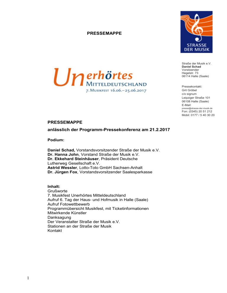 PRESSEMAPPE Straße der Musik e.V. Daniel Schad Vorsitzender Hegelstr. 73 06114 Halle (Saale) Pressekontakt: Grit Gröbel c/o signum Leipziger Straße 101 06108 Halle (Saale) E-Mail: [email protected] Fon: (0345) 20 51 212 Mobil: 0177 / 5 40 30 20 PRESSEMAPPE anlässlich der Programm-Pressekonferenz am 21.2.2017 Podium: Daniel Schad, Vorstandsvorsitzender Straße der Musik e.V. Dr. Hanna John, Vorstand Straße der Musik e.V. Dr. Ekkehard Steinhäuser, Präsident Deutsche Lutherweg Gesellschaft e.V. Astrid Wessler, Lotto-Toto GmbH Sachsen-Anhalt Dr. Jürgen Fox, Vorstandsvorsitzender Saalesparkasse Inhalt: Grußworte 7. Musikfest Unerhörtes Mitteldeutschland Aufruf 6. Tag der Haus- und Hofmusik in Halle (Saale) Aufruf Fotowettbewerb Programmübersicht Musikfest, mit Ticketinformationen Mitwirkende Künstler Danksagung Der Veranstalter Straße der Musik e.V. Stationen an der Straße der Musik Kontakt 1 PRESSEMAPPE Grußwort der Schirmherrin Martin Luther sagte über die Musik: „Nichts auf Erden ist wirksamer, sie macht die Traurigen fröhlich und die Fröhlichen traurig, die Verzagten herzhaft, reizt die Hochmütigen zur Demut, stillt und dämpft die hitzige und übermäßige Liebe, mindert Hass und Neid.“ Die Reformation war auch eine Singe- und Beteiligungsbewegung. Oft demonstrierten Gemeinden, dass sie zum reformatorischen Glauben übergetreten sind, indem die Gemeinde begann, mitzusingen. Solche Beteiligungskultur brauchen wir ganz aktuell wieder. Mehr noch als durch seine Schriften hat Martin Luther die neue Lehre über seine Lieder verbreitet. 36 Lieder sind von ihm überliefert, bei 20 hat er selbst die Melodie geschrieben. Es sind Ermutigungslieder und Trostlieder, aber auch liturgische Gesänge. Es sind Texte und Melodien anderer, die unserem Leben Halt geben können, wenn wir keine Ausdrucksform für Glücksgefühle oder erlittenes Leid finden. Da kann ein Lied zum Gebet werden: Wer singt, betet zweifach, sagt Luther. Von Luther selbst wissen wir, dass er gern gesungen hat und offenbar auch gut. Als „Wittenberger Nachtigall“ wurde er auch bezeichnet. Bei den Instrumenten war er offenbar eher zurückhaltend was Orgel, Trompeten und Pauken betrifft, da griff er lieber zur Laute. Aber davon war der Reformator überzeugt: „Auf böse und traurige Gedanken gehört ein gutes, fröhliches Lied und freundliche Gespräche. Ein Lied kann uns also Mut machen, Kraft geben, stärken. So habe ich gern die Schirmherrschaft für das Musikfest „Unerhörtes Mitteldeutschland“ übernommen im Reformationsjubiläumsjahr 2017. Margot Käßmann 2 Straße der Musik e.V. Daniel Schad Vorsitzender Hegelstr. 73 06114 Halle (Saale) Pressekontakt: Grit Gröbel c/o signum Leipziger Straße 101 06108 Halle (Saale) E-Mail: [email protected] Fon: (0345) 20 51 212 Mobil: 0177 / 5 40 30 20 PRESSEMAPPE Grußwort Straße der Musik e.V. Verehrte liebe Musikfreunde, Nein, wir befinden uns nicht im verflixten siebenten Jahr. Wir sehen das 7. Musikfest Unerhörtes Mitteldeutschland positiv. Es ist eine Übergangsphase, die Veränderung mit sich bringt. Dabei besinnen wir uns auf unsere Kernkompetenz: wir präsentieren qualitativ hochwertige Konzerte an musikhistorisch bedeutsamen Orten mit unbekannten Komponisten aus Mitteldeutschland. Bevorzugt finden die 14 Konzerte an unseren bereits bestehenden Stationen auf der STRASSE DER MUSIK statt. Wir setzten bewusst auf bewährte und neue Kooperationspartner. Ganz besonders freue ich mich, dass es uns 2017 gelungen ist neben vielen anderen Jubilaren auch Martin Luther in das Zentrum von Veranstaltungen zu stellen. Ihm vor allem haben wir es zu verdanken, dass es in Mitteldeutschland so viele Komponisten gibt wie nirgendwo auf der Welt. Unserer Vereinssatzung haben wir ein Zitat Martin Luthers vorangestellt: „Wer sich die Musik erkiest, hat ein himmlisch Werk gewonnen; denn ihr erster Ursprung ist von dem Himmel selbst genommen, weil die lieben Engelein selber Musikanten sein.“ Möge es uns gelingen Sie, liebes Publikum beim 7. Musikfest ein wenig in himmlische Sphären zu entführen. Besonders schöne Engel unterstützen uns dabei in der Basilika in Hecklingen. Harfenklänge ertönen in Gera und Ostrau, Laute und Mandoline werden in Ballenstedt gezupft, Gesangs- und Orgelmusik erklingt in Halle und Hettstedt. Hören Sie auch mal bewusst auf die Glockenklänge vor manchem Konzert. Viel Freude beim Entdecken neuer und unerhörter Klänge wünscht Daniel Schad 3 Straße der Musik e.V. Daniel Schad Vorsitzender Hegelstr. 73 06114 Halle (Saale) Pressekontakt: Grit Gröbel c/o signum Leipziger Straße 101 06108 Halle (Saale) E-Mail: [email protected] Fon: (0345) 20 51 212 Mobil: 0177 / 5 40 30 20 PRESSEMAPPE Grußwort LOTTO-TOTO GmbH Sachsen-Anhalt Vergessenen Meistern der Musik ein eigenes und besonderes Podium beim Musikfest Unerhörtes Mitteldeutschland zu bieten – dieses Konzept initiierte der Verein Straße der Musik bereits 2011. Im Jahr des Reformationsjubiläums 2017 wird zum 7. Mal zusammen mit der Präsentation einer beeindruckenden Reihe individueller Konzertprogramme auch die Einzigartigkeit der Region gefeiert. Das musikkulturelle Erbe Mitteldeutschlands ist überaus vielfältig. Den Menschen den eher unbekannten musikalischen Reichtum unserer Region näher zu bringen, die Werke von unbekannten Komponisten bekannt zu machen und Unentdecktes mit neuem Leben zu erfüllen – dieser großen Aufgabe hat sich der Verein Straße der Musik verschrieben. Dafür gilt dem engagierten Verein unser ganz besonderer Dank. Mit Freude und Sympathie verfolgt LOTTO SachsenAnhalt die Entwicklung des Musikfestes Unerhörtes Mitteldeutschland von Beginn an, als verlässlicher Begleiter. Das Publikum darf gespannt sein auf wiederentdeckte Schätze mitteldeutscher Musikkultur. An musikhistorisch bedeutsamen Aufführungsorten, wie die Laurentiuskirche Halle, das Köstritzer Palais, das Schloss Ballenstedt oder das CarlLoewe-Haus in Löbejün, werden unterschiedlichste mus