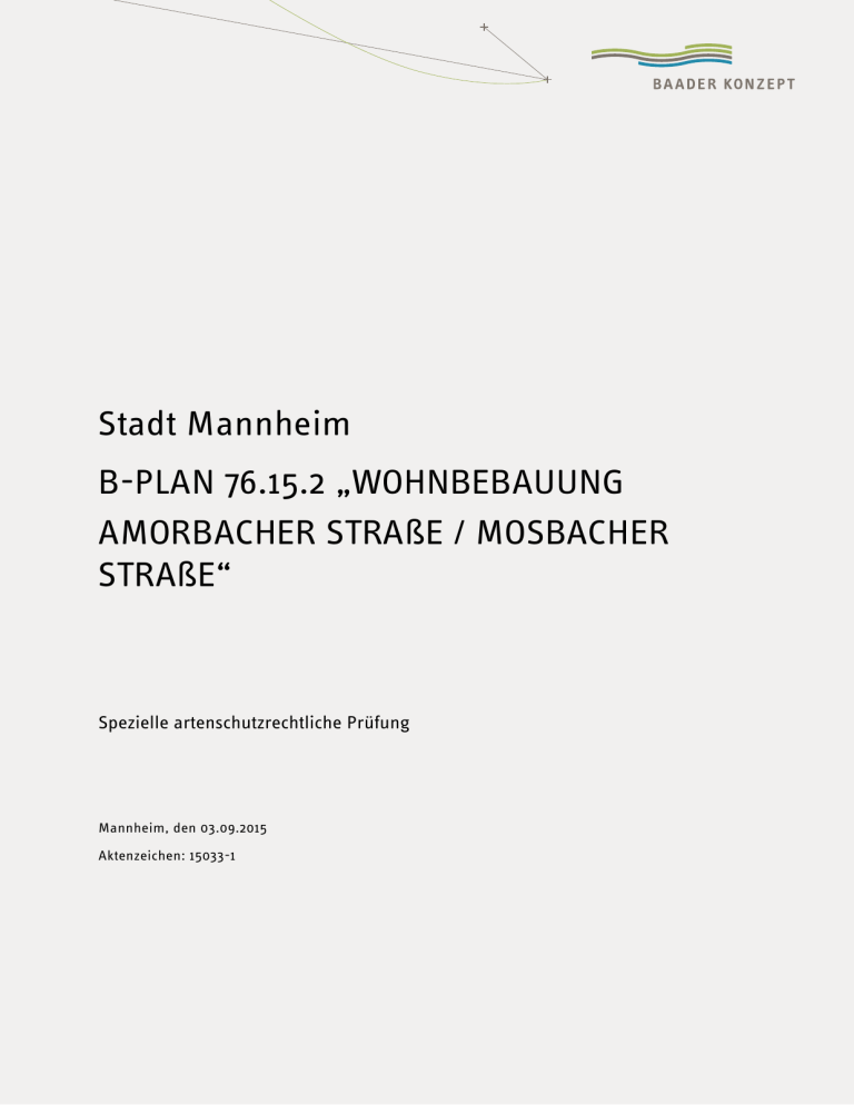 Stadt Mannheim B-PLAN 76.15.2 „WOHNBEBAUUNG AMORBACHER STRAßE / MOSBACHER STRAßE“ Spezielle artenschutzrechtliche Prüfung Mannheim, den 03.09.2015 Aktenzeichen: 15033-1 Wohnbebauung Festplatz Wallstadt Allgemeine Projektangaben Auftraggeber: Auftragnehmer: Stadt Mannheim Fachbereich Stadtplanung Collinistraße 1, 68161 Mannheim Baader Konzept GmbH N7, 5-6 68161 Mannheim www.baaderkonzept.de Projektleitung: M. Sc. Landschaftsökol. Jan Distel Projektbearbeitung: M. Sc. Landschaftsökol. Jan Distel Dipl. Landschaftsökol. Claudia Holzmann Datei: z:\az\2015\15033-1 artenschutz wohnbebauung festplatz wallstadt\gu\sap\150903_festplatz_wallstadt_sap.docx Datum: Mannheim, den 03.09.2015 Aktenzeichen: 15033-1 Wohnbebauung Festplatz Wallstadt Inhaltsverzeichnis 1 Anlass und Aufgabenstellung ........................................................................ 2 2 Gesetzliche Grundlagen ................................................................................ 3 3 Methodik ..................................................................................................... 4 4 5 6 3.1 Brutvögel 4 3.2 Fledermäuse 4 Ergebnisse ................................................................................................... 5 4.1 Brutvögel 5 4.2 Fledermäuse 6 Konfliktanalyse ............................................................................................ 8 5.1 Brutvögel 8 5.2 Fledermäuse 9 Maßnahmen und Planungshinweise ............................................................. 10 6.1 Maßnahme zur Vermeidung 7 10 Quellen....................................................................................................... 11 Tabellenverzeichnis Tabelle 1: Brutvogelarten am Sportplatz Rheingoldstraße Tabelle 2: Fledermausarten am Festplatz Wallstadt Spezielle artenschutzrechtliche Prüfung 5 7 1 Wohnbebauung Festplatz Wallstadt 1 Anlass und Aufgabenstellung Die Stadt Mannheim beabsichtigt in Mannheim-Wallstadt an der Amorbacher Straße /Mosbacher Straße (ehemaliger Festplatz) einen Bebauungsplan (B-Plan 76.15.2) für Wohnbebauung aufzustellen. Das Plangebiet umfasst den ehemaligen Festplatz, eine kleine Grünanlage, einen Kinderspielplatz und eine Trafostation (Abbildung 1). Im Rahmen dieses Verfahrens ist eine spezielle artenschutzrechtliche Prüfung nach § 44 (1) und (5) BNatSchG erforderlich, die hiermit vorgelegt wird. Abbildung 1: Lage des Bebauungsplangebietes. Spezielle artenschutzrechtliche Prüfung 2 Wohnbebauung Festplatz Wallstadt 2 Gesetzliche Grundlagen Nach § 44 BNatSchG sind im Rahmen des besonderen Artenschutzes nur die Europäischen Vogelarten gem. Art. 1 Richtlinie 79/409/EWG („Vogelschutzrichtlinie“) und Arten des Anhangs IV der RL 92/43 EWG („FFH-Richtlinie“) relevant. Die Rechtsverordnung nach § 54 BNatSchG, die weitere, in der speziellen Artenschutzprüfung nach § 44 BNatSchG artenschutzrechtlich zu prüfenden Arten auflistet, liegt z. Zt. noch nicht vor. Für nach § 15 bzw. § 18 (2) BNatSchG zulässige Vorhaben liegt bei Betroffenheit „nur“ national geschützter Arten kein Verstoß gegen die Zugriffs-, Besitz- und Vermarktungsverbote vor. Für die relevanten Arten ergeben sich aus § 44 (1) Nr. 1 bis 3 in Verbindung mit (5) BNatSchG für nach § 15 bzw. § 18 (2) BNatSchG zulässige Eingriffe folgende Verbotstatbestände: Tötungsverbot: Nach § 44 (1) Nr. 1 BNatSchG ist es verboten, wildlebenden Tieren der besonders geschützten Arten nachzustellen, sie zu fangen, zu verletzen oder zu töten oder ihre Entwicklungsformen aus der Natur zu entnehmen, zu beschädigen oder zu zerstören. Störungsverbot: Nach § 44 (1) Nr. 2 BNatSchG ist es verboten, wildlebende Tiere der streng geschützten Arten und der europäischen Vogelarten während der Fortpflanzungs-, Aufzucht-, Mauser-, Überwinterungs- und Wanderungszeiten erheblich zu stören; eine erhebliche Störung liegt vor, wenn sich durch die Störung der Erhaltungszustand der lokalen Population einer Art verschlechtert. Schädigungsverbot: Nach § 44 (1) Nr. 3 BNatSchG ist es verboten, Fortpflanzungs- und Ruhestätten der wildlebenden Tiere der besonders geschützten Arten oder ihre Entwicklungsformen aus der Natur zu entnehmen, zu beschädigen oder zu zerstören. Ein Verstoß gegen das Verbot liegt nicht vor, soweit die ökologische Funktion der von dem Eingriff oder Vorhaben betroffenen Fortpflanzungs- oder Ruhestätten im räumlichen Zusammenhang weiterhin erfüllt wird. Spezielle artenschutzrechtliche Prüfung 3 Wohnbebauung Festplatz Wallstadt 3 Methodik 3.1 Brutvögel Im Untersuchungsgebiet fand eine flächendeckende Erfassung der Brutvogelfauna in Anlehnung an die in SÜDBECK et al. (2005) beschriebene Methodik statt. Dazu fanden am 08.04.2015, 06.05.2015 und 15.06.2015 bei guten Wetterbedingungen (sonnig und trocken) Geländebegehungen statt. Die Erfassung der Brutvögel erfolgte in erster Linie durch akustische und optische Registrierung revieranzeigenden Verhaltens (z. B. Gesang, Balz, Nestbau). Dabei wurde angestrebt, möglichst viele Simultanbeobachtungen von Reviernachbarn oder exakte Brutnachweise (Nestfunde, Jungvögel) zu erbringen. Bei der ersten Begehung wurde in den Gehölzen gezielt nach Horsten und Nestern gesucht, die dann im Rahmen der weiteren Begehungen auf Besatz überprüft wurden. Die Ermittlung sogenannter Papierreviere erfolgte digital nach den Vorgaben von SÜDBECK et al. (2005). Für die Einstufung als Brutrevier oder Brutnachweis mussten dabei mindestens zwei zeitlich getrennte Beobachtungen revieranzeigenden Verhaltens innerhalb der Brutzeit vorliegen. Einzelbeobachtungen revieranzeigenden Verhaltens wurden als Brutverdacht eingestuft. Registrierungen nicht revieranzeigenden Verhaltens führten zu der Einstufung als Nahrungsgast oder überfliegende Art. Bei vielen der häufigen und ubiquitären Arten ist eine exakte Erfassung der Reviere kaum möglich, da es im Saisonverlauf zu ständigen Veränderungen der Brutsituation und großen Über