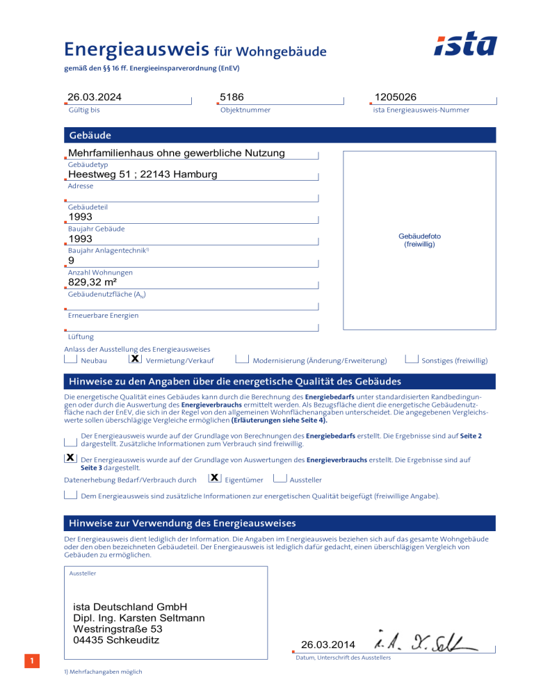 Energieausweis für Wohngebäude gemäß den §§ 16 ff. Energieeinsparverordnung (EnEV) 26.03.2024 5186 1205026 Gültig bis Objektnummer ista Energieausweis-Nummer Gebäude Mehrfamilienhaus ohne gewerbliche Nutzung Gebäudetyp Heestweg 51 ; 22143 Hamburg Adresse Gebäudeteil 1993 Baujahr Gebäude Gebäudefoto (freiwillig) 1993 Baujahr Anlagentechnik1) 9 Anzahl Wohnungen 829,32 m² Gebäudenutzfläche (AN) Erneuerbare Energien Lüftung Anlass der Ausstellung des Energieausweises Neubau x Vermietung/Verkauf Modernisierung (Änderung/Erweiterung) Sonstiges (freiwillig) Hinweise zu den Angaben über die energetische Qualität des Gebäudes Die energetische Qualität eines Gebäudes kann durch die Berechnung des Energiebedarfs unter standardisierten Randbedingungen oder durch die Auswertung des Energieverbrauchs ermittelt werden. Als Bezugsfläche dient die energetische Gebäudenutzfläche nach der EnEV, die sich in der Regel von den allgemeinen Wohnflächenangaben unterscheidet. Die angegebenen Vergleichswerte sollen überschlägige Vergleiche ermöglichen (Erläuterungen siehe Seite 4). Der Energieausweis wurde auf der Grundlage von Berechnungen des Energiebedarfs erstellt. Die Ergebnisse sind auf Seite 2 dargestellt. Zusätzliche Informationen zum Verbrauch sind freiwillig. x Der Energieausweis wurde auf der Grundlage von Auswertungen des Energieverbrauchs erstellt. Die Ergebnisse sind auf Seite 3 dargestellt. Datenerhebung Bedarf/Verbrauch durch x Eigentümer Aussteller Dem Energieausweis sind zusätzliche Informationen zur energetischen Qualität beigefügt (freiwillige Angabe). Hinweise zur Verwendung des Energieausweises Der Energieausweis dient lediglich der Information. Die Angaben im Energieausweis beziehen sich auf das gesamte Wohngebäude oder den oben bezeichneten Gebäudeteil. Der Energieausweis ist lediglich dafür gedacht, einen überschlägigen Vergleich von Gebäuden zu ermöglichen. Aussteller ista Deutschland GmbH Dipl. Ing. Karsten Seltmann Westringstraße 53 04435 Schkeuditz 1 26.03.2014 Datum, Unterschrift des Ausstellers 1) Mehrfachangaben möglich Energieausweis für Wohngebäude gemäß den §§ 16 ff. Energieeinsparverordnung (EnEV) Berechneter Energiebedarf des Gebäudes CO2 -Emissionen 1) 0 50 100 150 200 Anforderungen gemäß EnEV2) Primärenergiebedarf Ist-Wert kWh/(m2a) Anforderungswert 250 W/(m a) Anforderungswert Ist-Wert Sommerlicher Wärmeschutz (bei Neubau) Energiebedarf Energieträger Anforderungen nach § 7 Nr. 2 EEWärmeG > 400 Verfahren nach DIN V 4108-6 und DIN V 4701-10 kWh/(m2a) Verfahren nach DIN V 18599 Vereinfachungen nach § 9 Abs. 2 EnEV W/(m2a) eingehalten Jährlicher Endenergiebedarf in kWh/(m2a) für Heizung Warmwasser Hilfsgeräte4) Ersatzmaßnahmen3) 350 Für Energiebedarfsrechnungen verwendetes Verfahren Energetische Qualität der Gebäudehülle HT 2 300 kg/(m2a) Gesamt in kWh/(m2a) Vergleichswerte Endenergiebedarf Die um 15% verschärften Anforderungswerte 0 50 100 150 200 250 300 350 > 400 Anforderungen nach § 7 Nr. 2 i.V.m. § 8 EEWärmeG Die Anforderungswerte der EnEV sind um % verschärft. Primärenergiebedarf ss iv ha M us FH -N eu ba EF u H -N e EF ub H au gu e n t m er od get er isc ni h sie Du rt W rch oh sc M ng hn w FH e eb itt es n äu en er de tli ge ch tis c m h E od n w FH er ich es en ni t en er sie tli ge rt ch ti m sch od n er ich ni t sie rt sind eingehalten. Pa Diese Seite hat keine Relevanz für den verbrauchsorientierten Energieausweis. Energiebedarf 5) Verschärfter Anforderungswert kWh/(m2 a). Transmissionswärmeverlust HT Verschärfter Anforderungswert W/(m2K). Erläuterungen zum Berechnungsverfahren 2 Die Energieeinsparverordnung lässt für die Berechnung des Energiedbedarfs zwei alternative Berechnungsverfahren zu, die im Einzelfall zu unterschiedlicher Ergebnissen führen können. Insbesondere wegen standardisierter Randbedingungen erlauben die angegebenen Werte keine Rückschlüsse auf den tatsächlichen Energieverbrauch. Die ausgewiesenen Bedarfswerte sind spezifische Werte nach der EnEV pro Quadratmeter Gebäudenutzfläche (AN). 1) Freiwillige Angabe 2) bei Neubau sowie bei Modernisierung im Fall des § 16 Abs. 1 Satz 2 EnEV 3) nur bei Neubau im Falle der Anwendung von § 7 Nr. 2 Erneuerbare-Energien-Wärmegesetz 4) ggf. einschließlich Kühlung 5) EFH.Einfamilienhäuser, MFH: Mehrfamilienhäuser EAW-Nr. 1205026 Heestweg 51 ; 22143 Hamburg Energieausweis für Wohngebäude gemäß den §§ 16 ff. Energieeinsparverordnung (EnEV) Erfasster Energieverbrauch des Gebäudes Energieverbrauchskennwert Dieses Gebäude: 77 kWh/(m²·a) 0 50 100 150 200 enthalten Energieverbrauch für Warmwasser: x 250 300 350 > 400 nicht enthalten Das Gebäude wird auch gekühlt; der typische Energieverbrauch für Kühlung beträgt bei zeitgemäßen Geräten etwa 6 kWh je m2 Gebäudenutzfläche und Jahr und ist im Energieverbrauchskennwert nicht enthalten. Verbrauchserfassung – Heizung und Warmwasser Zeitraum Energieträger Anteil Warmwasser [kWh] Energieverbrauch [kWh] Klimafaktor Energieverbrauchskennwert in kWh/(m2·a) (zeitlich bereinigt, klimabereinigt) Heizung Warmwasser Kennwert von bis Schweres Erdgas 01.01.10 31.12.10 72.384 0 0.93 81 81 Schweres Erdgas 01.01.11 31.12.11 51.747 0 1.17 73 73 Schweres Erdgas 01.01.12 31.12.12 60.311 0 1.07 78 78 Durchschnitt 77 Vergleichswerte Endenergiebedarf 50 100 150 200 250 300 350 > 400 Pa ss iv ha M us FH -N eu ba EF u H -N eu EF ba H u gu e n t m er g od et er isch ni sie Du rt r W ch o s M hn ch ge nit w FH e es n bä t en er ud tli ge e ch tis m ch EF od n w H er ich es en ni t en er sie tli ge rt ch ti m sch od n er ich ni t sie rt 0 1) Die modellhaft ermittelten Vergleichswerte beziehen sich auf Gebäude, in denen die Wärme für Heizung und Warmwasser durch Heizkessel im Gebäude bereitgestellt wird. Soll ein Energieverbrauchskennwert verglichen werden, der keinen Warmwasseranteil enthällt, ist zu beachten, dass auf die Warmwasserbereitung je nach Gebäudegröße 20-40 kWh/(m2