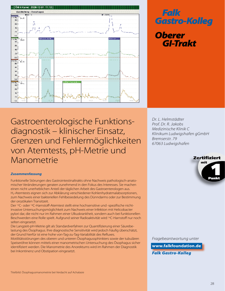 Falk Gastro-Kolleg Oberer GI-Trakt Gastroenterologische Funktionsdiagnostik – klinischer Einsatz, Grenzen und Fehlermöglichkeiten von Atemtests, pH-Metrie und Manometrie Dr. L. Helmstädter Prof. Dr. R. Jakobs Medizinische Klinik C Klinikum Ludwigshafen gGmbH Bremserstr. 79 67063 Ludwigshafen Zusammenfassung Funktionelle Störungen des Gastrointestinaltrakts ohne Nachweis pathologisch-anatomischer Veränderungen geraten zunehmend in den Fokus des Interesses. Sie machen einen nicht unerheblichen Anteil der täglichen Arbeit des Gastroenterologen aus. H2-Atemtests eignen sich zur Abklärung verschiedener Kohlenhydratmalabsorptionen, zum Nachweis einer bakteriellen Fehlbesiedelung des Dünndarms oder zur Bestimmung der orozökalen Transitzeit. Der 13C- oder 14C-Harnstoff-Atemtest stellt eine hochsensitive und -spezifische nichtinvasive Untersuchungsmöglichkeit zum Nachweis einer Infektion mit Helicobacter pylori dar, die nicht nur im Rahmen einer Ulkuskrankheit, sondern auch bei funktionellen Beschwerden eine Rolle spielt. Aufgrund seiner Radioaktivität wird 14C-Harnstoff nur noch selten eingesetzt. Die Langzeit-pH-Metrie gilt als Standardverfahren zur Quantifizierung einer Säurebe­ lastung des Ösophagus. Ihre diagnostische Sensitivität wird jedoch häufig überschätzt, der Grund hierfür ist eine hohe von-Tag-zu-Tag-Variabilität des Refluxes. Motilitätsstörungen des oberen und unteren Ösophagussphinkters sowie der tubulären Speiseröhre können mittels einer manometrischen Untersuchung des Ösophagus sicher identifiziert werden. Die Manometrie des Anorektums wird im Rahmen der Diagnostik bei Inkontinenz und Obstipation eingesetzt. Fragebeantwortung unter www.falkfoundation.de Falk Gastro-Kolleg Titelbild: Ösophagusmanometrie bei Verdacht auf Achalasie 28 Sämtliche Funktionsuntersuchungen bedürfen einer kritischen Interpretation immer in Zusammenschau mit der klinischen Symptomatik, um letztendlich zur richtigen Diagnose zu gelangen. Schlüsselwörter Funktionsdiagnostik | Atemtest | pH-Metrie | Manometrie Gastroenterologische Funktionsdiagnostik – klinischer Einsatz, Grenzen und Fehlermöglichkeiten von Atemtests, pH-Metrie und Manometrie Einleitung Im Rahmen der Abklärung von Schmerzen des Abdomens und des Thoraxraums sind seit einigen Jahren zunehmend Erkrankungen in den Fokus des Interesses gerückt, die ohne pathologisch-anatomische Veränderungen einhergehen und am wahrscheinlichsten funktioneller Natur sind. Sie machen einen nicht unerheblichen Teil der Arbeit des Gastroenterologen in der täglichen Praxis aus. Zur Diagnostik stehen verschiedene Atemtests (H2, 13C-/14C-Harnstoff ), die LangzeitpH-Metrie sowie die Manometrie des Ösophagus und Anorektums zur Verfügung, die teils hochsensitiv und -spezifisch sind, jedoch auch ihre Grenzen und Fehlermöglichkeiten bergen und einer sorgfältigen Interpretation in Zusammenschau mit den ­k linischen Befunden bedürfen. H2-Atemtests eignen sich zur Abklärung verschiedener Kohlenhydratmalabsorptionen, die durch Gärprozesse zu erheblichen abdominellen Schmerzen, Meteorismus und Diarrhöen führen können. Sie lassen sich aber auch zum Nachweis einer bakteriellen Fehlbesiedelung des Dünndarms oder zur Bestimmung der orozökalen Transitzeit einsetzen. Der 13C- oder 14C-Harnstoff-Atemtest stellt eine hochsensitive und -spezifische nichtinvasive Untersuchungsmöglichkeit zum Nachweis einer Infektion mit Helicobacter pylori dar, die nicht nur im Rahmen einer Ulkuskrankheit, sondern auch bei funktionellen Beschwerden eine Rolle spielt. Langzeit-pH-Metrie und Ösophagusmanometrie können insbesondere bei der Abklärung nicht-kardialer Thoraxschmerzen, jedoch auch zur Überprüfung des Therapie­ erfolgs bei säureblockierender Therapie oder bei bereits endoskopisch vermuteten Motilitätsstörungen des Ösophagus eingesetzt werden. Die Manometrie des Anorektums wird im Rahmen der Diagnostik bei Inkontinenz und Obstipation eingesetzt. Der folgende Artikel soll die klinischen Einsatzmöglichkeiten, jedoch auch Grenzen und Fehlerquellen der genannten Tests aufzeigen. P Funktionelle Störungen des Gastro­ intestinaltrakts sind zunehmend in den Fokus des Interesses gerückt. H2-Atemtests Grundlagen Die in der Nahrung enthaltenen Zucker (Mono-, Di- und Polysaccharide) werden über unterschiedliche Mechanismen in den Körper aufgenommen. Glukose wird in der ­Regel vollständig aktiv über die Mukosa im Dünndarm resorbiert und gelangt nicht bis in den Dickdarm. Fruktose wird über Carrier-Proteine, insbesondere den Transporter GLUT-5, aufgenommen. Bei Zufuhr in üblicher Menge wird ebenfalls nahezu die gesamte Fruktose resorbiert, sodass keine relevanten Mengen den Dickdarm erreichen. P Verschiedene in der Nahrung enthaltenen Zucker werden über unterschiedliche Mechanismen vom Körper aufgenommen. 29 Disaccharide wie Laktose (Milchzucker, bestehend aus Galaktose und Glukose) oder Saccharose (Rohrzucker, bestehend aus Fruktose und Glukose) bzw. Polysaccharide (Stärke) müssen zunächst durch die entsprechenden Enzyme gespalten werden, bevor sie resorbiert werden können. Lactulose (bestehend aus Galaktose und Fruktose) kann vom Körper selbst nicht verarbeitet werden und erreicht das Kolon in der Regel unverdaut. Grundlage der H2-Atemtests ist die Fermentierung der verschiedenen Zucker durch Darmbakterien im Kolon. Während der hierbei stattfindenden Gärprozesse kommt es zur Bildung von Wasserstoffgas (H2). Eine ausreichend hohe Anzahl von Bakterienkolonien findet sich normalerweise nur im Kolon. Der Gastrointestinaltrakt ist der einzige Entstehungsort von Wasserstoffgas im menschlichen Körper. Dieses wird zum überwiegenden Teil über Flatulenz ausgeschieden, jedoch werden ca. 10–20% durch Diffusion resorbiert und über die Lunge abgeatmet [1] und können somit in der Aus­ atemluft nachgewiesen werden. Gemessen wird in ppm (parts per million). Nüchterne, gesunde Personen haben in der Regel einen niedrigen Ausgangswert zwi