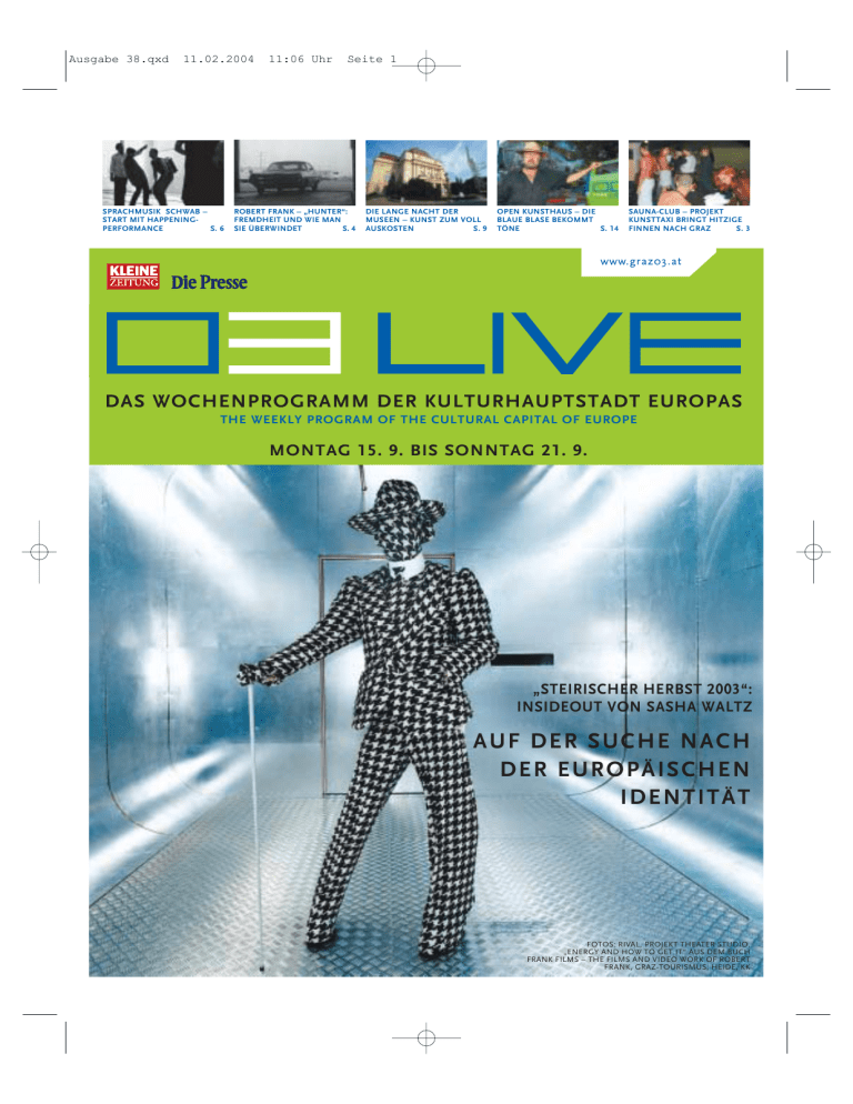 Ausgabe 38.qxd 11.02.2004 SPRACHMUSIK SCHWAB – START MIT HAPPENINGPERFORMANCE S. 6 11:06 Uhr Seite 1 ROBERT FRANK – „HUNTER“: FREMDHEIT UND WIE MAN SIE ÜBERWINDET S. 4 DIE LANGE NACHT DER MUSEEN – KUNST ZUM VOLL AUSKOSTEN S. 9 OPEN KUNSTHAUS – DIE BLAUE BLASE BEKOMMT TÖNE S. 14 SAUNA-CLUB – PROJEKT KUNSTTAXI BRINGT HITZIGE FINNEN NACH GRAZ S. 3 DAS WOCHENPROGRAMM DER KULTURHAUPTSTADT EUROPAS THE WEEKLY PROGRAM OF THE CULTURAL CAPITAL OF EUROPE MONTAG 15. 9. BIS SONNTAG 21. 9. „STEIRISCHER HERBST 2003“: INSIDEOUT VON SASHA WALTZ AUF DER SUCHE NACH DER EUROPÄISCHEN IDENTITÄT FOTOS: RIVAL, PROJEKT THEATER STUDIO, „ENERGY AND HOW TO GET IT“ AUS DEM BUCH FRANK FILMS – THE FILMS AND VIDEO WORK OF ROBERT FRANK, GRAZ-TOURISMUS, HEIDE, KK Ausgabe 38.qxd 11.02.2004 11:06 Uhr Seite 2 insideout Living Sculptures § Sasha Waltz’s insideout is a concert, a dance program and an installation all at the same time. An openended work with questions and no valid answers…. With insideout, Sasha WalSASHA WALTZ ter is realizing a WENDET SICH long cherished IN „INSIDEdream, writes OUT“ DEM EINZELNEN Jochen Sandig. INDIVIDUUM He should know. ZU He is not only the SAHA WALTZ’ producer and „INSIDEOUT“ dramatist for the OUT FEAfamous choreoTURES THE INDIVIDUAL grapher and codirector of the Berlin theater but also her lifelong partner. What this dream is about can be described loosely with “interdisciplinary production.” In reality, insideout is all at once an exhibit, a concert, and a dance performance. The audience does not enter the performance area as in a classical “I-sit-down-hereand-remain-seated” theater situation but enters an open arrangement of 20 spaces in which living persons and identities are “exhibited.” Driven by the life story of each performer – dancers and musicians from Asia, Europe, North and South America – the piece moves along thematically, critically analyzing value changes and the relevance of status symbols. It is a work with questions and no valid answers for the most part: What do we need to develop our identities? What is the meaning of origin, family, and history? What determines our being – to have or to be? The music is by Rebecca Saunders. In her first musical work for the stage, the London composer has written individual solos, duets, and trios for ten musicians arranged in a given space to create a unified work with many layers. The premier of insideout on September 18 is, so to speak, the “pre-premier” for this year’s Styrian Autumn when this piece can be seen on another six evenings. insideout lebende skulpturen Sasha Waltz’ „insideout“ ist Konzert, Ausstellung, Tanzaufführung und Installation zugleich. Ein offenes Spiel mit Fragen ohne Antworten… S herbst, ist gleichzeitig Ausstellung, Konzert und Tanzaufführung. Der Besucher begibt sich in ein offenes System von 20 Räumlichkeiten, in denen lebendige Personen und Identitäten „ausgestellt“ werden. Ausgehend von den Lebensgeschichten der beteiligten TänzerInnen aus Asien, Europa, Nordund Südamerika setzt sich das Stück u. a. mit dem Wandel von Werten und Lebensstilen auseinander – ein Spiel insideout. choreographische installation von sasha waltz Choreographie: Sasha Waltz Komposition: Rebecca Saunders Video: Philip Bußmann Kostüm: Bernd Skodzig Uraufführung: 18. September Weitere Aufführungen: 19., 20., 21., 24., 25. und 26. September Beginn: jeweils 19.30 Uhr und 21.30 Uhr Helmut List-Halle, Waagner-Biro-Straße 98a. Eintritt: 16/22 Euro. Info: 0316/2003, Tickets: 0316/82 11 60 Mariahilferplatz 2, Graz. www.graz03.at mit Fragen ohne endgültige Antworten. Welche Bedeutung haben Herkunft, Familie und Geschichte? Was benötigen wir zur Entwicklung unserer Identitäten? Was bestimmt unser Wesen? Die Musik stammt von Rebecca Saunders. Die Londoner Komponistin verdichtet in ihrem ersten musikalischen Werk für die Bühne einzelne Soli, Duette und Trios für zehn im Raum verteilte MusikerInnen zu einer vielschichtigen Gesamtkomposition. Die Uraufführung von „insideout“ ist quasi die „Voreröffnung“ zum steirischen herbst im Rahmen dessen das Stück noch an weiteren sechs Tagen zu sehen ist. Neben der choreographischen Installation entstand ein Buch, das Ausschnitte der Interviews, die Karl Stocker bereits 2001 mit Mitgliedern des Tanzensembles führte, wissenschaftlichen Thesen gegenüber02 stellt. FOTOS: RIVAL, LANGUSCH, KK asha Waltz realisiert mit „insideout“ einen lang gehegten Traum. Worum es in diesem Traum der berühmten Choreographin und Kodirektorin der Schaubühne am Lehniner Platz, Berlin, geht, lässt sich grob mit „interdisziplinäre Produktion“ beschreiben. „insideout“, entwickelt auf Initiative des Kulturwissenschafters Karl Stocker im Auftrag von Graz 2003 zum diesjährigen steirischen Ausgabe 38.qxd 11.02.2004 11:06 Uhr Seite 3 projekt kunsttaxi Ta x i A r t kings of sauna „Höyry“ ist finnisch und heißt „Dampf“. Und genau den will der finnische Saunaclub der Extravaganz am Mariahilferplatz ablassen. § THE BASE (BILD UNTEN) SIND EINE DER GÄSTE IM FINNISCHEN SAUNADORF THE BASE WILL BE ONE OF THE GUESTS AT THE SAUNA VILLAGE ie Initiatoren des Projektes „Kunsttaxi“ sind in Erfüllung ihres selbst auferlegten „Kunstbotschafter-Auftrags“ weit herumgekommen. Christian Marcik, Fedo Ertl und die Intro-Graz-Spection transportieren allerdings nicht nur Kunst aus Graz nach außen, sondern auch Kunst von außen nach Graz. In diesem Sinne wurde gemeinsam mit der Architektin Susanna Ahvonen die Typologie finnischer Saunen in ihrer Heimat erfasst. Eine Bestandsaufnahme, die der Kulturhauptstadt nicht vorenthalten werden soll: In einer für 2003 entworfenen Kunstsauna am Mariahilferplatz wird von 17. bis 20. September kräftig Dampf abgelassen. Auf finnisch, wohlgemerkt. Sauna hat in Finnland Tradition: Der Höyry-Club (= Dampf-Club) ist ein 03 spektakuläres Happening, das auf D dem finnischen Sauna-Er