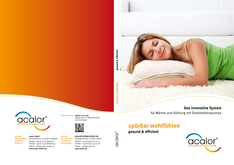 gesund & effizient spürbar wohlfühlen Das innovative System Servicehotline: 0 38 41/32 77 144 täglich auch an Wochenenden und Feiertagen für Wärme und Kühlung mit Direktwärmepumpe spürbar wohlfühlen gesund & effizient Vertrieb Süd und West, technische Beratung: acalor GmbH Sonnenweg 25, D-58256 Ennepetal Telefon:+49 (0) 23 33/86998-0 Telefax: +49 (0) 23 33/86998-99 E-Mail:[email protected] www.acalor-direkt.de Vertrieb Nord und Ost, Technik und Entwicklung: ACALOR TECHNIK SCHEEL KG Sandbauernhof, D-23972 Lübow Telefon: + 49 (0) 38 41/32 77 10 Telefax: + 49 (0) 38 41/32 77 110 E-Mail:[email protected] www.acalor.de Inhaltsverzeichnis Allgemeine Informationen ........................................................................................................................................... 09 Zahlen, Daten, Fakten .................................................................................................................................................... 45 Baubiologisch gesundes Wohnen Gesundes Heizen, gesundes Kühlen • Verbrauchswerte aus der Praxis • Anlagenaufwandzahl • Anbindung an Gewerke – Bauablauf • • acalor – Die Direktwärmepumpe Das innovative System für Wärme und Kühlung • Wesentliche Unterschiede zu herkömmlichen Wärmepumpen Die Wärmepumenheizung Doppelte Behaglichkeit zu halben Kosten ­­/ Bericht vom Prof. Dr. rer. nat. Klaus Bastian • 4 > Sanitärinstallation > Elektroinstallation > Estricharbeiten • Installationsbeispiel • Temperaturprotokolle Im Haus • Messprotokoll > Thermostat • Ausschreibungstexte > Fußbodensystem Referenzobjekte ................................................................................................................................................................. 65 Technische Daten .............................................................................................................................................................. 23 • Komponenten im Einzelnen > Heizkreisverteiler > Edelstahl-Brauchwasserspeicher > Hausdurchführungen Im Außenbereich > Verdampfer mit Lüfter > Schaltschrank – Steuerung und Wärmepumpe Unterschiedliche Heizsysteme ................................................................................................................................. 89 • acalor-Infrarot-Strom-Heizungen • Auswirkungen der unterschiedlichen Heizmöglichkeiten Rund um acalor ................................................................................................................................................................... 95 • Presse • Technische Informationen • Nachhaltigkeit • acalor-Anlage / außen • Über 20 Jahre Bestehen • Bodenbeläge Häufig gestellte Fragen.................................................................................................................................................. 101 • Alle Vorteile auf einen Blick • Beispiele für Verkleidung von acalor-Systemen Fachbegriffe .......................................................................................................................................................................... 105 Nachwort ................................................................................................................................................................................ 111 5 acalor Erfinder Henning W. Scheel Liebe Interessentin, lieber Interessent, liebe Freunde, 6 7 herzlich willkommen! Wir freuen uns, dass Sie sich für unser Produkt interessieren. Hier finden­ Sie auf einfache und übersichtliche Weise eine Erläuterung über die Direktwärmepumpe und damit entstehenden Besonderheiten sowohl für die Nutzer als auch für’s Gebäude. Es geht nicht nur um eine andere Technik, sondern um eine generell andere Sichtweise, ­ zu den Themen: gesundes Heizen, gesundes Wohnen. Wir sind davon überzeugt, Sie, liebe Leserin, lieber Leser, bekommen Impulse, Ihre Wohnqualität zu steigern und ein neues spürbares Wohlgefühl entstehen zu lassen. Die acalor-Direktwärmepumpe bedient sowohl die gesetzlichen und technischen Ansprüche, als auch bauseitige Anforderungen. Sie erfüllt die Räume mit einer Wärme oder Kühle, die ein Behaglichkeitsgefühl erzeugt. Thermische Behaglichkeit bedeutet: frei von Luftzug. Das Team von acalor Lübow Von 1983 bis 1990 habe ich auf La Palma in unserer Finca mit umfangreichen Experimenten die acalor-Direktwärmepumpe ins Leben gebracht. Angefangen habe ich mit einer PumpenWarmwasser-Fußbodenheizung, um mögliche Verbesserungen zu erforschen. Danach baute ich Messgeräte für Drücke, Temperaturen, Durchflüsse, Strom, Spannung, Leistungsaufnahme und Stromzählerstand auf und protokollierte Messwerte z.B. minütlich. Im Jahr 1989 habe ich das Kupferrohr auf einer Polystyrol-Wärmedämmung im Zement­ estrich eingebaut, um mir die Mühen zu sparen, habe ich auf die Wasser-Umwälzpumpe, den Entlüfter und das Ausdehnungsgefäß verzichtet, anschliessend habe ich das Kupferrohr als Kondensator der vorgesehenen Wärmepumpe benutzt. Mit Erfolg. Die Direktwärmepumpe war somit geboren. Es ist ein System, das auf dem Prinzip des Kühlschranks funktioniert. Acalor ist das Ergebnis meines Prinzipes, des ständigen systematischen Protokollierens von Messwerten (mittlerweile sind schon über 500.000 Leistungsmessungen an Wärmepumpen archiviert) und dem Finden nach Verbesserungsmöglichkeiten. Als Erfinder vieler innovativer Produkte habe ich mit acalor ein Lebenswerk erschaffen, das seit über 20 Jahren den Markt, das Bewusstsein bewegt, und die Gebäude mit innovativer und effizienter Technik ausstattet und die Nutzer mit einer gesunden Wärme und Kühlung beschenkt. Lassen Sie sich inspirieren von einer neuen Sichtweise mit außergewöhnlicher und inno­ vativer Technik. Informieren Sie sich über die Vorzüge der Besonderheiten und seien Sie willkommen ein Kunde von acalor zu sein. Ihr Henning W. Scheel Das Team von acalor