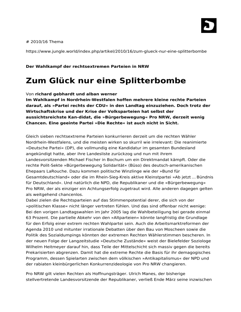 # 2010/16 Thema https://www.jungle.world/index.php/artikel/2010/16/zum-glueck-nur-eine-splitterbombe Der Wahlkampf der rechtsextremen Parteien in NRW Zum Glück nur eine Splitterbombe Von richard gebhardt und alban werner Im Wahlkampf in Nordrhein-Westfalen hoffen mehrere kleine rechte Parteien darauf, als »Partei rechts der CDU« in den Landtag einzuziehen. Doch trotz der Wirtschaftskrise und der Krise der Volksparteien hat selbst der aussichtsreichste Kan­didat, die »Bürgerbewegung« Pro NRW, derzeit wenig Chancen. Eine geeinte Partei »Die Rechte« ist auch nicht in Sicht. Gleich sieben rechtsextreme Parteien konkurrieren derzeit um die rechten Wähler Nordrhein-Westfalens, und die meisten wirken so skurril wie irrelevant: Die reanimierte »Deutsche Partei« (DP), die vollmundig eine Kandidatur im gesamten Bundesland angekündigt hatte, aber ihre Landesliste zurückzog und nun mit ihrem Landesvorsitzenden Michael Fischer in Bochum um ein Direktmandat kämpft. Oder die rechte Polit-Sekte »Bürgerbewegung Solidarität« (Büso) des deutsch-amerikanischen Ehepaars LaRouche. Dazu kommen politische Winzlinge wie der »Bund für Gesamtdeutschland« oder die im Rhein-Sieg-Kreis aktive Kleinstpartei »Ab jetzt … Bündnis für Deutschland«. Und natürlich die NPD, die Republikaner und die »Bürgerbewegung« Pro NRW, der als einziger ein Achtungserfolg zugetraut wird. Alle anderen dagegen gelten als weitgehend chancenlos. Dabei zielen die Rechtsparteien auf das Stimmenpotential derer, die sich von der »politischen Klasse« nicht länger vertreten fühlen. Und das sind offenbar nicht wenige: Bei den vorigen Landtagswahlen im Jahr 2005 lag die Wahlbeteiligung bei gerade einmal 63 Prozent. Die partielle Abkehr von den »Altparteien« könnte langfristig die Grundlage für den Erfolg einer extrem rechten Wahlpartei sein. Auch die Arbeitsmarktreformen der Agenda 2010 und mitunter irrationale Debatten über den Bau von Moscheen sowie die Politik des Sozialdumpings könnten der extremen Rechten Wählerstimmen bescheren. In der neuen Folge der Langzeitstudie »Deutsche Zustände« weist der Bielefelder Soziologe Wilhelm Heitmeyer darauf hin, dass Teile der Mittelschicht sich massiv gegen die bereits Prekarisierten abgrenzen. Damit hat die extreme Rechte die Basis für ihr demagogisches Programm, dessen Spielarten zwischen dem völkischen »Antikapitalismus« der NPD und der rabiaten kleinbürgerlichen Konkurrenzideologie von Pro NRW changieren. Pro NRW gilt vielen Rechten als Hoffnungsträger. Ulrich Manes, der bisherige stellvertretende Landesvorsitzende der Republikaner, verließ Ende März seine inzwischen zur politischen Ruine depravierte Partei, um sich Pro NRW anzuschließen. »Der erstmalige Einzug einer rechtsdemokratischen Partei in den Düsseldorfer Landtag ist auf einmal in greifbare Nähe gerückt – nutzen wir diese Chance!« zitiert ihn der Nachrichtendienst Blick nach Rechts. Dass viele Rechte ihre Hoffnungen auf die »Bürgerbewegung« Pro NRW richten, verdankt sich auch dem Erfolg deren Vorbilder, etwa der Schweizerischen Volkspartei (SVP). Wie die rechtspopulistische SVP protestiert Pro Köln, die Lokalpartei und Schaltzentrale von Pro NRW ist, gegen Korruption und Klüngel und hofft, dadurch von der Krise der klassischen Parteien zu profitieren. Wenn durch Automation der Anteil der lebendigen Arbeit dramatisch verringert wird und die Lohnabhängigen der staatlichen Alimentierung überlassen werden, wirken die Lobpreisungen von Markt und Moderne für die Arbeitermilieus und kleine Selbstständige wie eine technokratische Floskel, und vor diesem Hintergrund wird die vormoderne autochthone Gemeinschaft zum potentiellen Identifikationsangebot. »Heimat statt Minarette« fordert die NPD in ihrem Wahlprogramm und auf Plakaten. Antiislamische Parolen prägen den Wahlkampf der extremen Rechten. Für den Kampf gegen die »Islamisierung unserer Heimat« versucht die NPD auf den Schulhöfen mit der Kampagne »Wir oder Scharia« Jugendliche an die Wahlurnen zu bringen. Der Vorsitzende des Landesverbandes der NPD, Claus Cremer, verkündet: »Wir wollen, dass Deutschland das Land der Deutschen bleibt, und dazu gehört auch, dass die Überfremdung und Islamisierung unserer Heimat gestoppt und hier lebende Ausländer in ihre Heimatländer zurückgeführt werden«. Auch Pro NRW orientiert sich mit Losungen wie »Zuwanderung begrenzen, Islamisierung stoppen« an den Erfolgen der SVP. Alle Wahlparteien vom rechten Rand beschwören ein manichäisches Weltbild, in dem das altehrwürdige Abendland gegen die grüne Pest des Islam verteidigt werden soll. Bei den Kommunalwahlen 2009 bescherte dieser Kurs der Lokalpartei Pro Köln 5,4 Prozent der Stimmen – trotz der Kampagnen der lokalen Boulevardzeitungen gegen die selbsternannte »Bürgerbewegung«. Neben dem xenophoben Rumgehacke auf »dem Islam« bemüht die NPD das Versprechen einer völkischen Sozialpolitik. Inzwischen mit dem Namenszusatz »Die soziale Heimatpartei« versehen, konnte die NPD vor allem in den neuen Bundesländern mit Parolen wie »Quittung für Hartz IV« oder der Forderung nach einem »Mindestlohn von 8,88 Euro« Wahlerfolge erzielen und sich kommunal verankern. In Nordrhein-Westfalen plakatiert sie Losungen wie »Hartz IV für Westerwelle«. Jürgen Gansel, der völkische Vordenker der NPD, richtet sich in der Aprilausgabe des Parteiorgans Deutsche Stimme gegen die »Diffamierung finanzschwacher Deutscher« durch den Bundesaußenminister. Realen Anschluss an das abgehängte Prekariat findet die Partei derzeit aber nur am Rande. Doch angesichts der kommunalpolitischen Situation in NRW – Städten wie Wuppertal droht schon jetzt die Pleite – könnten Pro NRW oder NPD zur Stelle sein, um anlässlich höherer Schwimmbadpreise oder der Schließung des Stadttheaters gegen die vermeintliche Alimentierung von Ausländern zu polemisieren. Trotz der inhaltlichen Ähnlichkeiten zur NPD wird Pro NRW in der Berichterstattung häufi