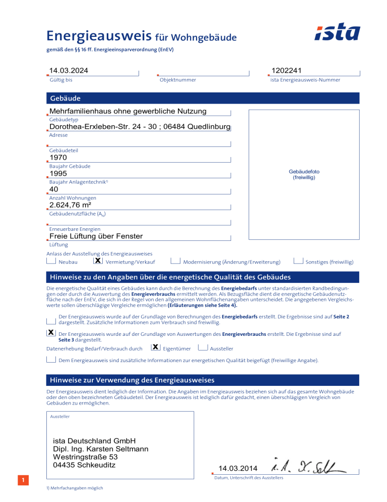 Energieausweis für Wohngebäude gemäß den §§ 16 ff. Energieeinsparverordnung (EnEV) 14.03.2024 1202241 Gültig bis Objektnummer ista Energieausweis-Nummer Gebäude Mehrfamilienhaus ohne gewerbliche Nutzung Gebäudetyp Dorothea-Erxleben-Str. 24 - 30 ; 06484 Quedlinburg Adresse Gebäudeteil 1970 Baujahr Gebäude Gebäudefoto (freiwillig) 1995 Baujahr Anlagentechnik1) 40 Anzahl Wohnungen 2.624,76 m² Gebäudenutzfläche (AN) Erneuerbare Energien Freie Lüftung über Fenster Lüftung Anlass der Ausstellung des Energieausweises Neubau x Vermietung/Verkauf Modernisierung (Änderung/Erweiterung) Sonstiges (freiwillig) Hinweise zu den Angaben über die energetische Qualität des Gebäudes Die energetische Qualität eines Gebäudes kann durch die Berechnung des Energiebedarfs unter standardisierten Randbedingungen oder durch die Auswertung des Energieverbrauchs ermittelt werden. Als Bezugsfläche dient die energetische Gebäudenutzfläche nach der EnEV, die sich in der Regel von den allgemeinen Wohnflächenangaben unterscheidet. Die angegebenen Vergleichswerte sollen überschlägige Vergleiche ermöglichen (Erläuterungen siehe Seite 4). Der Energieausweis wurde auf der Grundlage von Berechnungen des Energiebedarfs erstellt. Die Ergebnisse sind auf Seite 2 dargestellt. Zusätzliche Informationen zum Verbrauch sind freiwillig. x Der Energieausweis wurde auf der Grundlage von Auswertungen des Energieverbrauchs erstellt. Die Ergebnisse sind auf Seite 3 dargestellt. Datenerhebung Bedarf/Verbrauch durch x Eigentümer Aussteller Dem Energieausweis sind zusätzliche Informationen zur energetischen Qualität beigefügt (freiwillige Angabe). Hinweise zur Verwendung des Energieausweises Der Energieausweis dient lediglich der Information. Die Angaben im Energieausweis beziehen sich auf das gesamte Wohngebäude oder den oben bezeichneten Gebäudeteil. Der Energieausweis ist lediglich dafür gedacht, einen überschlägigen Vergleich von Gebäuden zu ermöglichen. Aussteller ista Deutschland GmbH Dipl. Ing. Karsten Seltmann Westringstraße 53 04435 Schkeuditz 1 14.03.2014 Datum, Unterschrift des Ausstellers 1) Mehrfachangaben möglich Energieausweis für Wohngebäude gemäß den §§ 16 ff. Energieeinsparverordnung (EnEV) Berechneter Energiebedarf des Gebäudes CO2 -Emissionen 1) 0 50 100 150 200 Anforderungen gemäß EnEV2) Primärenergiebedarf Ist-Wert kWh/(m2a) Anforderungswert 250 W/(m a) Anforderungswert Ist-Wert Sommerlicher Wärmeschutz (bei Neubau) Energiebedarf Energieträger Anforderungen nach § 7 Nr. 2 EEWärmeG > 400 Verfahren nach DIN V 4108-6 und DIN V 4701-10 kWh/(m2a) Verfahren nach DIN V 18599 Vereinfachungen nach § 9 Abs. 2 EnEV W/(m2a) eingehalten Jährlicher Endenergiebedarf in kWh/(m2a) für Heizung Warmwasser Hilfsgeräte4) Ersatzmaßnahmen3) 350 Für Energiebedarfsrechnungen verwendetes Verfahren Energetische Qualität der Gebäudehülle HT 2 300 kg/(m2a) Gesamt in kWh/(m2a) Vergleichswerte Endenergiebedarf Die um 15% verschärften Anforderungswerte 0 50 100 150 200 250 300 350 > 400 Anforderungen nach § 7 Nr. 2 i.V.m. § 8 EEWärmeG Die Anforderungswerte der EnEV sind um % verschärft. Primärenergiebedarf ss iv ha M us FH -N eu ba EF u H -N e EF ub H au gu e n t m er od get er isc ni h sie Du rt W rch oh sc M ng hn w FH e eb itt es n äu en er de tli ge ch tis c m h E od n w FH er ich es en ni t en er sie tli ge rt ch ti m sch od n er ich ni t sie rt sind eingehalten. Pa Diese Seite hat keine Relevanz für den verbrauchsorientierten Energieausweis. Energiebedarf 5) Verschärfter Anforderungswert kWh/(m2 a). Transmissionswärmeverlust HT Verschärfter Anforderungswert W/(m2K). Erläuterungen zum Berechnungsverfahren 2 Die Energieeinsparverordnung lässt für die Berechnung des Energiedbedarfs zwei alternative Berechnungsverfahren zu, die im Einzelfall zu unterschiedlicher Ergebnissen führen können. Insbesondere wegen standardisierter Randbedingungen erlauben die angegebenen Werte keine Rückschlüsse auf den tatsächlichen Energieverbrauch. Die ausgewiesenen Bedarfswerte sind spezifische Werte nach der EnEV pro Quadratmeter Gebäudenutzfläche (AN). 1) Freiwillige Angabe 2) bei Neubau sowie bei Modernisierung im Fall des § 16 Abs. 1 Satz 2 EnEV 3) nur bei Neubau im Falle der Anwendung von § 7 Nr. 2 Erneuerbare-Energien-Wärmegesetz 4) ggf. einschließlich Kühlung 5) EFH.Einfamilienhäuser, MFH: Mehrfamilienhäuser EAW-Nr. 1202241 Dorothea-Erxleben-Str. 24 - 30 ; 06484 Quedlinburg Energieausweis für Wohngebäude gemäß den §§ 16 ff. Energieeinsparverordnung (EnEV) Erfasster Energieverbrauch des Gebäudes Energieverbrauchskennwert Dieses Gebäude: 78 kWh/(m²·a) 0 50 100 150 enthalten Energieverbrauch für Warmwasser: 200 x 250 300 350 > 400 nicht enthalten Das Gebäude wird auch gekühlt; der typische Energieverbrauch für Kühlung beträgt bei zeitgemäßen Geräten etwa 6 kWh je m2 Gebäudenutzfläche und Jahr und ist im Energieverbrauchskennwert nicht enthalten. Verbrauchserfassung – Heizung und Warmwasser Zeitraum Energieträger Anteil Warmwasser [kWh] Energieverbrauch [kWh] Klimafaktor Energieverbrauchskennwert in kWh/(m2·a) (zeitlich bereinigt, klimabereinigt) Heizung Warmwasser Kennwert von bis Fern-/ Nahwärme 01.01.10 31.12.10 227.550 0 0.93 81 81 Fern-/ Nahwärme 01.01.11 31.12.11 178.250 0 1.15 78 78 Fern-/ Nahwärme 01.01.12 31.12.12 184.800 0 1.07 75 75 Durchschnitt 78 Vergleichswerte Endenergiebedarf 50 100 150 200 250 300 350 > 400 Pa ss iv ha M us FH -N eu ba EF u H -N eu EF ba H u gu e n t m er g od et er isch ni sie Du rt r W ch o s M hn ch ge nit w FH e es n bä t en er ud tli ge e ch tis m ch EF od n w H er ich es en ni t en er sie tli ge rt ch ti m sch od n er ich ni t sie rt 0 1) Die modellhaft ermittelten Vergleichswerte beziehen sich auf Gebäude, in denen die Wärme für Heizung und Warmwasser durch Heizkessel im Gebäude bereitgestellt wird. Soll ein Energieverbrauchskennwert verglichen werden, der keinen Warmwasseranteil enthällt, ist zu b