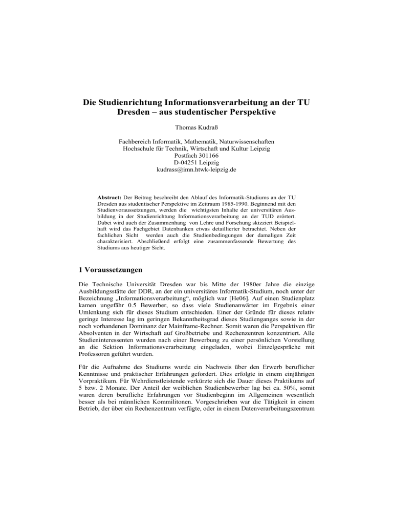 Die Studienrichtung Informationsverarbeitung an der TU Dresden – aus studentischer Perspektive Thomas Kudraß Fachbereich Informatik, Mathematik, Naturwissenschaften Hochschule für Technik, Wirtschaft und Kultur Leipzig Postfach 301166 D-04251 Leipzig [email protected] Abstract: Der Beitrag beschreibt den Ablauf des Informatik-Studiums an der TU Dresden aus studentischer Perspektive im Zeitraum 1985-1990. Beginnend mit den Studienvoraussetzungen, werden die wichtigsten Inhalte der universitären Ausbildung in der Studienrichtung Informationsverarbeitung an der TUD erörtert. Dabei wird auch der Zusammenhang von Lehre und Forschung skizziert Beispielhaft wird das Fachgebiet Datenbanken etwas detaillierter betrachtet. Neben der fachlichen Sicht werden auch die Studienbedingungen der damaligen Zeit charakterisiert. Abschließend erfolgt eine zusammenfassende Bewertung des Studiums aus heutiger Sicht. 1 Voraussetzungen Die Technische Universität Dresden war bis Mitte der 1980er Jahre die einzige Ausbildungsstätte der DDR, an der ein universitäres Informatik-Studium, noch unter der Bezeichnung „Informationsverarbeitung“, möglich war [He06]. Auf einen Studienplatz kamen ungefähr 0.5 Bewerber, so dass viele Studienanwärter im Ergebnis einer Umlenkung sich für dieses Studium entschieden. Einer der Gründe für dieses relativ geringe Interesse lag im geringen Bekanntheitsgrad dieses Studienganges sowie in der noch vorhandenen Dominanz der Mainframe-Rechner. Somit waren die Perspektiven für Absolventen in der Wirtschaft auf Großbetriebe und Rechenzentren konzentriert. Alle Studieninteressenten wurden nach einer Bewerbung zu einer persönlichen Vorstellung an die Sektion Informationsverarbeitung eingeladen, wobei Einzelgespräche mit Professoren geführt wurden. Für die Aufnahme des Studiums wurde ein Nachweis über den Erwerb beruflicher Kenntnisse und praktischer Erfahrungen gefordert. Dies erfolgte in einem einjährigen Vorpraktikum. Für Wehrdienstleistende verkürzte sich die Dauer dieses Praktikums auf 5 bzw. 2 Monate. Der Anteil der weiblichen Studienbewerber lag bei ca. 50%, somit waren deren berufliche Erfahrungen vor Studienbeginn im Allgemeinen wesentlich besser als bei männlichen Kommilitonen. Vorgeschrieben war die Tätigkeit in einem Betrieb, der über ein Rechenzentrum verfügte, oder in einem Datenverarbeitungszentrum (DVZ). Das Vorpraktikum sollte den Studienbewerbern die „Funktionsprinzipien der technischen Einrichtungen und Verfahren zur Darstellung, Speicherung und Verarbeitung von Informationen“ vermitteln. Neben der Gerätetechnik sollten auch Kenntnisse über den technologischen Prozess im Rechenzentrum und seine Operationen erworben werden. Viele Studienbewerber, die nach dem Abitur ein Vorpraktikum absolvierten, wurden von ihrem Betrieb zum Studium „nachdelegiert“ (obgleich der Studienplatz schon vorhanden war). Die Beziehung zum Betrieb wurde somit auch während des Studiums aufrechterhalten, mit der Perspektive einer Rückkehr als Absolvent. 2 Randbedingungen des Studiums Im Jahre 1985 wurden an der Sektion Informationsverarbeitung ca. 125 Studenten immatrikuliert, die in 6 Seminargruppen aufgeteilt wurden. An der Sektion gab es drei Wissenschaftsbereiche (WB): „Programmierungstechnik“, „Rechnersysteme“ und „Automatisierte Informationssysteme“ (AIS). Die Zuordnung der Seminargruppen zu den Wissenschaftsbereichen war festgelegt, woraus sich für die meisten Studierenden von Studienbeginn an automatisch die spätere wissenschaftliche Vertiefung ergab. Nur in Ausnahmefällen konnte diese noch geändert werden und war dann mit einem Seminargruppenwechsel verbunden. Die Seminargruppenstruktur wurde sogar bei der Zuteilung der Plätze im Wohnheim berücksichtigt, das sich in unmittelbarer Nachbarschaft der Sektion befand. Aufgrund dieser räumlichen Nähe entstand eine recht intensive Gemeinschaft der Studierenden, die sich in vielen Situationen bewährte (z.B. Prüfungsvorbereitung), auch wenn die Wohnbedingungen aus heutiger Sicht katastrophal erscheinen. Die Zusammensetzung der Studentenschaft blieb für die Dauer des gesamten Studiums (9 Semester) im Wesentlichen gleich. Allerdings erfolgte 1986 die Anwerbung von norddeutschen Studenten für das in diesem Jahr beginnende Informatik-Studium an der Universität Rostock. Es gab auch (geheim gehaltene) Versuche, Studenten für einen Wechsel zu einem Kybernetik-Studium in Ilmenau zu gewinnen, um später in der militärischen Forschung bei Carl Zeiss eingesetzt zu werden. Unter den ausländischen Studierenden bildeten Bulgaren im Jahrgang die größte Gruppe, auch aus Madagaskar, Nordkorea (bis 1989) oder der Mongolei kamen Studenten. Darüber hinaus gab es eine Anzahl von Berufsoffiziersbewerbern, die im Auftrag der NVA ihr Studium absolvierten und eine Perspektive als Führungskader für die „Automatisierung der Truppenführung“ besaßen. Die straffe Organisation des Studiums und das damit verbundene Prüfungspensum machte es möglich, dass alle Studenten nahezu zeitgleich ihr Studium mit der Verteidigung der Diplomarbeit abschlossen und im Februar 1990 als letzter „DDRJahrgang“ feierlich exmatrikuliert wurden. Für die Informatik-Fächer gab es nur in sehr geringem Umfang Fachliteratur. In einigen Lehrveranstaltungen wurden Lehrhefte verteilt, insbesondere bei der Ausbildung in Programmiersprachen, oder es konnten Robotron-Handbücher ausgeliehen werden. Einige Professoren hatten zu ihren Vorlesungen eigene Lehrbücher verfasst, die jedoch mit einem Preis von bis zu 50 Mark für Studenten sehr teuer waren: „Lokale Netze“ [Lö87], „Compiler und Interpreter“ [LJO87], „Betriebssysteme“ [Ka88]. Bundesdeutsche oder englischsprachige Fachbücher und Fachzeitschriften gab es in begrenztem Maße in der Sektionsbibliothek, allerdings nicht zur Ausleihe. Die Möglichkeiten zum Selbststudium über den Lehrstoff hinaus waren dadurch beschränkt. Die rechentechnische Basis war zu Be
