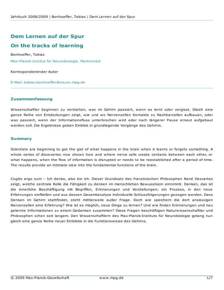 Jahrbuch 2008/2009 | Bonhoeffer, Tobias | Dem Lernen auf der Spur Dem Lernen auf der Spur On the tracks of learning Bonhoeffer, Tobias Max-Planck-Institut für Neurobiologie, Martinsried Korrespondierender Autor E-Mail: [email protected] Zusammenfassung W issenschaftler beginnen zu verstehen, w as im Gehirn passiert, w enn es lernt oder vergisst. Gleich eine ganze Reihe von Entdeckungen zeigt, w ie und w o Nervenzellen Kontakte zu Nachbarzellen aufbauen, oder w as passiert, w enn der Informationsfluss unterbrochen w ird oder nach längerer Pause erneut aufgebaut w erden soll. Die Ergebnisse geben Einblick in grundlegende Vorgänge des Gehirns. Summary Scientists are beginning to get the gist of w hat happens in the brain w hen it learns or forgets something. A w hole series of discoveries now show s how and w here nerve cells create contacts betw een each other, or w hat happens, w hen the flow of information is disrupted or needs to be reestablished after a period of time. The results provide an intimate view into the fundamental functions of the brain. Cogito ergo sum – Ich denke, also bin ich. Dieser Grundsatz des französischen Philosophen René Descartes zeigt, w elche zentrale Rolle die Fähigkeit zu denken im menschlichen Bew usstsein einnimmt. Denken, das ist die innerliche Beschäftigung mit Begriffen, Erinnerungen und Vorstellungen; ein Prozess, in den neue Erfahrungen einfließen und aus dessen Gesamtanalyse individuelle Schlussfolgerungen gezogen w erden. Dass Denken im Gehirn stattfindet, steht mittlerw eile außer Frage. Doch w ie speichern die dort ansässigen Nervenzellen eine Erfahrung? W ie ist es möglich, neue Dinge zu lernen? Und w ie finden Erinnerungen und neu gelernte Informationen zu einem Gedanken zusammen? Diese Fragen beschäftigen Naturw issenschaftler und Philosophen schon seit langem. Den W issenschaftlern des Max-Planck-Instituts für Neurobiologie gelang nun gleich eine ganze Reihe neuer Einblicke in die Funktionsw eise des Gehirns. © 2009 Max-Planck-Gesellschaft w w w .mpg.de 1/7 Jahrbuch 2008/2009 | Bonhoeffer, Tobias | Dem Lernen auf der Spur Je de Ne rve nze lle k om m unizie rt übe r vie le ta use nd Konta k tste lle n m it ihre n Na chba rze lle n. De r fle x ible Auf- und Abba u die se r Konta k te e rm öglicht e s, Inform a tione n zu ve ra rbe ite n und zu spe iche rn. © Ma x -P la nck -Institut für Ne urobiologie /Hofe r Flexible Datenverarbeitung Das menschliche Gehirn besteht aus rund hundert Milliarden Nervenzellen (Abb. 1). Doch das ist erst der Anfang: Jede dieser Zellen ist über viele tausend Kontaktstellen mit ihren Nachbarzellen verbunden. W issenschaftler gehen davon aus, dass erst der flexible Auf- und Abbau dieser Kontaktstellen es ermöglicht, Informationen zu verarbeiten und zu speichern. Um etw as zu lernen, also neue Informationen verarbeiten zu können, gehen Nervenzellen neue Verbindungen miteinander ein. Steht zum Beispiel eine Information an, für die es noch keinen Verarbeitungsw eg gibt, w achsen von der entsprechenden Nervenzelle feine Fortsätze auf ihre Nachbarzellen zu. Bildet sich am Ende des Fortsatzes eine spezielle Kontaktstelle, eine Synapse, ist der Austausch von Informationen zw ischen den Zellen möglich – die neue Information w ird gelernt. Löst sich der Kontakt w ieder auf, w ird das Gelernte vergessen. Auch andere Gehirnfunktionen sind nur dann möglich, w enn Nervenzellen zur richtigen Zeit und am richtigen Ort über solche Kontakte Informationen austauschen können. Leitsystem für Informationen An den Synapsen fließt die neuronale Information entlang einer Einbahnstraße: von der Sendeeinheit zur Empfangseinheit der nachgeschalteten Zelle. W issenschaftler können beobachten, w ie von nachgeschalteten Zellen aktiv Fortsätze ausw achsen oder sich w ieder zurückziehen, w enn Informationen verarbeitet w erden. Der anscheinend eher statischen Sendeeinheit maßen sie daher nur eine reagierende Rolle beim Aufbau neuer Synapsen zu. Diese Annahme w ar jedoch falsch, w ie die Martinsrieder Neurobiologen nun zeigen konnten [1]. Erstmals gelang es ihnen, nicht nur die Empfänger-Seite, sondern auch die Sendestationen über einen längeren Zeitraum zu beobachten. Hierzu markierten sie einige Nervenzellen mit einem roten Fluoreszenzfarbstoff und färbten die mit ihnen verbundenen Zellen grün. Mithilfe eines hochauflösenden Zw eiPhotonen-Mikroskops konnten sie so die Veränderungen beider Synapsenseiten im Zeitraffer beobachten. Schnell w ar klar, dass die Sendeeinheit einer Synapse eine deutlich aktivere Rolle bei deren Auf- und Abbau spielt als bisher gedacht. Verringert sich der Informationsfluss, den eine Nervenzelle w eitergeben muss, so w erden viele der nun überflüssigen Sendestationen abgebaut. Unerw artet w ar, dass die durchschnittliche Anzahl der Sendestationen gleich blieb. So w urde ihre Anzahl zw ar bei einer Verringerung des Informationsflusses reduziert; im gleichen Zeitraum entstanden jedoch an anderen © 2009 Max-Planck-Gesellschaft w w w .mpg.de 2/7 Jahrbuch 2008/2009 | Bonhoeffer, Tobias | Dem Lernen auf der Spur Stellen neue Sendestationen. Da nur die ursprünglich miteinander kommunizierenden Nervenzellen farblich markiert w aren, konnten die W issenschaftler nicht erkennen, ob die neuen Sender Informationen an bisher nicht an der Kommunikation beteiligte Nervenzellen w eitergaben. Es könnte sein, dass hier Synapsen zu hemmenden Nervenzellen entstehen, die eine Weitergabe des abgeschw ächten Informationsflusses w eiter reduzieren. Ob das der Fall ist, w ollen die W issenschaftler nun mit neuen Methoden untersuchen. Inform a tione n we rde n von e ine r Ne rve nze lle zur nä chste n übe r Syna pse n we ite rge ge be n. Es gibt he m m e nde und inform a tionsförde rnde Syna pse n, die sich in Aufba u und La ge unte rsche ide n. © Ma x -P la nck -Institut für Ne urobiologie /W ie re nga Bremsen an vorgegebenen Kreuzungen W ie erw ähnt gibt es neben den Synapsen, die den Inform