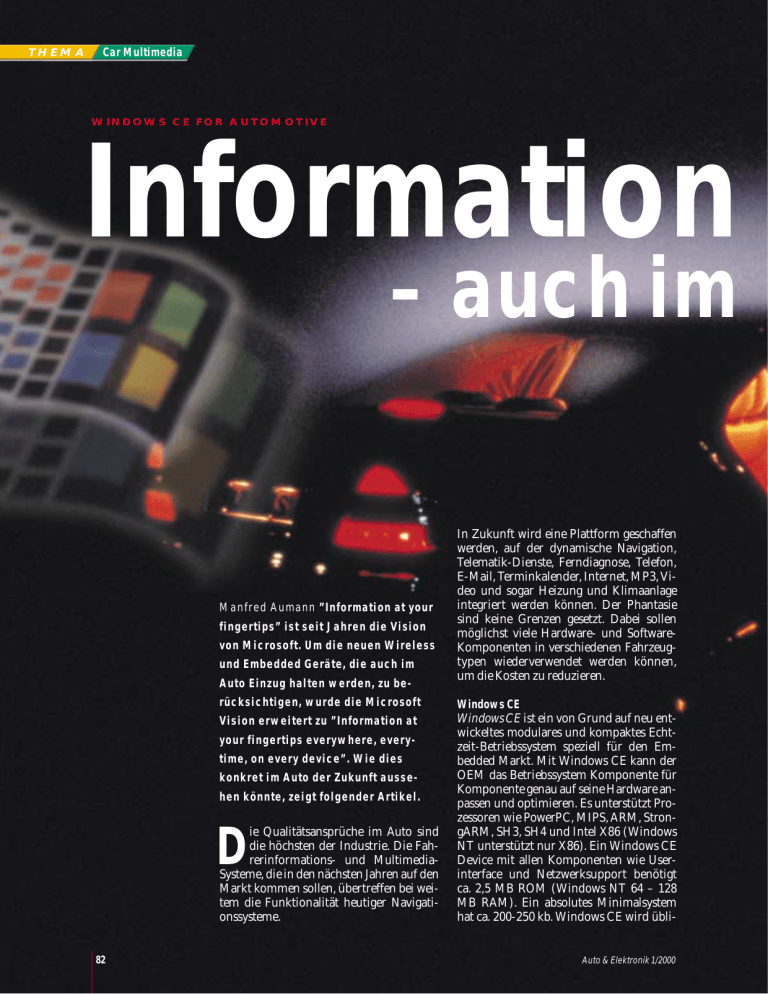THEMA Car Multimedia WINDOWS CE FOR AUTOMOTIVE Information – auch im Manfred Aumann ”Information at your fingertips” ist seit Jahren die Vision von Microsoft. Um die neuen Wireless und Embedded Geräte, die auch im Auto Einzug halten werden, zu berücksichtigen, wurde die Microsoft Windows CE Vision erweitert zu ”Information at Windows CE ist ein von Grund auf neu entwickeltes modulares und kompaktes Echtzeit-Betriebssystem speziell für den Embedded Markt. Mit Windows CE kann der OEM das Betriebssystem Komponente für Komponente genau auf seine Hardware anpassen und optimieren. Es unterstützt Prozessoren wie PowerPC, MIPS, ARM, StrongARM, SH3, SH4 und Intel X86 (Windows NT unterstützt nur X86). Ein Windows CE Device mit allen Komponenten wie Userinterface und Netzwerksupport benötigt ca. 2,5 MB ROM (Windows NT 64 – 128 MB RAM). Ein absolutes Minimalsystem hat ca. 200-250 kb. Windows CE wird übli- your fingertips everywhere, everytime, on every device”. Wie dies konkret im Auto der Zukunft aussehen könnte, zeigt folgender Artikel. ie Qualitätsansprüche im Auto sind die höchsten der Industrie. Die Fahrerinformations- und MultimediaSysteme, die in den nächsten Jahren auf den Markt kommen sollen, übertreffen bei weitem die Funktionalität heutiger Navigationssysteme. D 82 In Zukunft wird eine Plattform geschaffen werden, auf der dynamische Navigation, Telematik-Dienste, Ferndiagnose, Telefon, E-Mail, Terminkalender, Internet, MP3, Video und sogar Heizung und Klimaanlage integriert werden können. Der Phantasie sind keine Grenzen gesetzt. Dabei sollen möglichst viele Hardware- und SoftwareKomponenten in verschiedenen Fahrzeugtypen wiederverwendet werden können, um die Kosten zu reduzieren. Auto & Elektronik 1/2000 Car Multimedia THEMA at Your Fingertips Auto? cherweise direkt vom ROM ausgeführt und muss somit nicht gebootet werden. Windows CE unterstützt ein Subset von Win32API, so dass Windows NT Programmierer sich sehr schnell mit Windows CE Anwendungsentwicklung zurechtfinden. Auch aus Windows NT her bekannte Technologien wie DCOM, MSQS, TAPI, DirectX stehen unter Windows CE als Subset zur Verfügung, so dass Windows NT Anwendungen relativ einfach auf Windows CE portiert werden können. Windows CE for Automotive Windows CE for Automotive ist ein Superset von Windows CE 3.0 mit Funktionen und Prozesse speziell für Automotive Kunden. Die verschiedenen Versionen sind: Apollo - Auto PC Version 1.0 Goldeneye - Auto PC Version 2.0 Auto & Elektronik 1/2000 Ab Version 3.0 wird Auto PC umbenannt in Windows CE for Automotive Thunderball - Windows CE for Automotive 3.0 Moonraker - Windows CE for Automotive 4.0 Ein Automotive Team bei Microsoft testet die Default Automotive Konfigurationen zusätzlich zu den Standard Tests nochmals in der Auto- Windows CE 3.0 bietet Hard- motive Umgebung, um StabiRealtime, DCOM, MSQ, Di- lität zu garantieren rectX, HTTP Server, Internet Explorer 4.0 control, TAPI, Pocket Word, Pocket Inbox (E-Mail), Help System usw. Windows CE for Automotive bietet zusätzliche Funktionen und API’s für den Automobilmarkt und wird zusätzlich in der Automotive Umgebung gestestet, um eine extreme Stabilität und Qualität zu garantieren. 83 THEMA Car Multimedia Stabilität und Qualität Im Auto ist kein Reset Knopf erlaubt. Software muss unter allen Umständen stabil funktionieren und darf nie ausfallen. Fehler werden protokolliert und können später beim Wartungsdienst ausgelesen werden. Außerdem besitzt Windows CE for Automotive die Möglichkeit, dass nur zertifizierte Software installiert werden kann. Somit kann kontrolliert werden, welche Software von wem installiert wird. Von der Fachwerkstatt oder dem Endanwender selbst. Das Microsoft Automotive Team testet die Default Automotive Konfigurationen zusätzlich zu den Standard Tests nochmals in der Automotive Umgebung, um Stabilität zu garantieren. OEM Partner von Microsoft bekommen Testtools und können als Dienstleistung ihr System bei Microsoft oder Partnern wie der 3SOFT GmbH testen lassen. Flexibles Mensch-Maschine-Interface Bildschirme werden mit neuartigen Bedienungskonzepten den heutigen Bedienelementen Platz machen. Die Bedienungskonzepte werden sich sehr Microsoft, hat desstark vom PC unterscheiden. PC-übhalb einen Critical liche Tastatur, Maus oder TouchscreProcess Monitor entens wird es im Auto nicht geben. Zumindest nicht für den Fahrer, weil sie wickelt, der fehlerwährend der Fahrt nicht bedient werhafte Anwendungen den können oder vom Verkehr zu und Treiber erkennt, stark ablenken. Deshalb spielt die Bedienung über Sprache in Zukunft eiautomatisch abne immer größere Rolle. bricht und neu starBedienelemente, Bildschirmgröße, tet, ohne dass der Bildschirmauflösung und die Anzahl der Bildschirme und Bedienelemente Anwender etwas dawerden von Auto zu Auto selbst invon merkt. nerhalb einer Automarke sehr verschieden sein. Kleinwagen werden einfachere Geräte für Navigation und Telematik bekommen als Autos aus der Mitteloder Luxusklasse. Die Bandbreite geht von einem kleinen schwarz/weiss 4-Zeilendisplay bis zu großen hochauflösenden Farbdisplays. In Luxusautos bekommen sogar Beifahrer und Passagiere im Fond eigene Bildschirme. Windows CE for Automotive erlaubt völlige Freiheit bei der Gestaltung des Userinterfaces. Zum Userinterface gehören graphische Gestaltung am Bildschirm, Eingabe und Bedienelemente, Sprachbedienung, Text to Speech und die Bedienlogik. Win- 84 dows CE for Automotive unterstützt beliebige Bedienelemente (Softkeys, Drehdruckknöpfe, Joystick, Touchscreen etc.) und Spracherkennungssysteme (über SPI) und ermöglicht dem Automobilhersteller völlige Freiheit bei der Gestaltung seines Userinterfaces für seine verschiedenen Fahrzeugtypen. Es unterstützt außerdem mehrere Bildschirme mit unterschiedlicher Auflösung an einem Gerät. Automobilhersteller haben noch ein zusätzliches Problem. Im Auto steht immer weniger Raum für neue Systeme zur Verfügung. Des