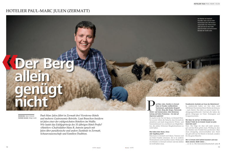 HOTELIER TALK PAUL-MARC JULEN HOTELIER PAUL-MARC JULEN (ZERMATT) Der Hotelier im Schafstall: Paul-Marc Julen und sein Vater Paul besitzen über 300 Schwarznasenschafe. Das «Thema Schaf» zieht sich wie ein roter Faden durch die Hotels und GastronomieBetriebe der Familie Julen. Der Berg allein genügt nicht INTERVIEW Hans R. Amrein PORTRÄT-BILDER Holger Jacob 18 P aul-Marc Julen, Hoteliers in Zermatt leben im Paradies: weltberühmter Tourismusort, spektakuläre Bergwelt mit dem «Berg aller Berge», florierende Winter- und Sommersaison, hohe Zimmerauslastung und hohes Preisniveau – Sie sind auf Alpenrosen gebettet! Es macht in der Tat viel Spass, in Zermatt Hotelier zu sein! Allein die Tatsache, dass Zermatt ein attraktiver und stark frequentierter Winter- und Sommerferienort ist, erschliesst uns Möglichkeiten, die andere Schweizer Bergdestinationen so nicht haben. Paul-Marc Julen führt in Zermatt drei Viersterne-Hotels und mehrere Gastronomie-Betriebe. Laut Branchen-Insidern ist Julen einer der erfolgreichsten Hoteliers im Wallis. Wie lautet das Erfolgsprinzip des 35-jährigen Hotel-Profis? «Hotelier»-Chefredaktor Hans R. Amrein sprach mit Julen über paradiesische und andere Zustände in Zermatt, Schwarznasenschafe und Familien-Tradition. 6 I2016 Was haben denn Davos, Arosa oder Engelberg nicht? Man kann in Zermatt noch Ideen, Visionen und am Ende Projekte umsetzen, die so in anderen Destinationen nicht machbar wären. Wobei auch ein Hotelier in Zermatt rechnen und die Zahlen im Griff haben muss. 6 I2016 Paradiesische Zustände am Fusse des Matterhorns? Ja, andererseits haben wir hier oben rund 130 Hotels! Die höchste Hotel-Dichte der Schweiz – nach Zürich. Das führt zu einem harten Verdrängungswettbewerb. Und fast alle haben die gleiche Zielgruppe im Visier: Feriengäste und Gruppentouristen. Wie leben Sie mit fast 130 Mitbewerbern im Rücken? Findet da ein brutaler Kampf um jedes Hotel-Bett statt? Nein. Die Folge ist, dass sich jeder anstrengen und das Beste geben muss. Wichtig ist, dass der Hotelier sein Produkt klar positioniert. Man muss einzigartig, unverwechselbar sein. Doch das gilt nicht nur für Hotels in Zermatt, sondern für die ganze Branche. Wer in Zermatt nicht laufend investiert und neue Ideen umsetzt, bleibt stehen … … so ist es. Die Innovationsbereitschaft unter ❯ 19 HOTELIER TALK PAUL-MARC JULEN terzuentwickeln und eines Tages an die nächste Generation weiterzugeben. Es ist einfach, einen Betrieb zu übernehmen. Und hätten meine Vorfahren nicht so klug, weitsichtig und nachhaltig gehandelt, wäre es für mich nicht so einfach gewesen. Jetzt geht es darum, das Unternehmen erfolgreich in die Zukunft zu führen. Ihre Familie gilt als sehr erfolgreich. «Tradition Julen Zermatt» gilt in der Branche als Vorzeigebetrieb. Was ist Ihr Erfolgsprinzip? Die zentrale Frage, die sich heute jeder Hotelier stellen muss: Wie mache ich mein Hotel einzigartig? Wir haben in der Familie intensiv über diese Frage gesprochen. Familie Julen. den Hoteliers in Zermatt ist grösser als andernorts. Wenn ich als Hotelier vermeiden will, dass meine Gäste abwandern und beim Mitbewerber absteigen, muss ich mein Produkt laufend verbessern und an die neuen Bedürfnisse anpassen. « DIE ZENTRALE FRAGE, DIE SICH HEUTE JEDER HOTELIER STELLEN MUSS: WIE MACHE ICH MEIN HOTEL EINZIGARTIG? » PAUL-MARC JULEN Welche Zielgruppen peilen Sie an? Im Winter dominiert der klassische alpine Skitourist. Im Sommer spielt der Ausflugstourismus eine wichtige Rolle. In der Zwischensaison und im Sommer kommt das Gruppengeschäft dazu. Dann bevölkern die Asiaten Klein-Matterhorn und Gornergrat. Schauen Sie, wir brauchen eine gewisse Auslastung in der Zwischensaison. Diese erreichen wir mit Gruppen. Dank der Zwischensaison können wir vielen Mitarbeitern eine Ganzjahresstelle anbieten. Und das wirkt sich direkt auf die Service-Qualität aus, auch im Sommer, wenn der Individualgast kommt. Man könnte sagen: Gruppen sind Mittel zum Zweck. Ja. Man könnte auch sagen: Der Berg allein genügt nicht, um in Zermatt Erfolg zu haben. Ja, schon. Doch das Matterhorn ist ein einzigartiges Verkaufsargument. Ein Alleinstellungsmerkmal, wie es unsere Mitbewerber im Engadin oder Tirol nicht haben. Der Berg garantiert uns eine ganzjährige Nachfrage. Trotzdem gebe ich Ihnen recht: Das Matterhorn reicht vielleicht, um in Zermatt Hotelier zu sein, aber es reicht nicht, um in Zermatt ein erfolgreicher Unternehmer zu sein. Sie führen – zusammen mit Ihrer Frau Cindy – seit 2013 drei Hotels und diverse Restaurantbetriebe der Familie Julen. In der vierten Generation … Schon als kleiner Bub stand für mich fest: Ich will eines Tages Hotelier sein. Hotelier und daneben ein wenig Landwirtschaft – das war schon immer mein Ziel. Derzeit bin ich vor allem Hotelier. 20 Mein Vater, Paul Julen, führt den Landwirtschaftsbetrieb der Familie mit etwa 300 Schwarznasenschafen und Kühen. Sie hätten als Absolvent der Hotel-Fachschule Luzern eine internationale Karriere als HotelManager anpeilen können. Ich bin ein Familienmensch. Ich wollte immer eine Familie haben. Eigene Kinder, eine Nachfolge aufbauen. Zermatt war für mich der ideale Ort, eine Familie zu gründen. Wie sehen Sie Ihre Rolle? Ich bin Hotelier und Familienunternehmer. Ich führe eine über 100-jährige Familientradition weiter und möchte das «Werk» eines Tages meinen Kindern weitergeben. Paul-Marc Julen, vierte Generation, Erbe und Nachfolger. Alles war schon da: die Hotels, die Gastronomie-Betriebe, ein gewisses Vermögen. Seine Vorfahren haben es aufgebaut – und er, der 35-jährige Junior, setzt sich einfach ins gemachte Nest. Was sagen Sie dazu? (lacht) Absolut richtig! Doch die grosse Herausforderung liegt darin, das Unternehmen mit Erfolg weiterzuführen, wei- Was haben die Familiengespräche ergeben? Die Familie Julen hat eine lange Tradition, dabei spielt die Landwirtschaft eine wichtige Rolle. Und genau da haben wir bei der Positionierung unsere