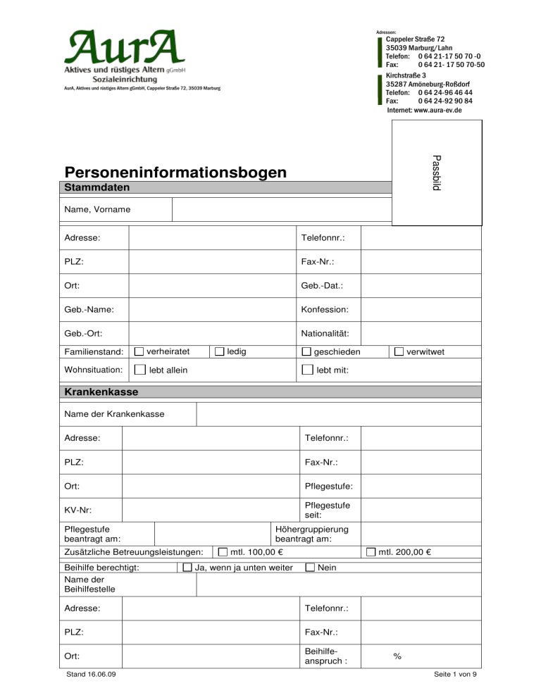 Adressen: Cappeler Straße 72 35039 Marburg/Lahn Telefon: 0 64 21-17 50 70 -0 Fax: 0 64 21- 17 50 70-50 Kirchstraße 3 35287 Amöneburg-Roßdorf Telefon: 0 64 24-96 46 44 Fax: 0 64 24-92 90 84 Internet: www.aura-ev.de AurA, Aktives und rüstiges Altern gGmbH, Cappeler Straße 72, 35039 Marburg Passbild Personeninformationsbogen Stammdaten Name, Vorname Adresse: Telefonnr.: PLZ: Fax-Nr.: Ort: Geb.-Dat.: Geb.-Name: Konfession: Geb.-Ort: Nationalität: Familienstand: verheiratet Wohnsituation: lebt allein ledig geschieden verwitwet lebt mit: Krankenkasse Name der Krankenkasse Adresse: Telefonnr.: PLZ: Fax-Nr.: Ort: Pflegestufe: KV-Nr: Pflegestufe seit: Pflegestufe beantragt am: Höhergruppierung beantragt am: Zusätzliche Betreuungsleistungen: Beihilfe berechtigt: Name der Beihilfestelle mtl. 100,00 € Ja, wenn ja unten weiter mtl. 200,00 € Nein Adresse: Telefonnr.: PLZ: Fax-Nr.: Ort: Beihilfeanspruch : Stand 16.06.09 % Seite 1 von 9 Abweichender Rechnungsempfänger für den Eigenanteil Ist der Gast nicht der Rechnungsempfänger für den Eigenanteil, den Empfänger bitte hier eintragen: Name. Vorname Adresse: PLZ: Ort.: Gewünschte Besuchstage der Tagespflege Mo Di Mi Do Fr Sa Kontaktpersonen 1. Angehöriger Verwandtschaftsgrad: Name, Vorname Adresse: Tel. beruf.: PLZ: Fax-Nr.: Ort: E-Mail: Tel.: Mobil: Notfall-Nr: 2. Angehöriger Benachrichtigung bei Besonderheit Ja Nein Verwandtschaftsgrad: Name, Vorname Adresse: Tel. beruf.: PLZ: Fax-Nr.: Ort: E-Mail: Tel.: Mobil: Notfall-Nr: Stand 16.06.09 Benachrichtigung bei Besonderheit Ja Nein Seite 2 von 9 3. Angehöriger Verwandtschaftsgrad: Name, Vorname Adresse: Tel. beruf.: PLZ: Fax-Nr.: Ort: E-Mail: Tel.: Mobil: Notfall-Nr: Ja Nein Benachrichtigung bei Besonderheit Ambulante Dienste Name, Vorname Adresse: Telefonnr.: PLZ: Fax-Nr.: Ort: E-Mail: Erbrachte Leistungen des ambulanten Pflegedienstes: Leistungen der Pflegeversicherung SGB XI Große Pflege Kleine Pflege Inanspruchnahme des Pflegedienstes: Mo Di Mi Leistungen der Krankenkasse SGB V Behandlungspflege Do Fr Sa So Physiotherapie / Krankengymnastik Name, Vorname Adresse: Telefonnr.: PLZ: Fax-Nr.: Ort: E-Mail: Erbrachte Leistung der Physiotherapie: kurze Beschreibung der Therapie Stand 16.06.09 Seite 3 von 9 Ergotherapie / Beschäftigungtherapie Name, Vorname Adresse: Telefonnr.: PLZ: Fax-Nr.: Ort: E-Mail: Erbrachte Leistung der Ergotherapie: kurze Beschreibung der Therapie Ärzte Hausarzt Name, Vorname Adresse: Telefonnr.: PLZ: Fax-Nr.: Ort: E-Mail: Facharzt 1 Name, Vorname Fachgebiet: Neurologe Internist Psychiater Urologe Sonstige: Adresse: Telefonnr.: PLZ: Fax-Nr.: Ort: E-Mail: Facharzt 2 Name, Vorname Fachgebiet: Neurologe Internist Psychiater Urologe Sonstige: Adresse: Telefonnr.: PLZ: Fax-Nr.: Ort: E-Mail: Stand 16.06.09 Seite 4 von 9 Patientenverfügung Liegt eine Patientenverfügung vor? Wenn Ja, bitte Kopie beifügen. Ja Nein Diagnose wenn möglich Kopien der letzten Arztbriefe Schilderung der derzeit wichtigsten Krankheitserscheinungen, insbesondere der vorliegenden Funktionsstörungen – u.a. Bewegungsapparat, Sinnesorgane, Kreislauf: Liegen psychische Störungen vor? Ja, wenn ja welche? Nein Benötigt Hilfe bei Gehen: Nein Gelegentlich Oft Dauernd Waschen: Nein Gelegentlich Oft Dauernd Ankleiden: Nein Gelegentlich Oft Dauernd Frisieren und Rasieren: Nein Gelegentlich Oft Dauernd Aufstehen Nein Gelegentlich Oft Dauernd Benutzen der Toilette: Nein Gelegentlich Oft Dauernd Treppegehen: Nein Gelegentlich Oft Dauernd Essen: Nein Gelegentlich Oft Dauernd Der Gast ist Desorientiert: Ja Nein zeitlich: Nein Gelegentlich Oft Dauernd örtlich: Nein Gelegentlich Oft Dauernd persönlich: Nein Gelegentlich Oft Dauernd situativ: Nein Gelegentlich Oft Dauernd Inkontinenz Stuhlinkontinenz Nein Gelegentlich Oft Dauernd Urininkontinenz Nein Gelegentlich Oft Dauernd Dauerkatheder Nein Ja Wie ist die Gemütsstimmung (seelische Verfassung)? freundlich kooperativ/offen Ist eine Weglauftendenz vorhanden? Ja Nein Besteht eine Suchtkrankheit? Ja Nein Stand 16.06.09 unzufrieden Seite 5 von 9 Allergien / Unverträglichkeiten Speisen Benötigt der Gast spezielle Kostformen (Diät/Schonkost)? Vorlieben Stand 16.06.09 Ja Nein Abneigungen Seite 6 von 9 Kurzbiographie Mit Bitte um Schilderung der wichtigsten Lebensdaten Ihres Angehörigen Interessen und Gesprächsthemen: Themen die vermieden werden sollten: Stand 16.06.09 Seite 7 von 9 Medikamentenplan Medikament Stand 16.06.09 Stärke Form Morgens Vormittags Dosierung Mittags Nachmittags Abends Nachts Seite 8 von 9 Leitfaden Was ist nach der Entscheidung, die Tagespflege zu besuchen, noch zu tun? 1. Damit die Tagespflege die „Pflegebedingten Aufwendungen“ mit der Pflegekasse abrechnen kann, muss die Pflegekasse in Kenntnis gesetzt werden, dass der Versicherte nun Tagespflegeleistungen in Anspruch nimmt. 2. Ist der Versicherte bereits in eine der drei Pflegestufen eingruppiert worden, und wird bereits Pflegegeld von der Pflegekasse bezogen, so muss die Leistung von Pflegegeld auf Kombinationsleistung per Antrag „umgestellt“ werden. Die Vordrucke erhalten Sie bei Ihrer zuständigen Pflegekasse oder auf den jeweiligen Internetseiten. 3. Des Weiteren wird oft übersehen, das der Eigenanteil durch Einreichen der Originalrechnungen von der Pflegekasse zurückerstattet werden kann. Dafür muss der Medizinische Dienst die Vorraussetzungen nach §45a SGB XI bei dem Versicherten festgestellt haben. Sollte eine Prüfung durch den Medizinischen Dienst noch nicht stattgefunden haben, können Sie dies bei der zuständigen Pflegekasse beantragen. Im folgenden ersehen Sie die zu prüfenden Anspruchsvorraussetzungen: 1. 2. 3. unkontrolliertes Verlassen des Wohnbereiches (Weglauftendenz); Verkennen oder Verursachen gefährdender Situationen; unsachgemäßer Umgang mit gefährlichen Gegenständen oder potenziell gefährdenden Substanzen; 4. tätlich oder verbal aggressives Verhalten in Verkennung der Situation; 5. im situativen Kontext inadäquates Verhalten; 6. Unf