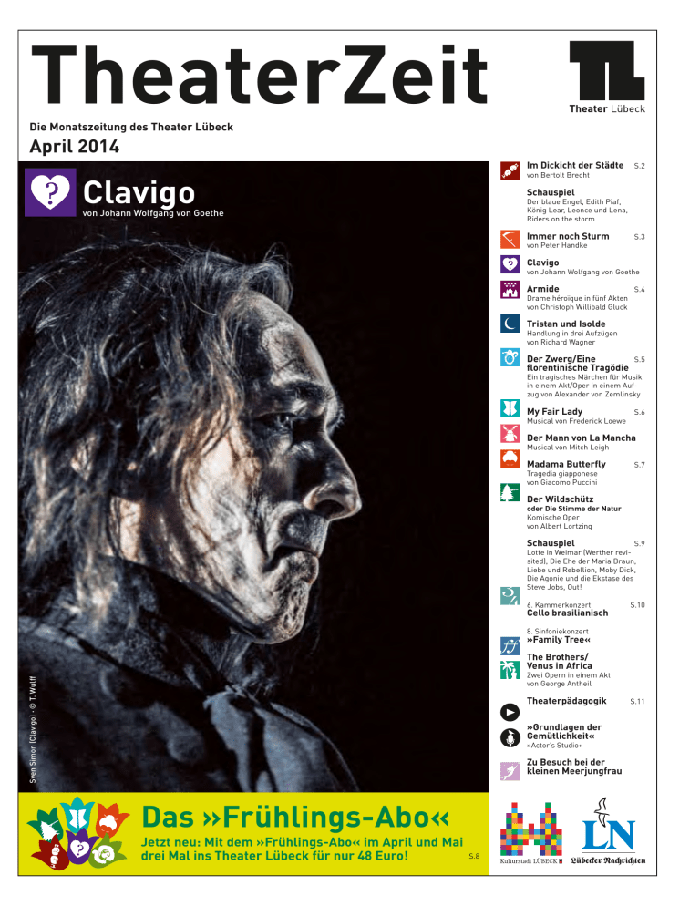 TheaterZeit Die Monatszeitung des Theater Lübeck April 2014 Im Dickicht der Städte S.2 von Bertolt Brecht Clavigo Schauspiel Der blaue Engel, Edith Piaf, König Lear, Leonce und Lena, Riders on the storm von Johann Wolfgang von Goethe Immer noch Sturm S.3 von Peter Handke Clavigo von Johann Wolfgang von Goethe Armide S.4 Drame héroïque in fünf Akten von Christoph Willibald Gluck Tristan und Isolde Handlung in drei Aufzügen von Richard Wagner Der Zwerg/Eine lorentinische Tragödie S.5 Ein tragisches Märchen für Musik in einem Akt/Oper in einem Aufzug von Alexander von Zemlinsky My Fair Lady S.6 Musical von Frederick Loewe Der Mann von La Mancha Musical von Mitch Leigh Madama Butterly S.7 Tragedia giapponese von Giacomo Puccini Der Wildschütz oder Die Stimme der Natur Komische Oper von Albert Lortzing Schauspiel S.9 Lotte in Weimar (Werther revisited), Die Ehe der Maria Braun, Liebe und Rebellion, Moby Dick, Die Agonie und die Ekstase des Steve Jobs, Out! 6. Kammerkonzert Cello brasilianisch S.10 8. Sinfoniekonzert »Family Tree« The Brothers/ Venus in Africa Sven Simon (Clavigo) · © T. Wulff Zwei Opern in einem Akt von George Antheil Theaterpädagogik »Grundlagen der Gemütlichkeit« »Actor’s Studio« Zu Besuch bei der kleinen Meerjungfrau Das »Frühlings-Abo« Jetzt neu: Mit dem »Frühlings-Abo« im April und Mai drei Mal ins Theater Lübeck für nur 48 Euro! S.8 S.11 2 Im Dickicht der Städte von Bertolt Brecht »Das, was unterschwellig rumort, ist in der Inszenierung wesentlich beängstigender als der Hass, das Elend und die Gewalt: Shlink (Susanne Höhne), geheimnisvoll lächelnd wie die Mona Lisa, verschenkt ohne ersichtlichen Grund seinen Holzhandel an Garga und vernichtet gleichzeitig seine sozialen Beziehungen, doch auch der unbedarfte Garga (Henning Sembritzki) entwickelt unmenschliche Züge. Gargas Geliebte Jane (Ingrid Noemi Stein) und seine pietistische Schwester Marie (Evamaria Salcher) landen in der Prostitution, Garga drei Jahre im Gefängnis. Überhaupt wird gesoffen, geprügelt, gehurt und aneinander verraten, bis nichts mehr geht. ›Der Mensch ist frei, Garga‹, verkündet Shlink – ein pervertierter Existenzialismus, der erfrischend unpsychologisch daherkommt.« (taz) Termine Fr 04/04, 20.00 Uhr, Einführung um 19.30 Uhr im Mittelrangfoyer, Fr 25/04, 20.00 Uhr, Kammerspiele Thomas Schreyer (Pavian, ein Zuhälter), Ingrid Noemi Stein (Jane Larry) · © T. Wulff Der blaue Engel Edith Piaf nach dem Roman »Professor Unrat« von Heinrich Mann und dem Film »Der blaue Engel« von Josef von Sternberg von Pit Holzwarth Ein außergewöhnlicher Abend über ein außergewöhnliches Leben »Vasiliki Roussi ist ein Glücksgriff, denn sie spielt nicht den Spatz von Paris, sie ist die kleine große Piaf. Von der Statur her und vor »Hervorragendes Schauspiel ist zu besichtigen, nicht nur von Sara Wortmann und Peter Grünig, die ihre Charaktere mit betörend viel Seele ausstatten.« (Lübeckische Blätter) Sara Wortmann (Lola), Herbert Kriesel (ein Clown) · © T. Wulff König Lear von William Shakespeare Termine Fr 04/04, 19.30 Uhr Sa 12/04, 19.30 Uhr, Einführung um 19.00 Uhr im Mittelrangfoyer, Fr 25/04, 19.30 Uhr, Großes Haus Nur noch 3 Mal! allem mit ihrer Stimme, die die ganze Registerbreite von zerbrechlicher Zärtlichkeit bis zum vollen Orgelklang der Sehnsucht, der Leidenschaft und des Triumphs.« (Kieler Nachrichten) Vasiliki Roussi (Piaf), Henning Sembritzki (Cerdan) · © T. Wulff Leonce und Lena Ein Lustspiel von Georg Büchner »Holzwarth inszeniert Shakespeare als Fest für Ensemble und Publikum. Sein König ist der körperlich schmale und komödiantisch große Robert Brandt, dem es gelingt, die zweite Seite der TyrannenMedaille – Unsicherheit, Borniertheit, Feigheit – zu zeigen.« (shz) Anne Schramm (Regan), Susanne Höhne (Goneril) · © T. Wulff Termine So 06/04, 18.30 Uhr, Einführung um 18.00 Uhr im Mittelrangfoyer, Sa 26/04, 20.00 Uhr, Kammerspiele Termin Mi 30/04, 19.30 Uhr, Großes Haus n Mal! Zum letzte »›Leonce und Lena‹ beginnt urkomisch, doch das Lachen wagt nicht, laut zu werden, denn die Charaktere scheinen beängstigend bekannt. [...] Die schauspielerischen Leistungen sind exzellent; insbesondere Hutzel (Leonce) und Grünig (König) sezieren das vermoderte Königtum mit dem Skalpell schauriger Komik.« (shz) Peter Grünig (Wirt), Götz van Ooyen (Valerio) · © T. Wulff Riders on the storm Termin Sa 05/04, 20.00 Uhr, Theatertag (10 Euro), zum letzten Mal, Kammerspiele Jim Morrison und »The Doors« · Uraufführung von Pit Holzwarth · Uraufführung Fr 16/05, 20.00 Uhr, Kammerspiele Theaterkasse 0451 / 399 600 3 Immer noch Sturm von Peter Handke Peter Handke führt uns mit seinem sehr poetischen und wohl persönlichsten Theaterstück an den Ort seiner Ahnen ins kärntnerische Jaunfeld. »Da seid ihr nun, Vorfahren. Die längste Zeit habe ich auf euch gewartet«, mit diesen Worten kata- gangenheit eintauchen. Die Zeitreise führt uns dabei von der Vorkriegszeit des Jahres 1936, über den 2. Weltkrieg, in dem ein Teil der Familie des Ich-Erzählers sich den slowenischen Partisanen in den südkärnterischen Wäldern anschließt, bis hinein in »Ungewohnt weit war jener Heimathorizont.« pultiert uns der Autor gleich zu Beginn des Schauspiels an einen seltsamen Ort, in eine zeitlose Gegend, jenseits der Kategorien von Zeit und Raum, in der die Figuren gleichsam aus dem Nebel der Geschichte erscheinen, um mit dem Autor und IchErzähler des Stücks in Kommunikation zu treten. In seinem zwischen Traumspiel und geschichtlichen Begebenheiten mäanderndem Stück setzt sich der Autor mit die Nachkriegszeit, in der die slowenische Volksgruppe – obwohl sie als eine von wenigen dem Naziregime nennenswerten Widerstand leistete – im neugegründeten Staat Österreich gesellschaftlich schnell wieder zurückgedrängt wurde. Peter Handke kann man wohl als einen der kreativsten, vielseitigsten und erindungsreichsten Autoren überhaupt bezeich