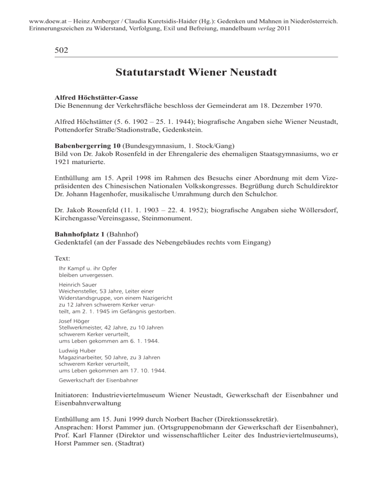www.doew.at – Heinz Arnberger / Claudia Kuretsidis-Haider (Hg.): Gedenken und Mahnen in Niederösterreich. Erinnerungszeichen zu Widerstand, Verfolgung, Exil und Befreiung, mandelbaum verlag 2011 502 Statutarstadt Wiener Neustadt Alfred Höchstätter-Gasse Die Benennung der Verkehrsfläche beschloss der Gemeinderat am 18. Dezember 1970. Alfred Höchstätter (5. 6. 1902 – 25. 1. 1944); biografische Angaben siehe Wiener Neustadt, Pottendorfer Straße/Stadionstraße, Gedenkstein. Babenbergerring 10 (Bundesgymnasium, 1. Stock/Gang) Bild von Dr. Jakob Rosenfeld in der Ehrengalerie des ehemaligen Staatsgymnasiums, wo er 1921 maturierte. Enthüllung am 15. April 1998 im Rahmen des Besuchs einer Abordnung mit dem Vizepräsidenten des Chinesischen Nationalen Volkskongresses. Begrüßung durch Schuldirektor Dr. Johann Hagenhofer, musikalische Umrahmung durch den Schulchor. Dr. Jakob Rosenfeld (11. 1. 1903 – 22. 4. 1952); biografische Angaben siehe Wöllersdorf, Kirchengasse/Vereinsgasse, Steinmonument. Bahnhofplatz 1 (Bahnhof) Gedenktafel (an der Fassade des Nebengebäudes rechts vom Eingang) Text: Ihr Kampf u. ihr Opfer bleiben unvergessen. Heinrich Sauer Weichensteller, 53 Jahre, Leiter einer Widerstandsgruppe, von einem Nazigericht zu 12 Jahren schwerem Kerker verurteilt, am 2. 1. 1945 im Gefängnis gestorben. Josef Höger Stellwerkmeister, 42 Jahre, zu 10 Jahren schwerem Kerker verurteilt, ums Leben gekommen am 6. 1. 1944. Ludwig Huber Magazinarbeiter, 50 Jahre, zu 3 Jahren schwerem Kerker verurteilt, ums Leben gekommen am 17. 10. 1944. Gewerkschaft der Eisenbahner Initiatoren: Industrieviertelmuseum Wiener Neustadt, Gewerkschaft der Eisenbahner und Eisenbahnverwaltung Enthüllung am 15. Juni 1999 durch Norbert Bacher (Direktionssekretär). Ansprachen: Horst Pammer jun. (Ortsgruppenobmann der Gewerkschaft der Eisenbahner), Prof. Karl Flanner (Direktor und wissenschaftlicher Leiter des Industrieviertelmuseums), Horst Pammer sen. (Stadtrat) www.doew.at – Heinz Arnberger / Claudia Kuretsidis-Haider (Hg.): Gedenken und Mahnen in Niederösterreich. Erinnerungszeichen zu Widerstand, Verfolgung, Exil und Befreiung, mandelbaum verlag 2011 Statutarstadt Wiener Neustadt 503 Ökumenische Segnung der Gedenktafel: Pater Johannes Vrbecky und Pfarrer Peter Mömken. Musikalische Umrahmung: Eisenbahner-Musikkapelle. Josef Höger (geb. 1. 11. 1902), Stellwerkmeister aus Wiener Neustadt, KPÖ-Mitglied, wurde im August 1941 festgenommen und am 24. September 1942 vom OLG Wien wegen „Vorbereitung zum Hochverrat“ zu zehn Jahren Zuchthaus verurteilt. Im Juli 1943 erfolgte seine Verpflichtung zur „Bewährungseinheit“ 999 der Deutschen Wehrmacht. Höger starb in Zagreb am 6. November 1944 an den Folgen einer Kriegsverwundung. Ludwig Huber (geb. 24. 7. 1894), Reichsbahnangestellter aus Wiener Neustadt, gehörte der KPÖ-Organisation Kottingbrunn an. Er wurde im Juni 1940 festgenommen und am 14. November 1941 vom OLG Wien wegen „Vorbereitung zum Hochverrat“ zu drei Jahren Zuchthaus verurteilt. Im Juli 1943 erfolgte seine Verpflichtung zur „Bewährungseinheit“ 999 der Deutschen Wehrmacht. Seit 17. Oktober 1944 gilt Huber – zuletzt in Ston (Kroatien) stationiert – als vermisst. Heinrich Sauer (geb. 10. 4. 1892), Reichsbahnangestellter aus Wiener Neustadt, KPÖ-Funktionär, wurde im August 1941 festgenommen und am 24. September 1942 vom OLG Wien wegen „Vorbereitung zum Hochverrat“ zu zwölf Jahren Zuchthaus verurteilt. Er starb am 2. Jänner 1945 im Zuchthaus Stein. Siehe: Drei Neustädter Eisenbahner, die für die Freiheit starben, in: Wr. Neustädter Nachrichten, 11. 6. 1999, S. 11; Gedenktafelenthüllung in der Wartehalle des Bahnhofes, in: Amtsblatt der Statutarstadt Wiener Neustadt, 15. 6. 1999; Gedenktafelenthüllung in Wiener Neustadt, in: Der neue Mahnruf, Nr. 6–7/Juni–Juli 1999, S. 14. Baumkirchnerring 4 (Anton Proksch-Haus) Gedenktafel Text: Im Jahre 1902 errichtete die Israelitische Kultusgemeinde Wiener Neustadt an dieser Stelle nach Plänen des Wiener Architekten Wilhelm Stiassny eine repräsentative Synagoge in maurischem Stil. Ähnlich wie viele andere Synagogen des Landes ist auch die Wiener Neustädter Synagoge am 9. November 1938 von Nationalsozialisten devastiert und entweiht worden. Durch die darauffolgende gewaltsame Vertreibung aller Juden aus der Stadt hörte die Israelitische Kultusgemeinde Wiener Neustadt zu bestehen auf. Nach dem Ende des Zweiten Weltkrieges wurde die bombenbeschädigte ehemalige Synagoge abgetragen. Stifter: Stadtgemeinde Wiener Neustadt www.doew.at – Heinz Arnberger / Claudia Kuretsidis-Haider (Hg.): Gedenken und Mahnen in Niederösterreich. Erinnerungszeichen zu Widerstand, Verfolgung, Exil und Befreiung, mandelbaum verlag 2011 504 Statutarstadt Wiener Neustadt Enthüllung im August 1989. An dieser Stelle erinnerte bereits ab 1953/54 eine Gedenktafel an die zerstörte Synagoge. Siehe: Genée, Synagogen, S. 76 ff.; Flanner, Wiener Neustädter Synagoge. Eine Erinnerungstafel in Wiener Neustadt, in: Iskult-Presse-Nachrichten, Nr. 11, 25. 5. 1954; Synagogen-Gedenktafel am Anton Proksch-Haus, in: Amtsblatt der Statutarstadt Wr. Neustadt, September 1989, S. 11. Carl Szokoll-Park (gegenüber der Theresianischen Militärakademie) 1) Installation a) Text der vier Lichtsäulen: Recht Pflicht Moral Gewissen b) Gedenktafel (im Weg eingelassen) Text: Major Carl Szokoll (1915–2004) zählt durch die Rettung Wiens 1945 zu den prominentesten Persönlichkeiten des österreichischen Widerstandes gegen den Nationalsozialismus Recht Pflicht Moral Gewissen Lichtsäule im Carl SzokollPark, Wiener Neustadt Foto: Heinz Arnberger Markus Grabenwöger 2009 Initiator: Gemeinderat Mag. Dr. Michael Rosecker Stifter: Kulturabteilung der Stadt Wiener Neustadt Gestalter: Mag. Dipl.-Ing. Markus Grabenwöger Major Carl Szokoll (geb. 15. 10. 1915 in Wien), Absolvent der Militärakademie Wiener Neustadt, schloss sich als (österreichischer) Offizier der Deutschen Wehrmacht der