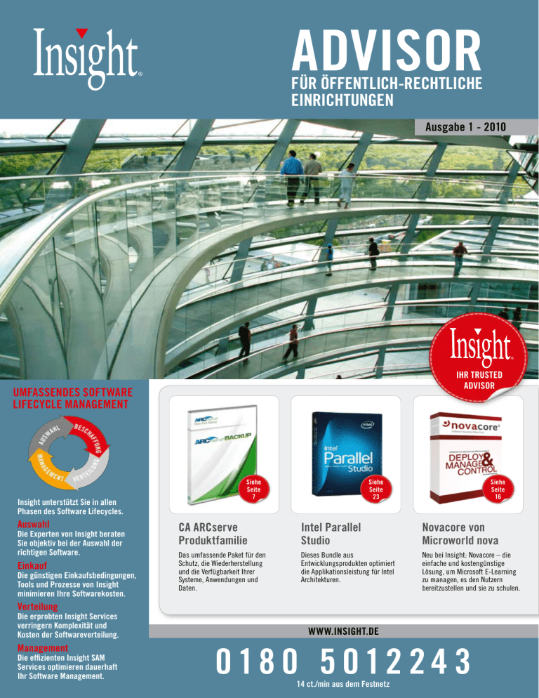 ADVISOR FÜR ÖFFENTLICH-RECHTLICHE EINRICHTUNGEN Ausgabe 1 - 2010 IHR TRUSTED ADVISOR UMFASSENDES SOFTWARE LIFECYCLE MANAGEMENT Insight unterstützt Sie in allen Phasen des Software Lifecycles. Auswahl Die Experten von Insight beraten Sie objektiv bei der Auswahl der richtigen Software. Einkauf Die günstigen Einkaufsbedingungen, Tools und Prozesse von Insight minimieren Ihre Softwarekosten. Siehe Seite 7 Siehe Seite 23 Siehe Seite 16 CA ARCserve Produktfamilie Intel Parallel Studio Novacore von Microworld nova Das umfassende Paket für den Schutz, die Wiederherstellung und die Verfügbarkeit Ihrer Systeme, Anwendungen und Daten. Dieses Bundle aus Entwicklungsprodukten optimiert die Applikationsleistung für Intel Architekturen. Neu bei Insight: Novacore – die einfache und kostengünstige Lösung, um Microsoft E-Learning zu managen, es den Nutzern bereitzustellen und sie zu schulen. Verteilung Die erprobten Insight Services verringern Komplexität und Kosten der Softwareverteilung. Management Die effizienten Insight SAM Services optimieren dauerhaft Ihr Software Management. WWW.INSIGHT.DE 0 18 0 5 0 12 2 4 3 14 ct./min aus dem Festnetz Mission Statement To be the trusted advisor to our clients, helping them enhance their organisations performance innovative technology solutions Seite 2 through 0180 501 22 43 14 ct./min aus dem Festnetz Editorial Sehr geehrte Leserinnen und Leser, Inhalt vor Ihnen liegt die erste Ausgabe unseres Insight Advisor für Öffentlich-Rechtliche Einrichtungen. Neben vielen Veröffentlichungen steht damit nun ein Nachschlagewerk in punkto Software und Lösungen speziell für Sie als Kunde aus dem öffentlich-rechtlichen Bereich, dem Gesundheitswesen und Forschung & Lehre zur Verfügung. Inhalt, Editorial 3 Insight Software Asset Management 4 Fallstudie BMF 5 ABBYY FineReader, OCR im Bildungssektor 6 CA, Data Recovery 7 F-Secure, Client Security 8 Hitachi, IT Infrastruktur Management 9 Insbesondere wollen wir mit ausgewählten Themen den Ansprüchen nach einer verbesserten, modernen und sicheren IT gerecht werden. Neben einer Auswahl an technologischen Trends steht auch die Verwaltung und die Planung des Einsatzes von IT-Werkzeugen im Vordergrund – kurz die effektive Steuerung des Lebenszyklus von Software in Organisationen! Im Rahmen vieler derartiger Projekte ist die Erkenntnis bestätigt worden, dass die gezielte Steuerung beim Einsatz von Software eine Kosteneinsparung zur Folge hat und gleichermaßen die Leistungsfähigkeit steigert. Schließlich sind heute die IT-Werkzeuge ein notwendiges Arbeitsmittel in der Verwaltung. Als einer der weltweit führenden Dienstleister bei der Beschaffung und dem Management von IT-Lösungen ist es selbstverständlich, dass wir auch die aktuellen Herausforderungen in bezug auf Datensicherheit, Business Intelligence, Systemmanagement sowie aktive Anwenderunterstützung annehmen. Dazu finden Sie eine Auswahl an Anwendungsbeispielen in unserem Advisor wieder. Ich bin der festen Überzeugung, dass Ihnen dieser Katalog bei der Beantwortung aktueller Fragen weiterhilft. Viele interessante Anregungen beim Lesen wünscht Ihnen Thomas Stoph Teamleiter Public Sector Germany Andreas Schwabe Enterprise Account Manager Public Sector Seite Intel, Software Engineering (Parallel Studio) 10 Ipswitch, Sichere Dateiübertragung 11 LANDesk, IT Infrastruktur Management 12 Mindjet, MindManager Projektmanagement 13 Microsoft, Office 2010, SharePoint 2010 14 Microsoft, SQL Server, GOLP 15 Microworld nova, eLearning Management 16 Nuance, PDF Konvertierung, Spracherkennung 17 SAP BO, Crystal Reports Reporting Software 18 Safestick, Security USB-Stick 19 Faxantwort 20 Seite 3 WWW.INSIGHT.DE Insight Technical Services Ihr Trusted Advisor für eine effiziente IT-Infrastruktur Mit unseren Insight Technical Services bieten wir Ihnen professionelle Dienstleistungen aus der Hand von IT-Experten mit langjähriger Erfahrung. Der Schwerpunkt liegt dabei auf Betriebssystemmigration, Virtualisierung, Inventarisierung und Softwareverteilung. Prozessberatung Basierend auf ITIL konformen Prozessen Software-Implementierungs- und Bereitstellungsstrategien Desktop- /Client Management: u. a. Microsoft System Center, LANDesk, FrontRange Sorgen Sie für einheitliche Standards auf Ihren Clients. Erinnern Sie sich noch an die Zeiten der Turnschuh-Administration? Sicher haben Sie viele Client-Management-Prozesse schon standardisiert. Wahrscheinlich setzen Sie mittlerweile auf eine professionelle Client-Management-Lösung. Doch haben Sie aus dieser Software schon alles rausgeholt? Denn die Einführung oder Reorganisation eines Client Management-Systems ist bekanntlich mit einigen Herausforderungen verbunden: »» Der Rollout benötigt Planungszeit, die oft fehlt. »» Der Rollout verursacht erhebliche Kosten. »» Die Risiken eines Rollouts sind hoch: Profil-Einstellungen, Drucker-Kompatibilität, Anwendungs-Kompatibilität etc. »» Darüber hinaus gilt es, den Roll-Out-Prozess klar zu definieren. Und das alles, während der IT-Betrieb ganz normal weitergehen muss.... »» Die Consultants der Insight stehen Ihnen mit Rat und Tat zur Seite, wenn es um die Auswahl des richtigen Client-Management Systems geht, und bieten Ihnen Unterstützung für eine reibungslose Implementierung und Wartung. Oder nutzen Sie unsere Insight Software Distribution Services, um sowohl auf eine professionelle Client-Management-Lösung als auch auf den personellen Support zurückzugreifen. Seite 4 Ob Novells NDS oder Active Directory Services von Microsoft mit Windows XP oder Windows.NET – unsere praxiserfahrenen und zertifizierten Experten begleiten Sie bei der Einführung, beginnend bei der Entscheidung über den Piloten, Konzeption und Rollout bis hin zum Support nach der erfolgreichen Einführung. Die Implementierung von MS Backoffice Lösungen wie z.B. Exchange oder Systems Management Server gehört dabei ebenso zu unserem Leistungsspektrum. Virtualisierung Mit VMware, Citrix, Microsoft Se