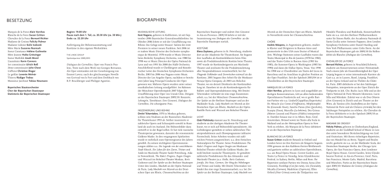 BIOGRAPHIEN BESETZUNG Marquis de la Force Alain Vernhes Blanche de la Force Susan Gritton Chevalier de la Force Bernard Richter Madame de Croissy Felicity Palmer Madame Lidoine Soile Isokoski Mère Marie Susanne Resmark Soeur Constance Hélène Guilmette Mère Jeanne Heike Grötzinger Soeur Mathilde Anaïk Morel L’aumônier Kevin Conners 1er commissaire Ulrich Reß 2ème commissaire John Chest L’officier Christian Rieger Le geôlier Levente Molnár Thierry Rüdiger Trebes Monsieur Javelinot Tobias Neumann Bayerisches Staatsorchester Chor der Bayerischen Staatsoper Statisterie der Bayerischen Staatsoper Beginn: 19.00 Uhr Pause nach dem 1. Teil, ca. 20.30 Uhr (ca. 30 Min.) Ende: ca. 22.20 Uhr Anfertigung der Bühnenausstattung und Kostüme in den eigenen Werkstätten. THE LINDE GROUP Spielzeitpartner 2009/2010 Dialogues des Carmélites, Oper von Francis Poulenc, Texte nach dem Werk von Georges Bernanos. Als Oper entstanden mit der Genehmigung von Emmet Lavery, nach der gleichnamigen Novelle von Gertrud von le Fort und dem Drehbuch von R.P. Bruckberger und Philippe Agostini. MUSIKALISCHE LEITUNG Kent Nagano, geboren in Kalifornien, ist seit September 2006 Bayerischer Generalmusikdirektor. Im Oktober 2006 leitete er mit der Uraufführung von Rihms Das Gehege sowie Strauss’ Salome die erste Premiere in seiner neuen Funktion. Seit 2006 ist er zudem Music Director des Orchestre symphonique de Montréal. 1978 wurde er Music Director beim Berkeley Symphony Orchestra, von 1988 bis 1998 war er Music Director der Opéra National de Lyon und von 1991 bis 2000 des Hallé Orchestra. Anschließend wurde er Chefdirigent und Künstlerischer Leiter des Deutschen Symphonie-Orchesters Berlin. 2003 bis 2006 war Nagano erster Music Director der Los Angeles Opera, nachdem er bereits zwei Jahre lang Principal Conductor der Oper gewesen war. Mehrere Opern wurden unter seiner musikalischen Leitung uraufgeführt. Im Rahmen der Münchner Opernfestspiele 2007 folgte die Uraufführung einer Oper von Unsuk Chin. Dirigate an der Bayerischen Staatsoper 2009/10: Konzerte, Lohengrin, Tannhäuser, Don Giovanni, Dialogues des Carmélites, Die schweigsame Frau. INSZENIERUNG UND BÜHNE Dmitri Tcherniakov, 1970 in Moskau geboren, schloss sein Studium an der Russischen Akademie für Theaterkunst 1993 ab. Seither inszenierte er zahlreiche Opern und Schauspiele sowohl in Russland als auch im Ausland. Die Bühnenbilder dazu entwirft er in der Regel selbst. Er hat viele russische Theaterpreise gewonnen, darunter die renommierte Goldene Maske. In den vergangenen Spielzeiten wurde er mehrfach zum Opernregisseur des Jahres gewählt. Zu seinen wichtigsten Operninszenierungen zählen u.a. Die Legende von der unsichtbaren Stadt Kitesch, Ein Leben für den Zaren, Tristan und Isolde im Mariinski-Theater Sankt Petersburg, Aida in Nowosibirsk, The Rake’s Progress, Eugen Onegin und Wozzeck im Bolschoi-Theater Moskau, Boris Godunow und Der Spieler an der Berliner Staatsoper Unter den Linden, Macbeth an der Opéra National de Paris, Lady Macbeth von Mzensk an der Deutschen Oper am Rhein, Chowanschtschina an der Bayerischen Staatsoper und zuletzt Don Giovanni in Aix-en-Provence. 2009/10 kehrte er mit der Inszenierung von Dialogues des Carmélites an die Bayerische Staatsoper zurück. KOSTÜME Elena Zaytseva, geboren in St. Petersburg, studierte dort an der Akademie für Theaterkunst. Sie begann ihre Laufbahn als Kostümbildnerin beim Film sowie als Produktionsleiterin Kostüm beim Theater. 1997 wurde sie Kostümdesignerin am MariinskiTheater und zeichnete für die Produktionsleitung aller Neuproduktionen verantwortlich; bei Der Fliegende Holländer und Dornröschen entwarf sie die Kostüme. 2001 begann ihre Arbeit für die Moskauer Novaja Opera Company, ab 2003 am BolschoiTheater, wo sie derzeit Direktorin der Kostümabteilung ist. Daneben ist sie als Kostümdesignerin für Ballett- und Opernproduktionen tätig. Mit Dmitri Tcherniakov verbindet sie eine enge Zusammenarbeit, u.a. bei der Münchner Chowanschtschina, Der Spieler an der Berliner Staatsoper und an der Mailänder Scala, Lady Macbeth von Mzensk an der Deutschen Oper am Rhein, Macbeth an der Opéra Bastille Paris und Wozzeck am Bolschoi-Theater. LICHT Gleb Filshtinsky stammt aus St. Petersburg und studierte an der dortigen Akademie für Theaterkunst, wo er sich auf Bühnenbild spezialisierte. Als Lichtdesigner gestaltete er neben zahlreichen Theaterproduktionen auch Showprogramme inklusive Pyrotechnik. Seine Arbeiten wurden mit zahlreichen Preisen ausgezeichnet, u.a. dem Estischen Nationalpreis für Theater. Seine Produktionen The Rake’s Progress und Eugen Onegin am Moskauer Bolschoi-Theater erhielt die Goldene Maske, der wohl höchste russische Theaterpreis. Er gestaltete zahlreiche Produktionen für das Alexander- und Mariinski-Theater (u.a. Otello, Boris Godunov, Jenůfa, Die Nase, Carmen, Der Ring des Nibelungen und Tristan und Isolde). Mit Dmitri Tcherniakov verbindet ihn eine enge Zusammenarbeit, u.a. bei Der Spieler an der Berliner Staatsoper, Lady Macbeth von Mzensk an der Deutschen Oper am Rhein, Macbeth in Novosibirsk sowie bei Chowanschtschina. CHÖRE Andrés Máspero, in Argentinien geboren, studierte Klavier und Dirigieren in Buenos Aires und promovierte in den USA zum Doctor of Musical Arts. Wichtige Stationen seiner Laufbahn waren das Teatro Municipal in Rio de Janeiro (1978 bis 1982) und das Teatro Colón in Buenos Aires (1983 bis 1985), die Summer-Opera in Washington (1985 bis 1990) und dann die Dallas Opera, Texas. Von 1990 bis 1998 war er Chordirektor am Teatro del Liceu in Barcelona und im Anschluss in gleicher Position an der Oper Frankfurt. Seit der Spielzeit 2003/04 ist er Chordirektor an der Bayerischen Staatsoper. MARQUIS DE LA FORCE Alain Vernhes, geboren in Lyon und ausgebildet am dortigen Konservatorium, tritt an allen bedeutenden Opernhäusern Frankreichs auf, wo er große Bariton-Partien wie u.a. Lindorf/Coppélius/Dapertutto/ Dr. Miracle (Les Cont