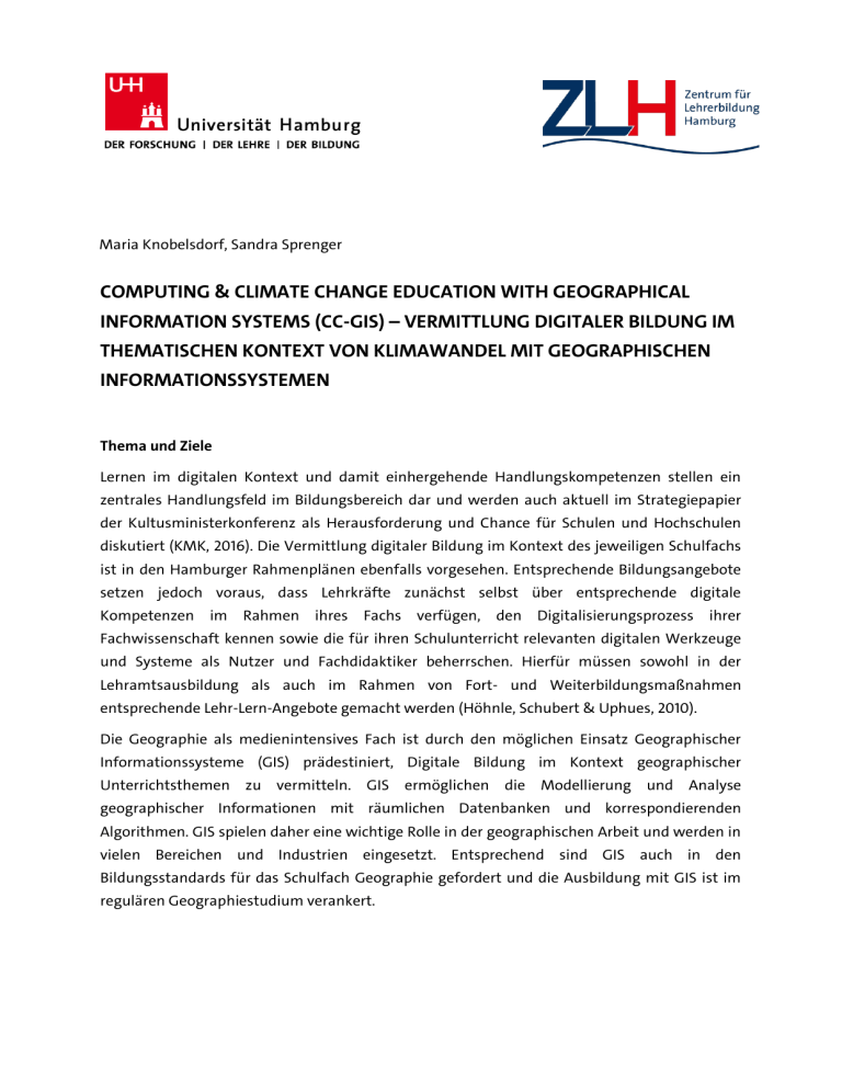 Maria Knobelsdorf, Sandra Sprenger COMPUTING & CLIMATE CHANGE EDUCATION WITH GEOGRAPHICAL INFORMATION SYSTEMS (CC-GIS) – VERMITTLUNG DIGITALER BILDUNG IM THEMATISCHEN KONTEXT VON KLIMAWANDEL MIT GEOGRAPHISCHEN INFORMATIONSSYSTEMEN Thema und Ziele Lernen im digitalen Kontext und damit einhergehende Handlungskompetenzen stellen ein zentrales Handlungsfeld im Bildungsbereich dar und werden auch aktuell im Strategiepapier der Kultusministerkonferenz als Herausforderung und Chance für Schulen und Hochschulen diskutiert (KMK, 2016). Die Vermittlung digitaler Bildung im Kontext des jeweiligen Schulfachs ist in den Hamburger Rahmenplänen ebenfalls vorgesehen. Entsprechende Bildungsangebote setzen jedoch voraus, dass Lehrkräfte zunächst selbst über entsprechende digitale Kompetenzen im Rahmen ihres Fachs verfügen, den Digitalisierungsprozess ihrer Fachwissenschaft kennen sowie die für ihren Schulunterricht relevanten digitalen Werkzeuge und Systeme als Nutzer und Fachdidaktiker beherrschen. Hierfür müssen sowohl in der Lehramtsausbildung als auch im Rahmen von Fort- und Weiterbildungsmaßnahmen entsprechende Lehr-Lern-Angebote gemacht werden (Höhnle, Schubert & Uphues, 2010). Die Geographie als medienintensives Fach ist durch den möglichen Einsatz Geographischer Informationssysteme (GIS) prädestiniert, Digitale Bildung im Kontext geographischer Unterrichtsthemen zu vermitteln. GIS ermöglichen die Modellierung und Analyse geographischer Informationen mit räumlichen Datenbanken und korrespondierenden Algorithmen. GIS spielen daher eine wichtige Rolle in der geographischen Arbeit und werden in vielen Bereichen und Industrien eingesetzt. Entsprechend sind GIS auch in den Bildungsstandards für das Schulfach Geographie gefordert und die Ausbildung mit GIS ist im regulären Geographiestudium verankert. Graphische Oberfläche von QGIS mit der Darstellung des Niederschlags in Deutschland basierend auf Daten des Deutschen Wetterdiensts (DWD). Im Bachelor Lehramtsstudiengang Geographie an der Universität Hamburg ist das Fachmodul „Raumbezogene Datenanalyse“ verpflichtend zu absolvieren. Es sieht eine Anwenderschulung mit ArcGIS Desktop, einem kommerziellen für Industriezwecke konzipierten GIS, vor. Das Konzept der Veranstaltung im Hinblick auf die Ziele und Inhalte richtet sich an die GeographieStudierenden und hat damit die fachwissenschaftliche Ausbildung mit ArcGIS Desktop im Fokus. Die Lehramtsstudierenden beklagen, dass sie ArcGIS Desktop im späteren Verlauf ihres Studiums und ihrer weiteren Laufbahn als Lehrerinnen und Lehrer voraussichtlich nicht noch einmal werden nutzen können, da die kommerzielle Software für Schulen nicht geeignet ist. Entsprechend gering ist die Motivation bei den Lehramtsstudierenden, sich auf diese Auseinandersetzung einzulassen. Zusätzlich wird deutlich, dass der reine Fokus auf die Anwenderschulung von ArcGIS Desktop den Lehramtsstudierenden keine Möglichkeit eröffnet, sich in andere GIS einzuarbeiten, die für den Schulunterricht relevant sein könnten. So konnten wir insgesamt immer wieder beobachten, dass spätestens im Master die Lehramtsstudierenden kaum noch Bezüge zu GIS haben und sich in der Mehrzahl nicht mit diesem für ihr Schulfach relevanten digitalen Lehr-Lern-Werkzeug auseinandersetzen. Damit haben Lehramtsabsolventen der Geographie im Hinblick auf Digitale Bildungsmöglichkeiten ihres Schulfachs Defizite, die es zunächst auf fachwissenschaftlicher und dann im weiteren Schritt auf fachdidaktischer Ebene zu schließen gilt. Das Ziel dieses Projekts war es daher, GIS im Lehramtsstudiengang Geographie erneut aufzugreifen und den Studierenden hier einen neuen und für sie gewinnbringenden Zugang zu ermöglichen. Zu diesem Zweck wurde eine neue Veranstaltung für Lehramtsstudierende des 2 Faches Geographie konzipiert und im Sommersemester 2016 im Wahlpflichtbereich des Geographie Masterlehramtsstudiums erprobt. Die Veranstaltung hatte zum Ziel, geographische Arbeit mit GIS allgemein aber sinnhaft zu vermitteln und dabei sowohl in die geographische Arbeit mit einem konkreten System selbst einzuführen als auch informatikspezifische Aspekte der Digitalisierung von Daten (Modellierung, Speicherung sowie algorithmische Verarbeitung) in diesem Kontext aufzuzeigen, so dass die grundlegende Funktionalität eines GIS kennen gelernt werden kann. Letzteres stellt eine notwendige Voraussetzung dar, sich auch in beliebige andere GIS eigenständig einzuarbeiten, deren Anwendung und Nutzungskontext nicht bekannt sind, denn alle GIS bauen technisch gesehen auf den gleichen informatischen Konzepten und Technologien auf (Breier, 2010). Durch die Auswahl eines geographischen Kontexts wurde der Lebensweltbezug der Studierenden aufgegriffen und durch lokale und regionale Beispiele mit Bildungsplanbezug umgesetzt. Die fächerübergreifenden Ziele dieser Veranstaltung lagen dabei in der informatikbezogenen Medien- und Methodenkompetenz von GIS und der geographischen Fachkompetenz als Kontextgeber. Die durchgeführte Veranstaltung ging hierbei weit über gängige Anwendungsund Produktschulungen von IT-Systemen hinaus und stellte vielmehr ein interdisziplinäres Bildungsangebot zwischen der Geographie und der Informatik dar. Das Veranstaltungskonzept konnte dabei über die Dauer des Lehrlabor-Projekts hinaus verstetigt und in die reguläre GISAusbildung im Lehramtsbachelor im Sommersemester 2017 integriert werden. Veranstaltungskonzept Die Lehrveranstaltung wurde unter dem Namen „Geographische Informationssysteme zur Vermittlung Digitaler Bildung im Kontext der Geographie“ im Rahmen der Masterstudiengänge Lehramt Gymnasium und Primar- und Sekundarstufe mit dem Unterrichtsfach Geographie mit einem Umfang von 2 SWS im Sommersemester 2016 angeboten und war als Wahlpflichtveranstaltung im Pflichtmodul „Spezielle, regionale und angewandte Geographie“ angesiedelt. Die Veranstaltung stellte einen Mix aus Vorlesung und Praktikum dar. Relevante neue Themen w