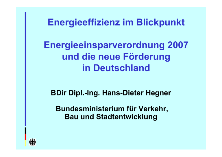 Energieeffizienz im Blickpunkt Energieeinsparverordnung 2007 und die neue Förderung in Deutschland BDir Dipl.-Ing. Hans-Dieter Hegner Bundesministerium für Verkehr, Bau und Stadtentwicklung BDir Dipl.-Ing. Hans-Dieter Hegner Bundesministerium für Verkehr, Bau und Stadtentwicklung Der Energiehunger wächst ca. + 60 % gegenüber 2003 BDir Dipl.-Ing. Hans-Dieter Hegner Bundesministerium für Verkehr, Bau und Stadtentwicklung Klimaschutzziele und Randbedingungen Ziele: • Internes Kyoto-Ziel im Bereich der privaten Haushalte: 120 Mio. t CO2 bis 2008/2012 • Weiterer Anstieg der Energiekosten um 30% bis zum Ende des Jahrzehnts • Umsetzung der EDL-RL (Endenergieeinsparung von 9% in 9 Jahren) • Umsetzung des Aktionsplans der EUKommission (Ziel Passivhäuser ab 2015) und der Festlegungen des nationalen Energiegipfels, die Energieproduktivität um 20% bis 2020 zu steigern Erschwerende Randbedingungen: • Entwicklung der priv. Haushalte von 38,8 Mio. (2005) auf 40 Mio. (2015) • Entwicklung der Gesamt-Wohnfläche von 3,13 Mrd. m² (2005) auf 3,3 Mrd. m² (2015) BDir Dipl.-Ing. Hans-Dieter Hegner Bundesministerium für Verkehr, Bau und Stadtentwicklung Der absolute Energieverbrauch sinkt nicht ! 10000 8000 6000 4000 2000 Gebäude private Haushalte GHD BDir Dipl.-Ing. Hans-Dieter Hegner Bundesministerium für Verkehr, Bau und Stadtentwicklung Verkehr 20 04 20 02 20 00 19 98 19 96 19 94 19 92 19 90 0 Industrie Entwicklung der Weltmarktpreise Preis in 2006 deutlich gestiegen BDir Dipl.-Ing. Hans-Dieter Hegner Bundesministerium für Verkehr, Bau und Stadtentwicklung Wärmepreis in Deutschland 2006: 6,8 ct/kWh 2005: 5,6 ct/kWh 2,7 ct/kWh BDir Dipl.-Ing. Hans-Dieter Hegner Bundesministerium für Verkehr, Bau und Stadtentwicklung Entwicklung der Kosten für das Wohnen 2000 – 2005 140 Nettokaltmieten, Wohnungsnebenkosten, Haushaltsenergie, Index 2000 = 100 Indexwerte 135 warme Nebenkosten 130 125 120 kalte Betriebskosten 115 110 105 Nettokaltmiete 100 95 90 2000 2001 2002 2003 BDir Dipl.-Ing. Hans-Dieter Hegner Bundesministerium für Verkehr, Bau und Stadtentwicklung 2004 2005 Quelle: Statistisches Bundesamt Variotec - Innovationstag 28.02.2007 Umsetzung der EU-Richtlinie über die Gesamtenergieeffizienz von Gebäuden Ansätze für die EnEV Neue Nachweis- und Berechnungsmethode für Nichtwohngebäude Energieausweise für Gebäude aller Art Chance auf höhere Niveaus BDir Dipl.-Ing. Hans-Dieter Hegner Bundesministerium für Verkehr, Bau und Stadtentwicklung Variotec - Innovationstag 28.02.2007 Umsetzung der EU-Richtlinie über die Gesamtenergieeffizienz von Gebäuden Ansätze für die EnEV Neue Nachweis- und Berechnungsmethode für Nichtwohngebäude Energieausweise für Gebäude aller Art Chance auf höhere Niveaus BDir Dipl.-Ing. Hans-Dieter Hegner Bundesministerium für Verkehr, Bau und Stadtentwicklung Entwicklung der rechtlichen Anforderungen an den Heizenergiebedarf in Deutschland EnEV 2008 (?) ? EnEV 2007 = EnEV 2002 Energieeinsparverordnung 70 3. Wärmeschutzverordnung 2. Wärmeschutzverordnung 1:1 – Umsetzung der EU -Richtlinie ab 2002 ab 1995 100 1984 - 1995 150 1. Wärmeschutzverordnung BDir Dipl.-Ing. Hans-Dieter Hegner Bundesministerium für Verkehr, Bau und Stadtentwicklung 200 ab 1978 in kWh/(m²a) Schwerpunkte der EU-Richtlinie 2002/91 – mit der EnEV 2002/2004 bereits erfüllt Richtlinie • • • • ganzheitlicher Ansatz für die energetische Bewertung von Gebäuden Festlegungen von nationalen energetischen Mindeststandards im Neubau Festlegungen von Standards im Bestandsbereich (Gebäude >1000 m² und bei entsprechenden Modernisierungsumfang) regelmäßige Inspektion von Heizkesseln (>20 kW), einmalige Inspektion von Heizungsanlagen >15a oder Beratungsprogramm Deutschland • Ganzheitlicher Ansatz über EnEVMethode im Wohnungsbau • § 3 / § 4 EnEV Anforderungsniveau für den Neubau § 8 / § 9 EnEV Nachrüstungsanforderungen und Anforderungen im Modernisierungsfall • • Kesselinspektion nach der 1. BImschV, Ersatzpflicht für Kessel vor 1978 nach EnEV, Dimensionierungsberechnung seit 1978 nach HeizAnlV, Beratungsprogramme BDir Dipl.-Ing. Hans-Dieter Hegner Bundesministerium für Verkehr, Bau und Stadtentwicklung Schwerpunkte der EU-Richtlinie 2002/91 – neue Anforderungen über die EnEV 2006 Richtlinie • • • • ganzheitlicher Ansatz für die energetische Bewertung regelmäßige Inspektion von Klimaanlagen (>12 kW) Energieausweise (bei Neubau, etappenweise Einführung auch im Bestand – mind. bei Neuvermietung, Verkauf) Energieausweise von öffentlichen Gebäuden müssen ausgehängt werden (Öffentliche Dienstleistung,> 1000 m², hoher Publikumsverkehr) -öffentl. Hand als Vorbild- Deutschland • • • • neuer Ansatz für Nichtwohngebäude notwendig bisher keine Pflichten, zukünftig Anf. an Mindeststandards, Inspektionspflicht bisher: § 13 EnEV Energieausweise bei Neubau und bei wesentlicher Änderung, im Bestand freiwillig möglich bisher keine Pflichten BDir Dipl.-Ing. Hans-Dieter Hegner Bundesministerium für Verkehr, Bau und Stadtentwicklung Rechtliche Umsetzung der EU-Richtlinie in Deutschland www.bmvbs.de Vorlage durch die neue BReg Referentenentw. vom 16.11.2006 EU-RL Gesamtenergieeffizienz 2. Gesetz zur Änd. EnEG v. 1.09.05 Ermächtigung f. Energieausweis Beschluss BT Veröffentlichung BGBl. I Nr.56 v. 07. Sept.05 Vöff. EnEV DIN V 18599 Materielle Regelungen für Anforderungen, Methoden, Energieausweise, Inspektionen Entwurf techRL Technische Richtlinien, Normen (z.B. vereinfachte Datenaufnahme, Energieverbrauchskennwerte), DIN V 18599 „Energetische Bewertung von Gebäuden“, DIN 4108-6, DIN 4701-10, Bbl.2 DIN 4108… BDir Dipl.-Ing. Hans-Dieter Hegner Bundesministerium für Verkehr, Bau und Stadtentwicklung Der Weg zur EnEV 2007 (Optimismus-Variante) • • • • • • 16.11.06 Referentenentwurf: Vorlage durch die Bundesregierung Dez. 06 Anhörung der „Verkehrskreise“ und der Länder Fortschreibung des Referentenentwurfs im Lic