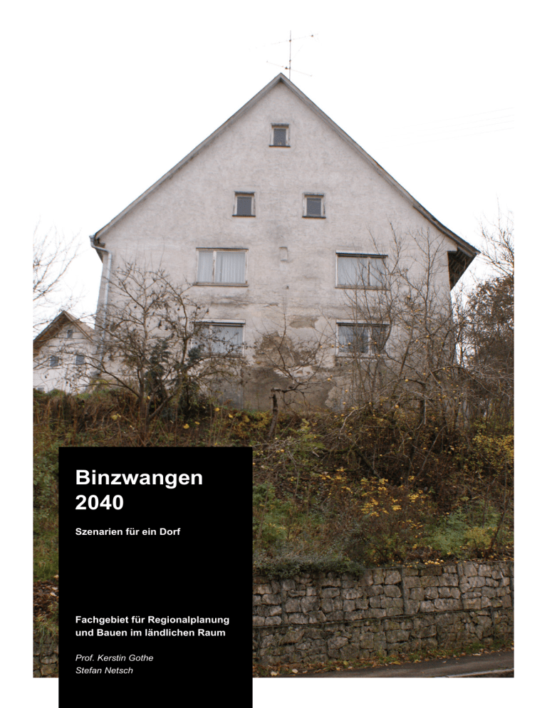 Binzwangen 2040 Szenarien für ein Dorf Fachgebiet für Regionalplanung und Bauen im ländlichen Raum Prof. Kerstin Gothe Stefan Netsch Binzwangen 2014 Szenarien für ein Dorf INHALT Grußwort 7 Vorwort 8 Binzwangen 2040 - Szenarien für ein Dorf Aufgabenstellung Szenarien 10 Szenariotechnik & -Workshop Beschreibung der Thematik Vorgehensweise & Ablauf 12 Szenarien für Binzwangen B&B Village Gesundschrumpfen Jetzt helfen wir uns selbst 16 22 26 Entwürfe für die Ortsmitte von Binzwangen 31 Aufgabenstellung Stegreif 32 Smart Village Ein moderner Ort, der „Dorf“ bleibt B&B Village 34 40 45 Anhang 50 Grußwort Herr Wolfgang Gaber, Ortsvorsteher Binzwangen Schon seit geraumer Zeit beschäftigen sich die Einwohner von Binzwangen intensiver mit der Zukunft ihrer Ortschaft. Als Modellort im Rahmen des Förderprogramms MELAP PLUS des Ministeriums Ländlicher Raum und Verbraucherschutz Baden-Württemberg wird seit 2010 die Weiterentwicklung von Binzwangen nicht nur mit den Bürgern diskutiert sondern auch tatkräftig umgesetzt. In der Bevölkerung ist das Bewusstsein herangewachsen, dass die zukünftigen Veränderungen aktiv begleitet werden müssen und nicht nur reagiert werden darf. In unterschiedlicher Ausprägung wurden und werden Handlungsfelder, Szenarien und mögliche Entwicklungen diskutiert. Mit dem Workshop „Binzwangen 2040“ und der anschließenden Präsentation durch die Architekturstudenten der Fakultät für Architektur KIT wurde ein weiterer Baustein für die Entwicklungsdiskussion der Bürgerschaft vorgestellt. Es war für uns alle spannend zu erleben und auch zu erfahren, wie die Ortschaft von „Außen“ gesehen wird. Nicht nur im Hinblick auf die Zukunft sondern auch wie der Ist-Zustand betrachtet und bewertet wird. Die in der Stegreifveranstaltung vorgestellten Zukunftsszenarien waren zwar für manchen Zuhörer eher utopisch, aber es regte das Nachdenken und die Diskussion über die Zukunft von Binzwangen an. Mancher Lösungsansatz mag auch Utopie bleiben, an- Im Heute über die Zukunft der ländlichen Gemeinden nachzudenken, um diese erhalten zu können, war und ist und bleibt uns immer aufgegeben! dere Punkte können durchaus in die weiteren Überlegungen einbezogen werden. Es wird spannend sein was in den nächsten Jahren sich in Binzwangen, unter Einbeziehung der Ergebnisse dieser Studentenarbeiten, verändern und weiterentwickeln wird. Ich danke Frau Prof. Gothe und ihren Studentinnen und Studenten für die Durchführung dieser Studie und die Erstellung dieser Broschüre. Ich hoffe, dass diese Broschüre den Leser dazu anregt, sich mit der Zukunft der eigenen Ortschaft bzw. Gemeinde näher zu befassen. Es gibt kein Allheilmittel zur Bewältigung der Herausforderungen, die der demographische Wandel mit sich bringt, es sollte aber auch keine Denkverbote für Zukunftsszenarien geben. Wenn jeder sich mit der Zukunft seines Ortes etwas beschäftigt und die Ideen, Vorschläge und Ergebnisse dann gemeinsam bearbeitet und umgesetzt werden, dann hat auch Binzwangen oder jeder andere Ort eine Zukunftsperspektive. 7 Vorwort Binzwangen 2040 - Szenarien für ein Dorf Prof. Kerstin Gothe Binzwangen 2040 - Szenarien für ein Dorf, hieß das Seminar und die auf den Ergebnissen aufbauende Stegreif- Aufgabe, die im Wintersemester 2013/ 14 von Studierenden der Architektur am KIT bearbeitet wurde. Die Ergebnisse werden in dieser Broschüre zusammengefasst. Sie sind als Anregung für Diskussionen gedacht, die in Dörfern allgemein in den kommenden Jahren zu erwarten sind. Wie könnte sich Binzwangen bis zum Jahr 2040 weiterentwickeln? Dies haben sieben Karlsruher Architektur Studierende (KIT) im November in einem Workshop gemeinsam mit einigen Binzwanger Bürgern und Ortsvorsteher Gaber diskutiert. Binzwangen als Dorf, als Lebensraum hat sich gravierend gewandelt in den vergangenen 30 Jahren – wie könnte es weitergehen? Vorher hatte die international zusammen gesetzte Studentengruppe zwei Tage lang gemeinsam mit Diplom Ingenieur Stefan Netsch den Ort erkundet und viele Gespräche mit den Bewohnerinnen und Bewohnern, bzw. Gewerbetreibenden geführt. Die Studierenden haben anschließend ihre Erkenntnisse geordnet und daraus drei unterschiedliche Szenarien entwickelt – mögliche Entwicklungspfade, die das Dorf gehen könnte - je nachdem wie in den nächsten Jahren die Weichen gestellt werden. Diese Szenarien wurden anschließend von den Studierenden ausgearbeitet und werden in dieser Broschüre vorgestellt. Das Fachgebiet Regionalplanung und Bauen im Ländlichen Raum hat dann – betreut von Diplom Ingenieur Philipp Dechow - eine Entwurfsübung formuliert: Für die drei innerörtlichen Blöcke zwischen der Römerstrasse und der Schulstrasse sollten auf diesen Szenarien aufbauend konkrete räumliche Visionen für das Jahr 2040 entwickelt werden. Die Studierenden sollten überlegen: Wer wohnt dann im Ortskern? In welchen Wohnformen? Was geschieht mit den alten Wohngebäuden? Was mit den Scheunen? Wie werden die Freiflächen genutzt? Wie wird die Mobilität organisiert? Was bedeutet das für das Ortsbild? Diese Fragestellungen wurden bewußt im Rahmen eines MELAP PLUS- Modelldorfes untersucht: hier geht es um Innenentwicklung, um „Neue Qualität im Ortskern“. Die Chance der Arbeiten von Studierenden besteht darin, dass sie sich frei machen können von Grundstücksgrenzen und anderen Zwängen. So entstehen keine morgen umsetzbaren Lösungen, aber Anregungen und Impulse für die Diskussion. sentiert. Die Gespräche danach waren lebhaft. Es wurden insgesamt fünf Entwürfe erstellt, wovon insgesamt drei in der vorliegenden Broschüre präsentiert werden. Wir danken der Gemeinde Ertingen und dem Ministerium für Ländlichen Raum und Verbraucherschutz in Baden Württemberg für die Unterstützung des Lehrprojektes und der Broschüre im Rahmen von MELAP PLUS. Wir danken den Bürgern von Binzwangen für ihr Interesse und ihre Unterstützung, insbeson- dere den Teilnehmern an dem Worksho