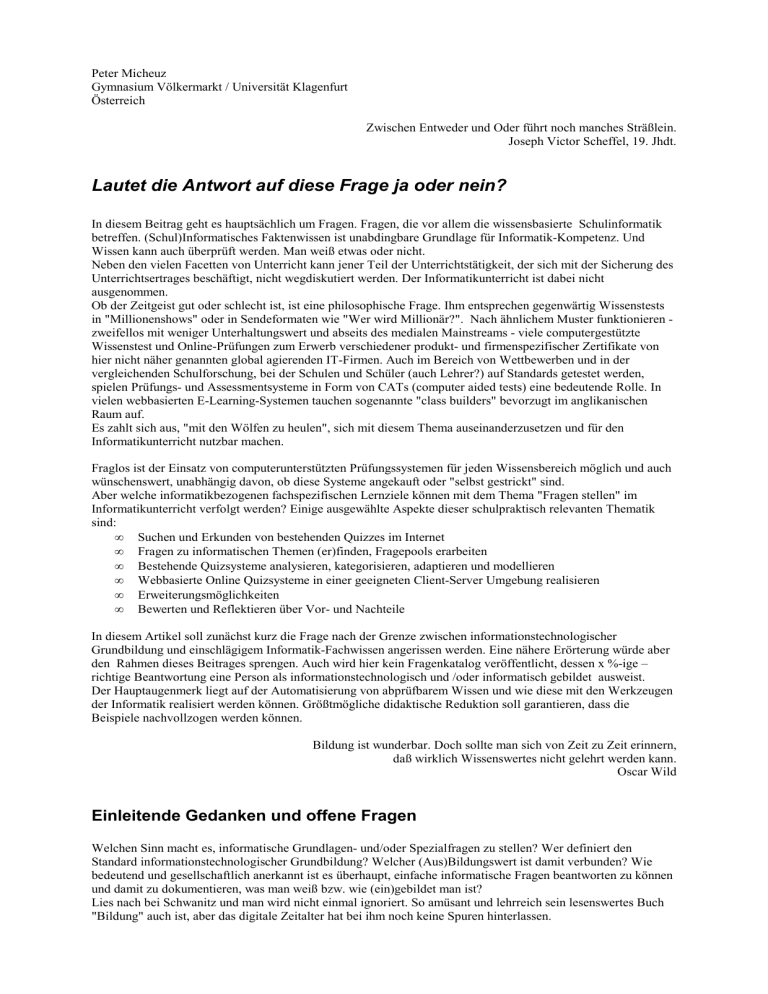 In diesem Beitrag geht es hauptsächlich um Fragen. Fragen, die vor allem die wissensbasierte Schulinformatik