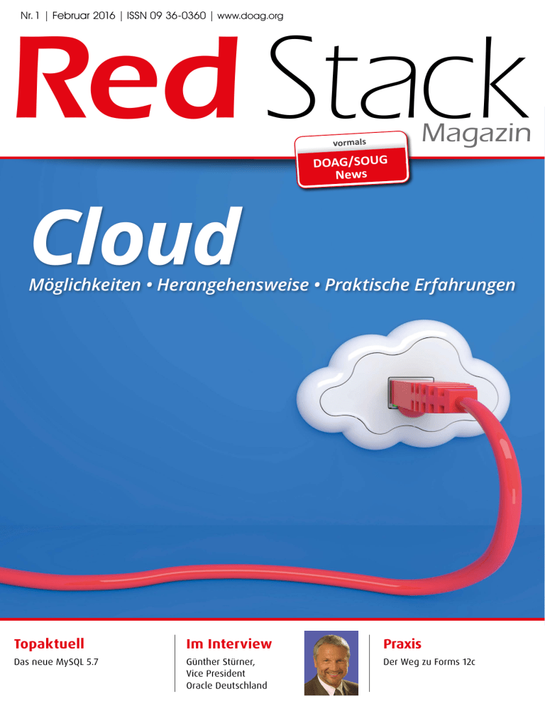 Red Stack Nr. 1 | Februar 2016 | ISSN 09 36-0360 | www.doag.org Magazin vormals DOAG/SOUG News Cloud Möglichkeiten • Herangehensweise • Praktische Erfahrungen Topaktuell Im Interview Praxis Das neue MySQL 5.7 Günther Stürner, Vice President Oracle Deutschland Der Weg zu Forms 12c Push a Button Move Your Database to the Oracle Cloud Same Database Same Standards Same Architecture … or Back to Your Data Center cloud.oracle.com/database or call 1.800.ORACLE.1 Copyright © 2015, Oracle and/or its affiliates. All rights reserved. Oracle and Java are registered trademarks of Oracle and/or its affiliates. Editorial Liebe Mitglieder, liebe Leserinnen und Leser, Klaus-Michael Hatzinger Präsident AOUG es freut mich ganz besonders, dass ich Sie als Präsident der Österreichischen Oracle User Gruppe (AOUG) im Namen meiner Vorstandskollegen zur Erstausgabe des Red Stack Magazin begrüßen darf – einer Gemeinschaftsproduktion der DOAG, SOUG und AOUG.. Die Kooperation zwischen der DOAG, SOUG und AOUG wird schon seit Jahren in vielen Bereichen erfolgreich gelebt und umso willkommener ist es für uns, dass wir ab jetzt auch bei der Produktion des neuen Red Stack Magazin länderübergreifend zusammenarbeiten und unseren Teil zu dieser seit vielen Jahren etablierten, sehr erfolgreichen Zeitschrift leisten können. Wir sehen einen klaren Mehrwert für unsere österreichischen Mitglieder, die sich ab jetzt über sechs gedruckte Ausgaben des Magazins pro Jahr mit zahlreichen Fachartikeln und Informationen freuen dürfen. Die hervorragende Resonanz auf eine im Herbst versandte Einladung an alle österreichischen Mitglieder zur DOAG/SOUG News hat uns in diesem Schritt klar bestätigt. Die Themen, Lösungen und Herausforderungen rund um Oracle-Technologien sind in allen Ländern gleich und so werden neben den Mitgliedern auch alle Werbe- und Businesspartner von diesem gemeinsamen Magazin und dem damit verbundenen internationalen Leserkreis profitieren. Ich möchte auf diesem Weg auch alle AOUG-Mitglieder herzlich dazu einladen, sich aktiv an der inhaltlichen Gestaltung des Magazins als Autor von Fachartikeln zu beteiligen. In diesem Sinne freue ich mich auf viele spannende, gemeinsame Ausgaben des Magazins. Ihr Red Stack Magazin 01/2016 3 Inhalt 12 Einleitung Aktuell 3Editorial 51 Neues in der Installation von Oracle 5Timeline 8 „Oracle wird alle Software-Produkte als Cloud-Services zur Verfügung stellen …“ Interview mit Günther Stürner, Vice President Server Technologies und Sales Consulting bei der ORACLE Deutschland B.V. & Co. KG. 56 Alle Wege führen zu Forms 12c Frank Hoffmann 63 Sicherheit und SQL in Silizium Franz Haberhauer 67 Was DBAs über das neue Oracle MySQL 5.7 wissen sollten Mario Beck und Carsten Thalheimer Die Anforderungen an heutige serviceorientierte Datenbank-Infrastrukturen sind vielfältig 26 Forms/Reports Jan-Peter Timmermann Cloud Entwicklung 12 Der Weg in serviceorientierte 72 SQL-Statements in der Praxis – weniger Datenbank-Infrastrukturen Dirk Franke und Peter Koch ist mehr Ernst Leber 18 DbaaS: Amazon AWS, Microsoft Azure und Oracle Cloud im Vergleich Gerhard Schön 23 Ich kann vor lauter Wolken meine Cloud-Lösung nicht sehen Malthe Griesel und Christian Trieb 26 Datenschutz in der Cloud – Die Cloud-Nutzung wächst – die Sicherheitsbedenken bremsen was wirklich (nicht) geht Stefan Kinnen 29 Kosteneffizient und ohne Risiko: Upgrade auf Oracle Database 12c mit dem Oracle Database Cloud Service Manuel Hoßfeld 46 33 Der Oracle Mobile Cloud Service Dr. Jürgen Menge 37­Hybrid Cloud Management mit Enterprise Manager Cloud Control Ralf Durben und Marcus Schröder IoT 42 Oracle Java Cloud Service aus der Sicht des Administrators Borys Neselovskyi SERVICE 46 Der IoT Cloud Service Marcel Amende und Dr. Nadine Schöne Das Internet der Dinge (IoT) ist einer der Megatrends dieser Tage 4 www.aoug.at • www.doag.org • www.soug.ch Intern 71 Neue Mitglieder 74 Impressum 74Termine 74 Inserentenverzeichnis Timeline 6. November 2015 16. November 2015 Mag. Dr. Thomas Petrik von Sphinx IT Consulting präsentiert in Wien im Rahmen eines Technischen Frühstücks der Austrian Oracle User Group die wichtigsten Vor- und Nachteile der Oracle VM gegenüber anderen Virtualisierungstechnologien. Er geht bei seinem Vortrag detailliert auf die Konzepte ein und zeigt, welche Rahmenbedingungen sich dabei günstig oder weniger günstig auswirken. Dreiundzwanzig Vertreter von achtzehn europäischen Anwendergruppen treffen sich auf Einladung der DOAG am Vortag der DOAG 2015 Konferenz + Ausstellung in Nürnberg zum User Group Leaders Forum @ DOAG Conference 2015. Ziel ist eine verbesserte Zusammenarbeit untereinander in Europa. Dazu zählen die Organisation gemeinsamer Veranstaltungen, der EOUC Newsletter, ein EOUC-E-Paper-Magazin, virtuelle Events sowie die Verbesserung der Zusammenarbeit mit Oracle. Auch die Oracle OpenWord und die EMEA OTN Tours 2016 sind ein Thema. 10.November 2015 Das zweite Treffen der SOUG Romandie im Jahr 2015 behandelt die Themen „Lizenzierung“ und „Oracle BI“. Noel Hémon von Nestlé präsentiert den Einsatz von Exalytics in einem multinationalen Unternehmen. Vermeidbares Ungemach ist ebenso spannend wie die vermittelten Best Practices. Lubomir Bobek von Oracle demonstriert die Feinheiten der Oracle-Lizenzierung und Benedikt Loret, Synchrotech, BI in der Cloud in der parallelen Session. Im zweiten Session-Paket zeigt Gregory Steulet, dbi services, was es im ESX-Umfeld für den Betrieb einer Oracle-Datenbank zu beachten gibt, während Eddie Fidel, Trivadis, die Methode „Data Vault für DWH“ zeigt. Im Gegensatz zur gut besuchten SIG über Performance im Mai ist die Teilnehmerzahl diesmal kleiner. Die User Group Leader aus achtzehn europäischen Ländern 17. November 2015 Der Vortrag stößt auf großes Interesse Der DOAG-Vorstandsvorsitzende Dr. Dietmar Neugebauer eröffnet die DOAG 2015 Konferenz + Ausstellung. Die größte OracleKonferenz in Europa er