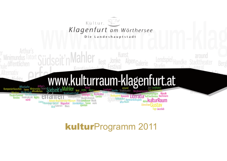 kulturProgramm 2011 Der Kultur Raum geben! Rund um die Uhr Kultur! Mit diesem Satz ist die Vielzahl kultureller Höhepunkte in Klagenfurt am treffendsten zu charakterisieren. Die Kulturabteilung der Landeshauptstadt präsentiert im Programmheft 2011 ein buntes, anspruchsvolles und abwechslungsreiches Jahr der Begegnung mit Kultur an allen Ecken und Enden der Stadt. Ob Kunst im öffentlichen Raum, Musik, Literatur, Theater, Tanzperformance, Ausstellungen, Installationen, Film, Klassik, Avantgarde, Kunsthandwerk, Brauchtum und Volkskultur – für jeden Geschmack hat unsere Kulturmetropole im Schnittpunkt dreier Kulturen etwas anzubieten. Mit neuen Veranstaltungsreihen und innovativen Kulturimpulsen setzt der kulturRaum Klagenfurt seine im Vorjahr begonnenen Aktivitäten fort. Zum music.pic.nic. im Kleinmayr-Garterl, music around the world in Minimundus, KulTourGenuss, Tatort Loretto u. a. kommen die Südseit‘n Blues Nights, kulturRaum spontan, Chill out im Schloss u.v.m. Ein besonderer Literaturschwerpunkt im heurigen Sommer mit Lesereisen auf den Spuren von Handke, Jonke und Bachmann, mit Literatur after work und dem dreisprachigen Literaturfest lesePLATZ in der Innenstadt macht den Auftakt zu den „35. Tagen der deutschsprachigen Literatur. Klagenfurt hat mit Peter Wawerzinek heuer wieder einen berühmten Stadtschreiber und vergibt Ateliers und Arbeitsstipendien für Paris und Šmartno. Im theater HALLE 11, der Klagenfurter Mittelbühne, kommen Freunde kritischen, zeitgenössischen Theaters auf ihre Rechnung, während der TheaterSommerKlagenfurt spritzige, einfallsreiche Sommertheaterkost anbietet. Zu erwähnen sind das Pilotprojekt für die Kreativwirtschaft Klagenfurt Office Surfer im Hafen 11, welches im Sommer startet und neue wirtschaftliche Impulse für die Stadt setzen soll, und das lend|spiel, die künstlerische Belebung des neu gestalteten Lendhafens. Die Stadtgalerie, das Living Studio und die Alpen-Adria-Galerie mit einem hochkarätigen Ausstellungsprogramm, das erweiterte Robert Musil Literatur Museum mit spannenden Lesereihen und neuen AutorInnen, das Bergbaumuseum mit einer Ausstellung zu Erdstrahlen und Wünschelruten, die Abteilung Brauchtum und Volkskultur mit Tanzen, Singen, Musizieren und internationaler Volkskultur, das Gustav Mahler Komponierhäuschen mit einer Sonderausstellung und einem Mahler-Schwerpunkt zum 150. Geburtstag des Komponisten: Das alles ist Kultur Klagenfurt – tagesaktuell nachzulesen am Kulturserver www.kulturraum-klagenfurt.at. Danken möchten wir den zahlreichen weiteren Kulturanbietern unserer Stadt, die auch in Zeiten knapper Kulturbudgets unermüdlich kulturelle Akzente setzen. Ein großes Dankeschön gilt den Sponsoren, die ein so reichhaltiges Programm ermöglichen und unseren Kooperationspartnern, die mit uns neue Wege gehen. Viel Freude und ein spannendes Jahr der Begegnung wünschen das Team der Kulturabteilung mit Manuela Tertschnig und Kulturreferent Vzbgm. Albert Gunzer! 2 willkommen – bienvenuti – dobrodošli – welcome kulturRaum Klagenfurt 14. Jänner bis Dezember 2011 27. Februar bis 9. Dezember 2011 heißt das kulturelle Überraschungspotpourri des kulturRaum Klagenfurt. Hochwertige Veranstaltungshäppchen ergeben sich manchmal spontan. Wir lassen sie uns nicht entgehen. Ein neuer Fixpunkt im kulturRaum Klagenfurt sind die Südseit’n Blues Nights. Für heißes Blues-Feeling sorgen Stars und Geheimtipps aus der internationalen Blues-Szene. Wir bringen den Blues nach Klagenfurt! kulturRaum SPONTAN 2.................................................Vorwort 3..........................kulturRaum Klagenfurt 15.................................theaterHALLE 11 16......................Stadtgalerie Klagenfurt 17......................................Living-Studio 17.......................................ARTurs Home 18........................Alpen-Adria-Galerie 18............Robert Musil Literatur Museum 20...............Bergbaumuseum Klagenfurt 21....Gustav Mahler Komponierhäuschen 22.................Volkskultur und Brauchtum 14. Jänner, 20 Uhr Ian Siegal & Mike Sponza Trio Ort: Jazz-Club Kammerlichtspiele Eintritt frei! Veranstalter: kulturRaum Klagenfurt 14. März, 20 Uhr Lesung mit Arno Geiger | Der alte König in seinem Exil Ort: theaterHALLE 11 Eintritt frei! kulturRaum Klagenfurt in Kooperation mit dem Musil-Institut und der Kleinen Zeitung. 21. Juni, 19.30 Uhr Danke Danzer | CHL plus Band und Ulli Bäer Ort: ((stereo)) Musikclub, Viktringer Ring, Klagenfurt Eintritt frei! kulturRaum Klagenfurt in Kooperation mit der CHL plus Band. Weitere Termine werden laufend ergänzt und am Kulturserver angekündigt: www.kulturraum-klagenfurt.at. Südseit’n Blues Nights 27. Februar Big Pete Pearson & The Gamblers (USA / ITA) 11. März Latvian Blues Band (Lettland) 8. April Thanx (AT / SLO) 27. Mai Brian Lee Power Blues Band (USA) 10. Juni Paolo Mizzau & The Dr. Love Band (ITA) 14. Oktober Bugs Henderson & The Shuffle Kings (USA) 11. November D BON Blues Band (AT / CRO) 9. Dezember The Norman Baker Band (UK) Ort: Blues- und Jazzclub Kamot Beginn: 20.30 Uhr Eintritt: € 14,00 Karten / Reservierungen: [email protected], Bahnhofstraße 9, 0676 / 562 56 55, www.kamot.at kulturRaum Klagenfurt in Kooperation mit Miki Milan (No Stress Brothers) und dem Blues- und Jazzclub Kamot. 3 11. März bis 8. November 2011 Ausschreibungen 13. April bis 31. August 2011 Thrilling Nights mit Literatur und Musik Anspruchsvolle Lesespannung mit MeisterInnen des literarischen Krimi-Genres präsentiert der kulturRaum Klagenfurt im idyllischen Ambiente des Schlosses Loretto. Live-Bands untermalen die Leseabende mit Tatort-Musik. Künstlerateliers und Arbeitsstipendien Neue künstlerische Impulse bei Sonnenuntergang beleben ab Frühling 2011 mittwochs die Klagenfurter Ostbucht des Wörthersees. Hochkarätige MusikerInnen des Konservatoriums inspirieren mit ihren Jazz-, Blues- und Soul-Interpretationen und laden zum Zuhören und Entspannen auf die Terrasse des Sc