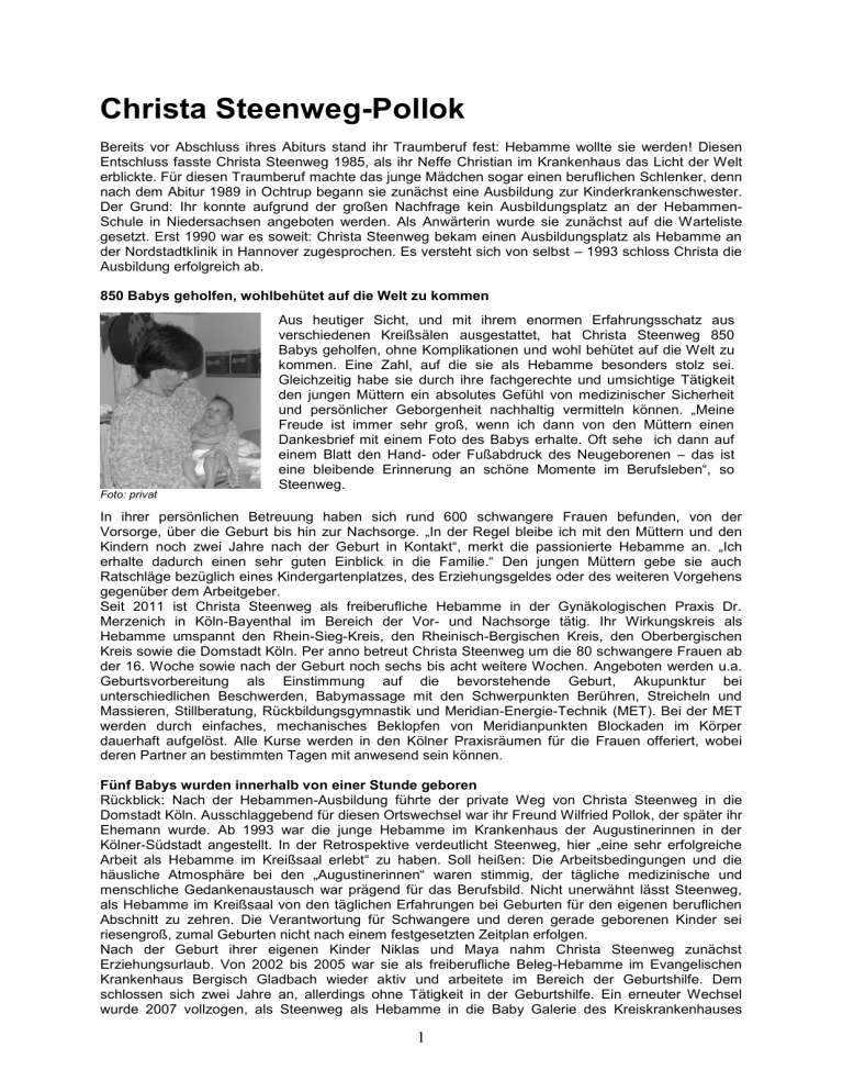 Christa Steenweg-Pollok Bereits vor Abschluss ihres Abiturs stand ihr Traumberuf fest: Hebamme wollte sie werden! Diesen Entschluss fasste Christa Steenweg 1985, als ihr Neffe Christian im Krankenhaus das Licht der Welt erblickte. Für diesen Traumberuf machte das junge Mädchen sogar einen beruflichen Schlenker, denn nach dem Abitur 1989 in Ochtrup begann sie zunächst eine Ausbildung zur Kinderkrankenschwester. Der Grund: Ihr konnte aufgrund der großen Nachfrage kein Ausbildungsplatz an der HebammenSchule in Niedersachsen angeboten werden. Als Anwärterin wurde sie zunächst auf die Warteliste gesetzt. Erst 1990 war es soweit: Christa Steenweg bekam einen Ausbildungsplatz als Hebamme an der Nordstadtklinik in Hannover zugesprochen. Es versteht sich von selbst – 1993 schloss Christa die Ausbildung erfolgreich ab. 850 Babys geholfen, wohlbehütet auf die Welt zu kommen Foto: privat Aus heutiger Sicht, und mit ihrem enormen Erfahrungsschatz aus verschiedenen Kreißsälen ausgestattet, hat Christa Steenweg 850 Babys geholfen, ohne Komplikationen und wohl behütet auf die Welt zu kommen. Eine Zahl, auf die sie als Hebamme besonders stolz sei. Gleichzeitig habe sie durch ihre fachgerechte und umsichtige Tätigkeit den jungen Müttern ein absolutes Gefühl von medizinischer Sicherheit und persönlicher Geborgenheit nachhaltig vermitteln können. „Meine Freude ist immer sehr groß, wenn ich dann von den Müttern einen Dankesbrief mit einem Foto des Babys erhalte. Oft sehe ich dann auf einem Blatt den Hand- oder Fußabdruck des Neugeborenen – das ist eine bleibende Erinnerung an schöne Momente im Berufsleben“, so Steenweg. In ihrer persönlichen Betreuung haben sich rund 600 schwangere Frauen befunden, von der Vorsorge, über die Geburt bis hin zur Nachsorge. „In der Regel bleibe ich mit den Müttern und den Kindern noch zwei Jahre nach der Geburt in Kontakt“, merkt die passionierte Hebamme an. „Ich erhalte dadurch einen sehr guten Einblick in die Familie.“ Den jungen Müttern gebe sie auch Ratschläge bezüglich eines Kindergartenplatzes, des Erziehungsgeldes oder des weiteren Vorgehens gegenüber dem Arbeitgeber. Seit 2011 ist Christa Steenweg als freiberufliche Hebamme in der Gynäkologischen Praxis Dr. Merzenich in Köln-Bayenthal im Bereich der Vor- und Nachsorge tätig. Ihr Wirkungskreis als Hebamme umspannt den Rhein-Sieg-Kreis, den Rheinisch-Bergischen Kreis, den Oberbergischen Kreis sowie die Domstadt Köln. Per anno betreut Christa Steenweg um die 80 schwangere Frauen ab der 16. Woche sowie nach der Geburt noch sechs bis acht weitere Wochen. Angeboten werden u.a. Geburtsvorbereitung als Einstimmung auf die bevorstehende Geburt, Akupunktur bei unterschiedlichen Beschwerden, Babymassage mit den Schwerpunkten Berühren, Streicheln und Massieren, Stillberatung, Rückbildungsgymnastik und Meridian-Energie-Technik (MET). Bei der MET werden durch einfaches, mechanisches Beklopfen von Meridianpunkten Blockaden im Körper dauerhaft aufgelöst. Alle Kurse werden in den Kölner Praxisräumen für die Frauen offeriert, wobei deren Partner an bestimmten Tagen mit anwesend sein können. Fünf Babys wurden innerhalb von einer Stunde geboren Rückblick: Nach der Hebammen-Ausbildung führte der private Weg von Christa Steenweg in die Domstadt Köln. Ausschlaggebend für diesen Ortswechsel war ihr Freund Wilfried Pollok, der später ihr Ehemann wurde. Ab 1993 war die junge Hebamme im Krankenhaus der Augustinerinnen in der Kölner-Südstadt angestellt. In der Retrospektive verdeutlicht Steenweg, hier „eine sehr erfolgreiche Arbeit als Hebamme im Kreißsaal erlebt“ zu haben. Soll heißen: Die Arbeitsbedingungen und die häusliche Atmosphäre bei den „Augustinerinnen“ waren stimmig, der tägliche medizinische und menschliche Gedankenaustausch war prägend für das Berufsbild. Nicht unerwähnt lässt Steenweg, als Hebamme im Kreißsaal von den täglichen Erfahrungen bei Geburten für den eigenen beruflichen Abschnitt zu zehren. Die Verantwortung für Schwangere und deren gerade geborenen Kinder sei riesengroß, zumal Geburten nicht nach einem festgesetzten Zeitplan erfolgen. Nach der Geburt ihrer eigenen Kinder Niklas und Maya nahm Christa Steenweg zunächst Erziehungsurlaub. Von 2002 bis 2005 war sie als freiberufliche Beleg-Hebamme im Evangelischen Krankenhaus Bergisch Gladbach wieder aktiv und arbeitete im Bereich der Geburtshilfe. Dem schlossen sich zwei Jahre an, allerdings ohne Tätigkeit in der Geburtshilfe. Ein erneuter Wechsel wurde 2007 vollzogen, als Steenweg als Hebamme in die Baby Galerie des Kreiskrankenhauses 1 Gummersbach in das Angestelltenverhältnis wechselte. Sie erinnert sich: Es waren drei Kreißsäle vorhanden. Ich befand mich mit einer Kollegin im Nachtdienst. Neun Geburten standen an. Und dann passierte es: Fünf Babys wurden innerhalb von einer Stunde geboren – und wir waren beide allein. Wir rannten von Kreißsaal zu Kreißsaal, aber wir haben es geschafft. Es versteht sich von selbst: Die Aufräumarbeiten werden natürlich von den Hebammen abgewickelt! Und genau hier geschah es 2010: Steenweg, die engagierte Hebamme erkannte, unter derartigen Arbeitsbedingungen nicht auf Dauer arbeiten zu können. Im Gespräch verriet sie sehr wenig. Dennoch: Das oft zitierte gespannte Verhältnis zwischen Ärzten und Hebammen sei ein gravierender Grund für sie gewesen, ihr berufliches Arbeitsverhältnis zu überdenken. Für Hebammen, so formuliert sie, sei es immer wichtig gewesen: Eine Hebamme MUSS im Kreißsaal sein, ein Arzt nicht unbedingt! Ihr Entschluss war folgerichtig: Seit 2011 arbeitet Christa Steenweg wieder als freiberufliche Hebamme in einer Kölner Praxis. Mit Christa Steenweg-Pollok im Gespräch: Ist der Kaiserschnitt bei vielen Frauen eine „Modeerscheinung“? Manche wünschen sich diesen, damit das Kind am Tag-X auf die Welt kommt. Nach Schätzungen der Weltgesundheitsorganisation (WHO) läge die Geburtenrate durch Kaiserschnitt zwischen 5 und 18 
