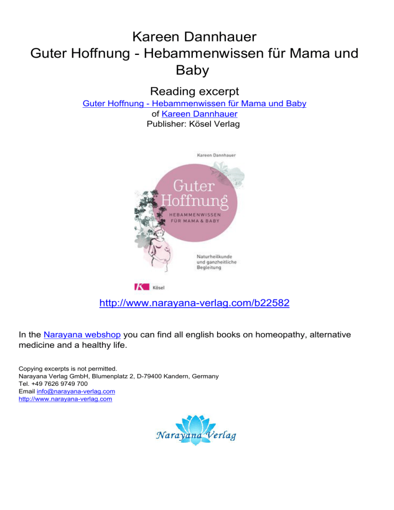 Kareen Dannhauer Guter Hoffnung - Hebammenwissen für Mama und Baby Reading excerpt Guter Hoffnung - Hebammenwissen für Mama und Baby of Kareen Dannhauer Publisher: Kösel Verlag http://www.narayana-verlag.com/b22582 In the Narayana webshop you can find all english books on homeopathy, alternative medicine and a healthy life. Copying excerpts is not permitted. Narayana Verlag GmbH, Blumenplatz 2, D-79400 Kandern, Germany Tel. +49 7626 9749 700 Email [email protected] http://www.narayana-verlag.com Kareen Dannhauer Guter Hoffnung HEBAMMENWISSEN FÜR MAMA & BABY Meinen Töchtern Liebe muss dabei sein. Ohne Liebe sind wir bestenfalls geschickt. Frederick Leboyer Kareen Dannhauer Guter Hoffnung HEBAMMENWISSEN FÜR MAMA & BABY Naturheilkunde und ganzheitliche Begleitung Kösel Wichtiger Hinweis Alle Behandlungsvorschläge, Hinweise, Ratschläge und Übungen in diesem Buch sind von der Autorin sorgfältig geprüft worden. Sie ersetzen jedoch nicht die persönliche Begleitung und Abklärung durch behandelnde Hebammen oder Geburtsmediziner. Im Zweifelsfall, bei akuten Ereignissen wie Schmerzen, Blutungen oder deutlichen Symptomen, die Sie beunruhigen und die Sie nicht einordnen können, bei Vorerkrankungen oder bestehender Erkrankung muss für eine konkrete Diagnose und entsprechende Behandlung stets ein Arzt oder eine Ärztin aufgesucht werden. Eine Haftung vonseiten der Autorin oder des Verlags wird ausdrücklich ausgeschlossen. Der Kösel-Verlag weist ausdrücklich darauf hin, dass im Text enthaltene externe Links vom Verlag nur bis zum Zeitpunkt der Buchveröffentlichung eingesehen werden konnten. Auf spätere Veränderungen hat der Verlag keinerlei Einfluss. Eine Haftung des Verlags für externe Links ist stets ausgeschlossen. 40 Wochen Infos & mehr im wöchentlichen Newsletter auf into-life.de Verlagsgruppe Random House FSC® N001967 Copyright © 2017 Kösel-Verlag, München, in der Verlagsgruppe Random House GmbH, Neumarkter Straße 28, 81673 München Umschlag: Weiss Werkstatt, München, nach einem Entwurf von Tanja Maus Umschlagmotiv und Innenillustrationen: Claudia Meitert Lektorat: Melanie Hartmann Grafisches Konzept: Tanja Maus Gestaltung: Veronika Preisler Satz: Uhl + Massopust, Aalen Druck und Bindung: Alföldi Druckerei AG, Debrecen Printed in Hungary ISBN 978-3-466-31076-0 www.koesel.de Dieses Buch ist auch als E-Book erhältlich. INHALT Vorwort . . . . . . . . . . . . . . . . . . . . . . . . . . . . . . . 11 Einleitung und Gebrauchsanweisung für dieses Buch . . . . . . . . . . . . . . . . . . . . . . . . . . . . 13 FRÜHE SCHWANGERSCHAFT . . . . . . . . . . . . . . . . . . . . . . . . . . . . . . . . . . . . . . . . . . . . . 22 01 Das erste Drittel . . . . . . . . . . . . . . . . . . . . . . . . . . . . . . . . . . . . . . . . . . . . . . . . . . . . . . . . . . . . . . . . . . . 22 Frühe Zeichen einer Schwangerschaft . . . . . 25 Müdigkeit . . . . . . . . . . . . . . . . . . . . . . . . . . . . . 62 Eine Schwangerschaft feststellen . . . . . . . . . . 28 Etwas anderes als Müdigkeit . . . . . . . . . . . . . . 63 Ein Geheimnis? . . . . . . . . . . . . . . . . . . . . . . . . . 29 Und wenn es zwei sind? . . . . . . . . . . . . . . . . . . 30 Informationen sammeln . . . . . . . . . . . . . . . . . 30 Kreislaufbeschwerden . . . . . . . . . . . . . . . . . . . Rosmarin . . . . . . . . . . . . . . . . . . . . . . . . . . . . . Zitrone . . . . . . . . . . . . . . . . . . . . . . . . . . . . . . 64 65 66 Eine Hebamme finden . . . . . . . . . . . . . . . . . . . 31 Ultraschall: Wozu ist der da? . . . . . . . . . . . . . . 34 Stimmung . . . . . . . . . . . . . . . . . . . . . . . . . . . . . Walnut – Die Selbstverwirklichungsblüte . . . . . . . 66 67 Verunsicherung und Entscheidungen . . . . . Cerato – Die Intuitionsblüte . . . . . . . . . . . . . . . 35 36 Schwanger über 35 . . . . . . . . . . . . . . . . . . . . . . 37 Blutungen und drohende Fehlgeburt . . . . . . Homöopathie bei Blutungen . . . . . . . . . . . . . . . . Frauenmantel . . . . . . . . . . . . . . . . . . . . . . . . . . 68 70 71 Pränatale Diagnostik . . . . . . . . . . . . . . . . . . . . 38 Ein Ort für die Geburt . . . . . . . . . . . . . . . . . . . 42 Verhaltene Fehlgeburt – Missed Abortion . . Natrium muriaticum . . . . . . . . . . . . . . . . . . . . . 72 75 Infektionen über das Essen . . . . . . . . . . . . . . . 45 Kaffee, Alkohol und andere Genussgifte . . . 49 Nach einer Fehlgeburt . . . . . . . . . . . . . . . . . . . Gundelrebe . . . . . . . . . . . . . . . . . . . . . . . . . . . . 77 79 Schwangerschaftstee . . . . . . . . . . . . . . . . . . . . 50 Wenn du mal krank bist . . . . . . . . . . . . . . . . . 80 Das Leben drum herum und weitere Do’s und Don’ts . . . . . . . . . . . . . . . . . . . . . . . . . . . . . Medikamente in der Schwangerschaft . . . . . 85 51 Körperliche Veränderungen . . . . . . . . . . . . . . 52 Übelkeit . . . . . . . . . . . . . . . . . . . . . . . . . . . . . . . Ingwer . . . . . . . . . . . . . . . . . . . . . . . . . . . . . . . Nux vomica . . . . . . . . . . . . . . . . . . . . . . . . . . . Sepia . . . . . . . . . . . . . . . . . . . . . . . . . . . . . . . . 54 58 59 60 MITTENDRIN IN DER SCHWANGERSCHAFT . . . . . . . . . . . . . . . . . . . . . . . . . . . . . . 86 02 Das zweite Drittel . . . . . . . . . . . . . . . . . . . . . . . . . . . . . . . . . . . . . . . . . . . . . . . . . . . . . . . . . . . . . . . . 86 Die Phase des Wohlgefühls . . . . . . . . . . . . . . . 88 Schlaflosigkeit und Unruhezustände . . . . . . 101 Kindsbewegungen . . . . . . . . . . . . . . . . . . . . . . 89 Restless Legs . . . . . . . . . . . . . . . . . . . . . . . . . . . 105 Veränderung von Haut und Haar . . . . . . . . . 90 Wadenkrämpfe . . . . . . . . . . . . . . . . . . . . . . . . . 106 Schwangerschaftsstreifen . . . . . . . . . . . . . . . . 91 Trockene, geschwollene Nase . . . . . . . . . . . . 93 Depressionen . . . . . . . . . . . . . . . . . . . . . . . . . . . 