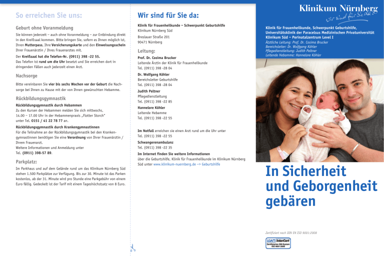 So erreichen Sie uns: Wir sind für Sie da: Geburt ohne Voranmeldung Klinik für Frauenheilkunde – Schwerpunkt Geburtshilfe Klinikum Nürnberg Süd Sie können jederzeit – auch ohne Voranmeldung – zur Entbindung direkt in den Kreißsaal kommen. Bitte bringen Sie, sofern es Ihnen möglich ist, Ihren Mutterpass, Ihre Versicherungskarte und den Einweisungsschein Ihrer Frauenärztin / Ihres Frauenarztes mit. Breslauer Straße 201 90471 Nürnberg Leitung: Der Kreißsaal hat die Telefon-Nr. (0911) 398 -22 55. Das Telefon ist rund um die Uhr besetzt und Sie erreichen dort in dringenden Fällen auch jederzeit einen Arzt. Prof. Dr. Cosima Brucker Leitende Ärztin der Klinik für Frauenheilkunde Tel. (0911) 398 -28 04 Nachsorge Dr. Wolfgang Köhler Bereichsleiter Geburtshilfe Tel. (0911) 398 -28 04 Bitte vereinbaren Sie vier bis sechs Wochen vor der Geburt die Nachsorge bei Ihnen zu Hause mit der von Ihnen gewünschten Hebamme. Rückbildungsgymnastik Rückbildungsgymnastik durch Hebammen Zu den Kursen der Hebammen melden Sie sich mittwochs, 14.00 – 17.00 Uhr in der Hebammenpraxis „Flotter Storch“ unter Tel. 0151 / 41 22 78 77 an. Rückbildungsgymnastik durch Krankengymnastinnen Für die Teilnahme an der Rückbildungsgymnastik bei den Krankengymnastinnen benötigen Sie eine Verordnung von Ihrer Frauenärztin / Ihrem Frauenarzt. Weitere Informationen und Anmeldung unter Tel. (0911) 398-57 89. Parkplatz: Im Parkhaus und auf dem Gelände rund um das Klinikum Nürnberg Süd stehen 1.500 Parkplätze zur Verfügung. Bis zur 30. Minute ist das Parken kostenlos, ab der 31. Minute wird pro Stunde eine Parkgebühr von einem Euro fällig. Gedeckelt ist der Tarif mit einem Tageshöchstsatz von 8 Euro. Klinikum Nürnberg Klinik für Frauenheilkunde, Schwerpunkt Geburtshilfe, Universitätsklinik der Paracelsus Medizinischen Privatuniversität Klinikum Süd – Perinatalzentrum Level I Ätztliche Leitung: Prof. Dr. Cosima Brucker Bereichsleiter: Dr. Wolfgang Köhler Pflegedienstleitung: Judith Peltner Leitende Hebamme: Hannelore Köhler Judith Peltner Pflegedienstleitung Tel. (0911) 398 -22 85 Hannelore Köhler Leitende Hebamme Tel. (0911) 398 -22 55 Im Notfall erreichen sie einen Arzt rund um die Uhr unter Tel. (0911) 398 -22 55 Schwangerenambulanz Tel. (0911) 398 -22 35 Im Internet finden Sie weitere Informationen über die Geburtshilfe, Klinik für Frauenheilkunde im Klinikum Nürnberg Süd unter www.klinikum-nuernberg.de –> Geburtshilfe In Sicherheit und Geborgenheit gebären Zertifiziert nach DIN EN ISO 9001:2008 9 von über 60 Mitarbeiterinnen und Mitarbeitern des Geburtshilfeteams Liebe Leserin, lieber Leser, Vor der Geburt als „werdende Eltern“ stehen auch Sie vor der Entscheidung „Krankenhaus – ja oder nein?“ Die meisten Frauen wünschen sich heute eine natürliche Geburt in einer Atmosphäre, die dem außergewöhnlichen und privaten Ereignis entspricht. Wir unterstützen Sie dabei. Wir gehen so weit wie möglich auf Ihre individuellen Wünsche ein und helfen Ihnen in den ersten Tagen nach der Geburt. Wir bieten eine angenehm ruhige Umgebung und die Sicherheit einer optimal ausgestatteten Geburtsklinik. Damit Sie sich wohl und geborgen fühlen können. Lernen Sie uns kennen! Am besten bei unserem Informationsabend, in der Regel auch mit Besichtigung des Kreißsaals. Ein erfahrenes Geburtshilfe-Team beantwortet alle Ihre Fragen rund um die Geburt. Sie bekommen einen Eindruck von der Klinik, können sich den Kreißsaal und die Wochenstation anschauen und sehen, in welcher Umgebung Sie Ihr Kind zur Welt bringen werden. Der Informationsabend beginnt jeden Mittwoch um 18 Uhr vor dem Kreißsaal. Eine Anmeldung ist nicht erforderlich. Werdende Mütter, die zur Geburt ins Krankenhaus gehen, wollen vor allem eins: In Sicherheit und Geborgenheit gebären. Wenn Sie wollen, begleiten wir Sie bei allem, was rund um die Geburt für Sie und Ihr Kind notwendig und gut ist – aus medizinischer, pflegerischer und Ihrer Sicht. Die Geburtshilfe im Klinikum Nürnberg Süd bietet das gesamte Betreuungsangebot zu Schwangerschaft, Geburt und Wochenbett an. Sie können den ganzen Weg mit uns gehen oder nur einige gemeinsame Schritte wählen. Ihr Geburtshilfe-Team PS: Alle Telefon-Nummern, Adressen, Termine etc. sind am Ende des Prospekts übersichtlich für Sie zusammengestellt. 1 Vor der Geburt Vor der Geburt Geburtsvorbereitungskurs Schwangerenambulanz Die Geburt eines Kindes ist ein ganz besonderes Ereignis. Nicht nur beim ersten Kind. Neben vielen Veränderungen, die ganz unterschiedlich sein können, gibt es vieles, was von den werdenden Eltern in der Vorbereitung auf die Geburt auf ähnliche oder sogar gleiche Weise erlebt wird. In unseren Geburtsvorbereitungskursen haben werdende Mütter bzw. Eltern Gelegenheit, sich gemeinsam in Theorie und Praxis mit dem bevorstehenden Ereignis zu beschäftigen. Zur Vorsorge entsprechend den Mutterschaftsrichtlinien gehört die Vorstellung zur Geburt in der Klinik, die Sie für Ihre Entbindung gewählt haben. Planen Sie diesen Termin rechtzeitig, etwa zwei bis vier Wochen vor der Geburt, ein. Jeder unserer Kurse wird von einer Hebamme geleitet, die folgende Themen ausführlich behandelt: Schwangerschaft und Geburt einschließlich Gebärpositionen Entspannungs- und Atemtechniken Spezielle Schwangerschaftsgymnastik Das Neugeborene Stillen, Bonding und Wochenbett Wir, die Ärztinnen/Ärzte und Hebammen im Klinikum Nürnberg Süd, nehmen uns für diesen Beratungs- und Untersuchungstermin so viel Zeit wie nötig, um auf Ihre Wünsche einzugehen. Wir führen eine geburtshilfliche Untersuchung und Ultraschalldiagnostik durch. Wir beantworten alle Fragen zur Geburt und klären Sie u. a. über Möglichkeiten der Schmerztherapie auf. Darüber hinaus bieten wir eine spezielle Betreuung bei Risikoschwangerschaften an. Wir begleiten alle Arten von Risikoschwangerschaften wie z. B. Mehrlinge oder Beckenendlage (Steißlage). Auch für schwangere Diabetikerinnen oder Schwangere
