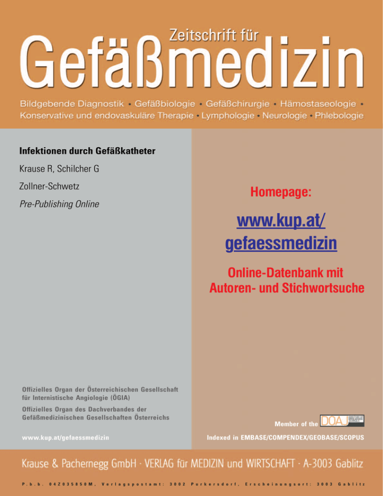Infektionen durch Gefäßkatheter Krause R, Schilcher G Zollner-Schwetz Homepage: Pre-Publishing Online www.kup.at/ gefaessmedizin Online-Datenbank mit Autoren- und Stichwortsuche Offizielles Organ der Österreichischen Gesellschaft für Internistische Angiologie (ÖGIA) Offizielles Organ des Dachverbandes der Gefäßmedizinischen Gesellschaften Österreichs Member of the www.kup.at/gefaessmedizin P . b . b . 0 4 Z 0 3 5 8 5 0 M , V e r l a g s p o s t a m t : Indexed in EMBASE/COMPENDEX/GEOBASE/SCOPUS 3 0 0 2 P u r k e r s d o r f , E r s c h e i n u n g s o r t : 3 0 0 3 G a b l i t z NEUES AUS DEM VERLAG Abo-Aktion 2016 Wenn Sie Arzt sind, in Ausbildung zu einem ärztlichen Beruf, oder im Gesundheitsbereich tätig, haben Sie die Möglichkeit, die elektronische Ausgabe dieser Zeitschrift kostenlos zu beziehen. Die Lieferung umfasst 4–6 Ausgaben pro Jahr zzgl. allfälliger Sonderhefte. Das e-Journal steht als PDF-Datei (ca. 5–10 MB) zur Verfügung und ist auf den meisten der marktüblichen e-Book-Readern, Tablets sowie auf iPad funktionsfähig. P 聺 Bestellung kostenloses e-Journal-Abo Besuchen Sie unsere zeitschriftenübergreifende Datenbank 聺 Artikeldatenbank Die meistgelesenen Artikel: P Journal für Kardiologie P Journal für Hypertonie P Zeitschrift für Gefäßmedizin P P P 聺 Bilddatenbank 聺 Fallberichte Infektionen durch Gefäßkatheter* R. Krause1, G. Schilcher2, I. Zollner-Schwetz1 Kurzfassung: In dieser Übersicht werden die für die klinische Praxis relevanten Informationen zu Gefäßkatheterinfektionen wie Definitionen, Epidemiologie, Klinik, Diagnostik, Therapie und Prävention zusammengefasst. Schlüsselwörter: Sepsis, Bakteriämie, Fungämie, Zentralvenenkatheter Abstract: Catheter-related Infections. In this review clinically relevant issues targeting catheter-related infections including definitions, epide- Definitionen Gefäßkatheter-assoziierte Infektionen sind lokale oder systemische Infektionen, die durch Bakterien oder Pilze ausgehend von einem Gefäßkatheter ausgelöst werden. In der englischsprachigen Literatur werden Gefäßkatheter-assoziierte Infektionen als „catheter-related infection“ (CRI) oder „catheter-related bloodstream infection“ (CRBSI) bezeichnet, wobei unter CRI oft lokale und systemische Infektionen subsumiert werden und CRBSI fast ausschließlich für Zentralvenenkatheterassoziierte Bakteriämien/Fungämien verwendet wird [1, 2]. Da für den englischen Begriff der „bloodstream infection“ keine passende deutsche Übersetzung vorhanden ist, wird dieser Begriff mit Bakteriämie/Fungämie (siehe unten) übersetzt, wobei hiermit der Nachweis von Bakterien und/oder Pilzen im Blut plus klinische Zeichen und Symptome verstanden werden. Die extraluminale Oberfläche des Gefäßkatheters ist die äußere Oberfläche des Katheters, die intraluminale Oberfläche ist die innere Oberfläche des Katheters. Aufgrund des Verlaufs des Gefäßkatheters und der Lage im Patienten wird der Katheter in intravaskuläre (der im Gefäß liegende Katheteranteil), intrakorporale extravaskuläre (der im Haut-Weichgewebe liegende Katheteranteil) und extrakorporale (der außerhalb des Körpers liegende Katheteranteil) Kompartimente unterteilt. Gefäßkatheter werden in peripher und zentral liegende Katheter unterteilt, wobei manche Katheter peripher implantiert werden, die Spitze jedoch zentral liegt [3]. Nachfolgend sind die derzeit verwendeten von der IDSA (Infectious Diseases Society of America) veröffentlichten Definitionen aufgelistet [3]: 1.) Katheter-Kolonisation „Signifikantes“ Wachstum von einem oder mehreren Mikroorganismen in einer semi- oder quantitativen Kultur einer Katheterspitze, eines kutanen Kathetersegments oder vom Katheteransatzstück. * Gekürzte Version aus: Krause R, et al. Gefäßkatheter-assoziierte Infektionen. WiKliWo Education 2015; 1–2: 29–43. Nachdruck mit freundlicher Genehmigung der Springer-Verlag GmbH, Wien. Eingelangt am 12. Juni 2015; angenommen am 15. Juni 2015; Pre-Publishing Online am 18. Februar 2016 Aus der 1Sektion Infektiologie und Tropenmedizin, und der 2Intensivstation, Universitätsklinik für Innere Medizin (UKIM), Medizinische Universität Graz Korrespondenzadresse: Univ.-Prof. Dr. Robert Krause, Sektion Infektiologie und Tropenmedizin, Universitätsklinik für Innere Medizin (UKIM), Medizinische Universität Graz. A-8036 Graz, Auenbruggerplatz 15; E-Mail: [email protected] miology, clinical presentation, diagnostic procedures, therapy and prevention are summarized. Z Gefäßmed 2016; 13 (Pre-Publishing Online). Key words: sepsis, bacteremia, fungemia, central-venous catheter 2.) Phlebitis Verhärtung oder Überwärmung, Rötung, Schmerzhaftigkeit oder Druckschmerzhaftigkeit entlang einer katheterisierten oder kürzlich zurückliegend katheterisierten Vene. 3.) Lokalinfektion („exit site infection“) Mikrobiologische Definition: Nachweis von Mikroorganismen von lokalem Exsudat ohne oder mit Bakteriämie/Fungämie (mit Bakteriämie/Fungämie würde dies einer Lokalinfektion plus CRBSI entsprechen). Klinische Definition: Rötung, Verhärtung und/oder Druckschmerzhaftigkeit innerhalb von 2 cm rund um die KatheterInsertionsstelle; dies kann mit anderen Zeichen und Symptomen einer Infektion wie Fieber oder Eitersekretion von der Katheter-Insertionsstelle verbunden sein, ohne oder mit begleitender Bakteriämie/Fungämie (mit Bakteriämie/Fungämie würde dies einer Lokalinfektion plus CRBSI entsprechen). 4.) Tunnelinfektion Druckschmerzhaftigkeit, Rötung und/oder Verhärtung mit Ausdehnung > 2 cm von der Kathetereinstichstelle entlang des subkutanen Tunnels eines tunnelierten Katheters (z. B. Hickman), ohne oder mit Bakteriämie/Fungämie (mit Bakteriämie/Fungämie würde dies einer Tunnelinfektion plus CRBSI entsprechen). 5.) Tascheninfektion Haut-Weichteilinfektion der subkutanen Tasche eines totalimplantierten Kathetersystems (Port), meist assoziiert mit Druckschmerzhaftigkeit, Rötung und/ode
